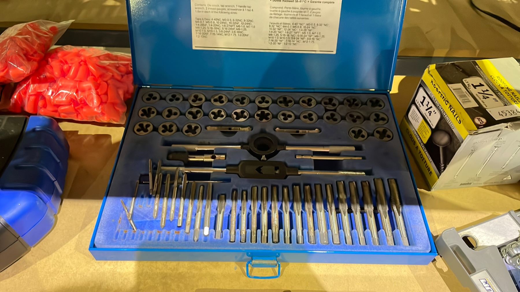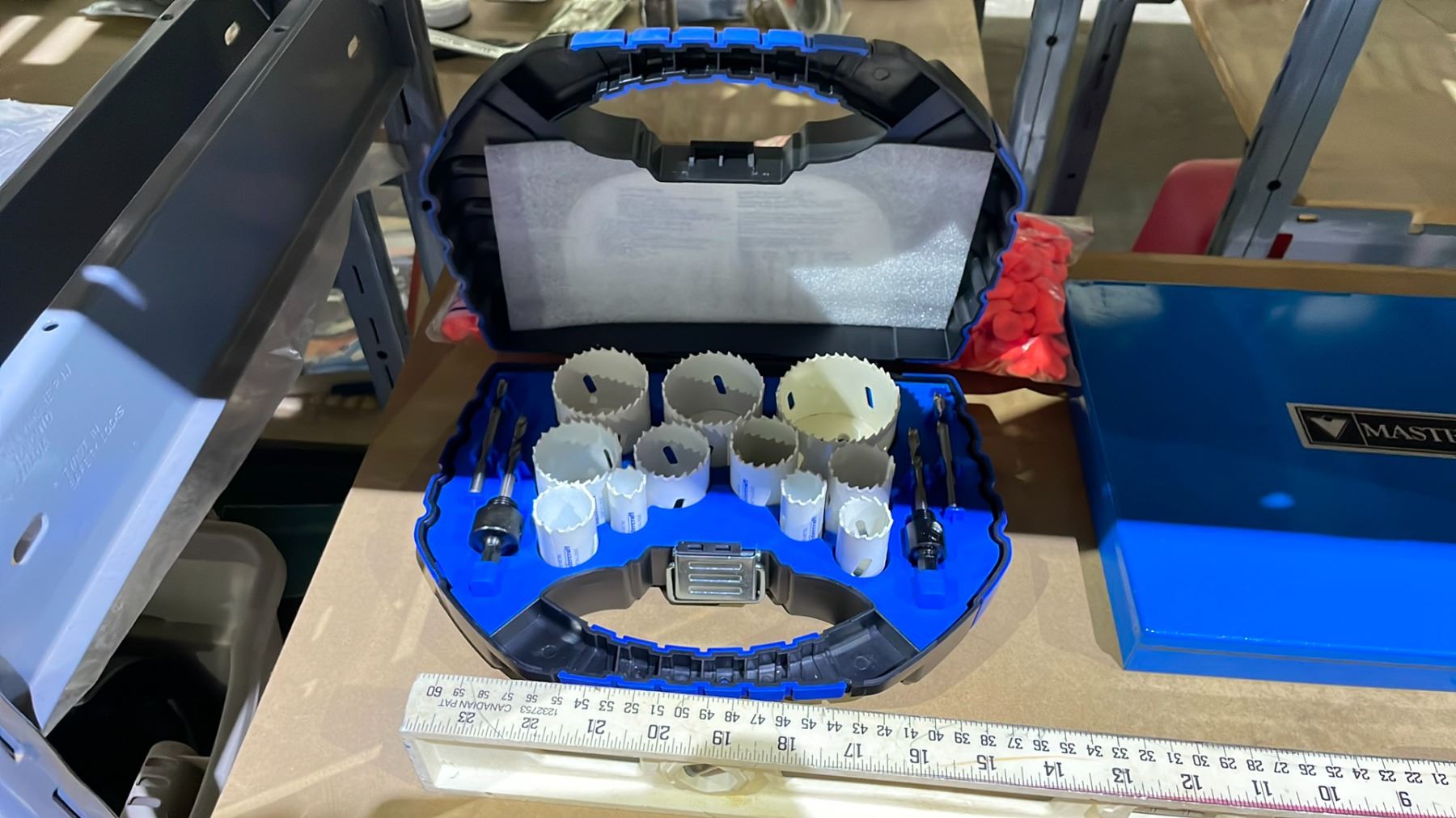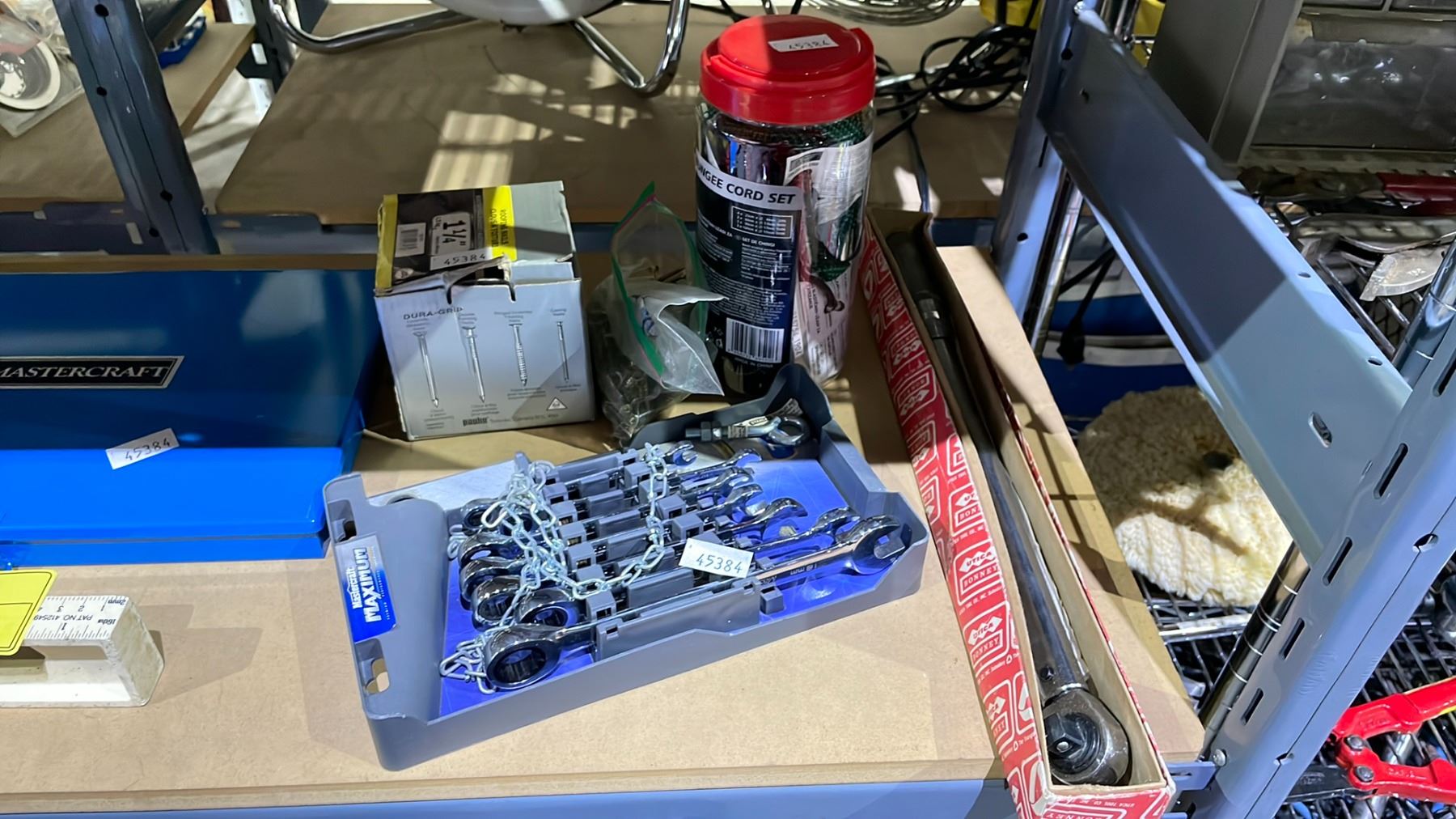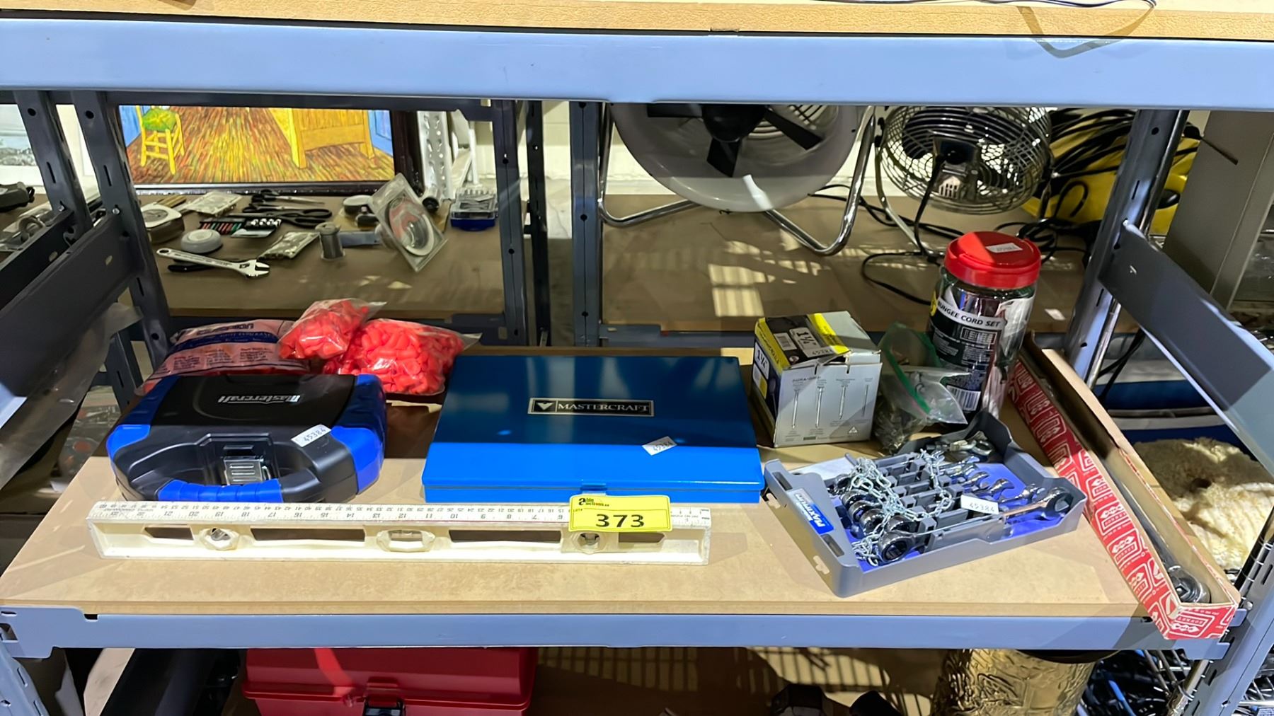 SHELF OF ASSORTED ITEMS INCLUDING; LEVEL, MASTERCRAFT BIT SET, WRENCH SET & MORE