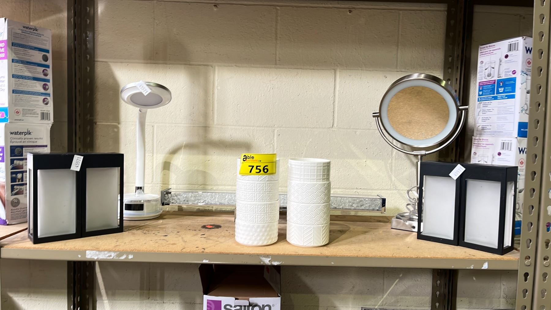 SHELF OF ASSORTED ITEMS INCLUDING; LIGHTING, MAKEUP MIRROR & CERAMIC CANDY BOWLS (UNKNOWN WORKING CONDITION, MAY BE MISSING PIECES)