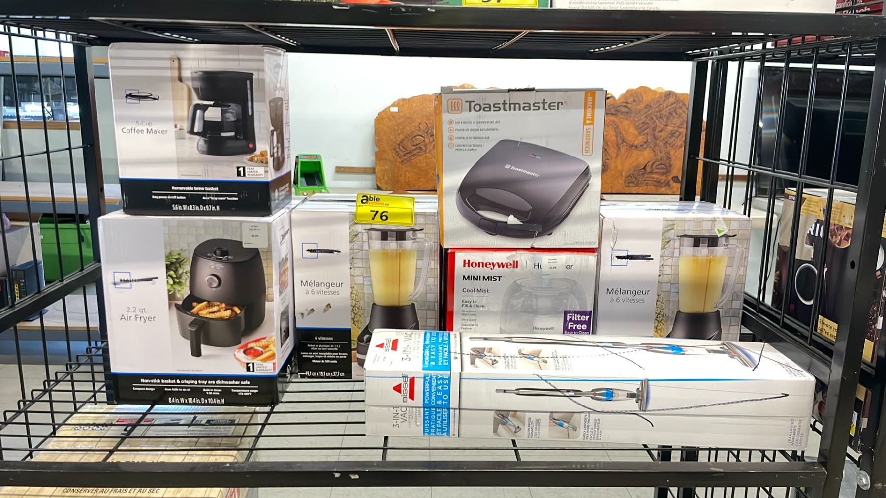 SHELF OF ASSORTED ITEMS INCLUDING; MAINSTAYS 5-CUP COFFEE MAKER, BISSELL 3-IN-1 VAC, MAINSTAYS 6-SPEED BLENDER & MORE