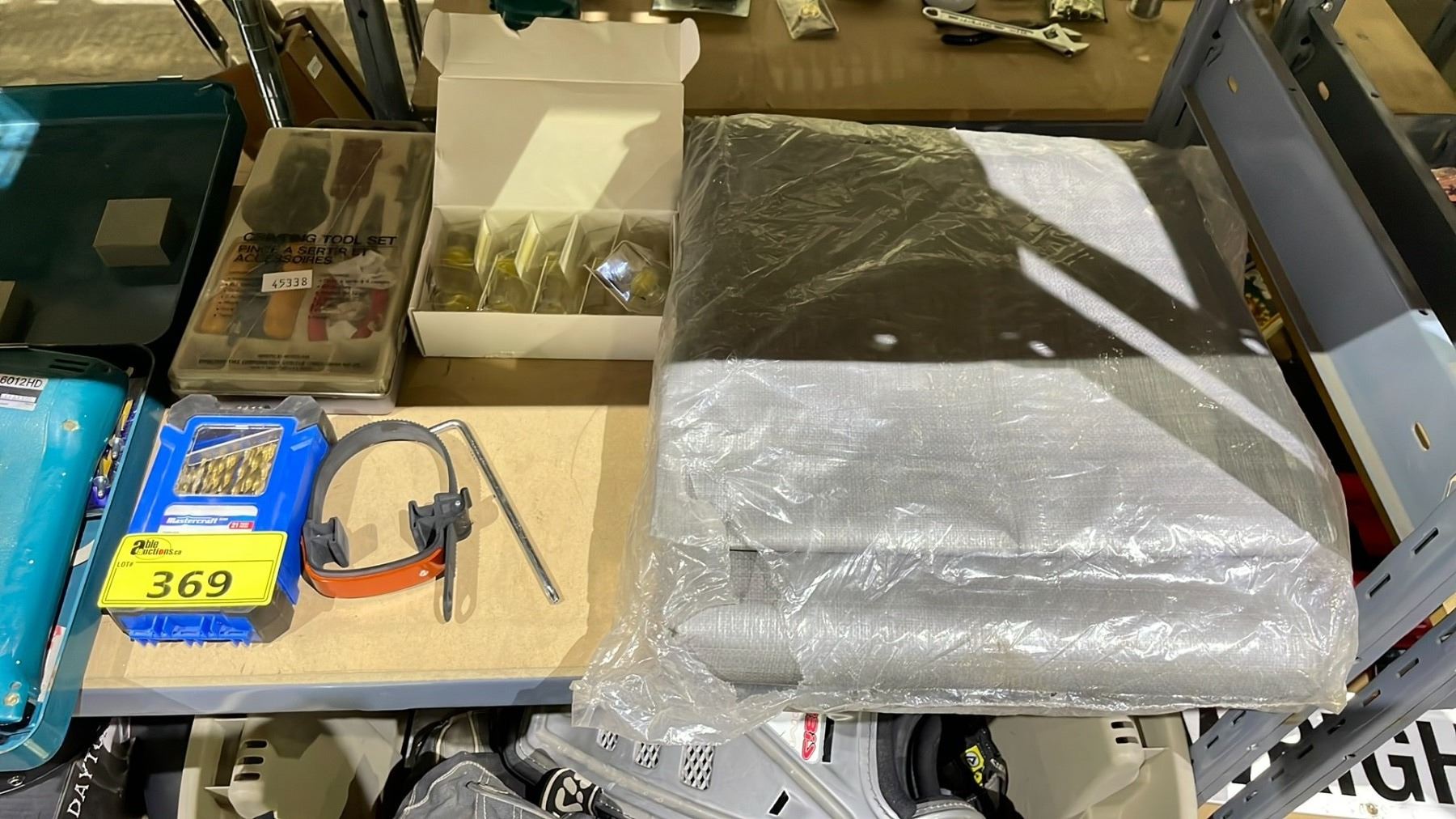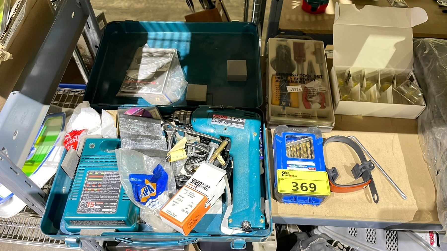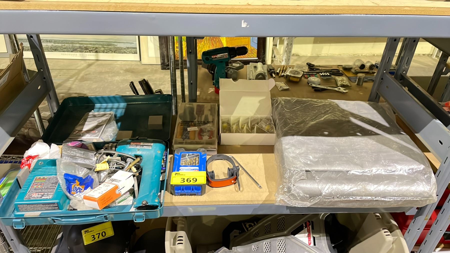 SHELF OF ASSORTED ITEMS INCLUDING; MAKITA CORDLESS DRILL, DRILL BIT SET, CRIMPING TOOL SET & MORE