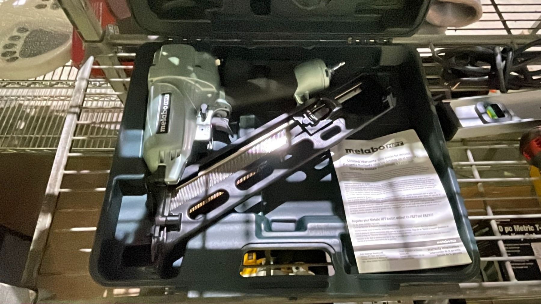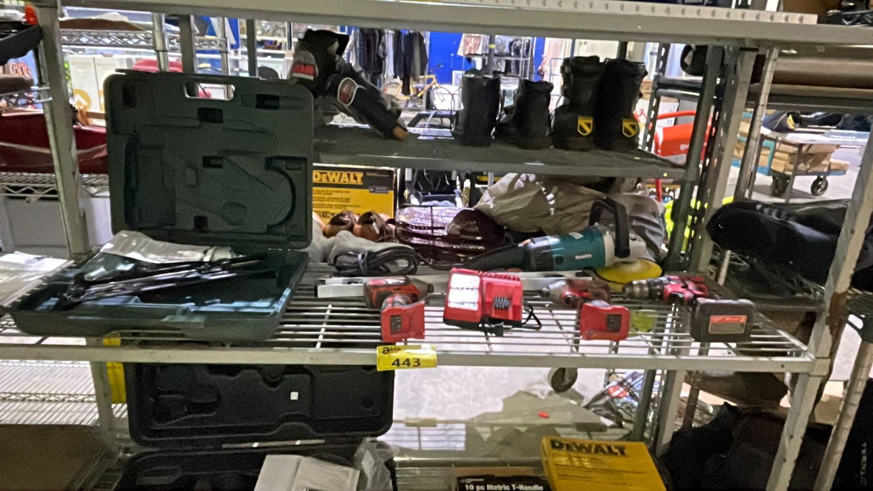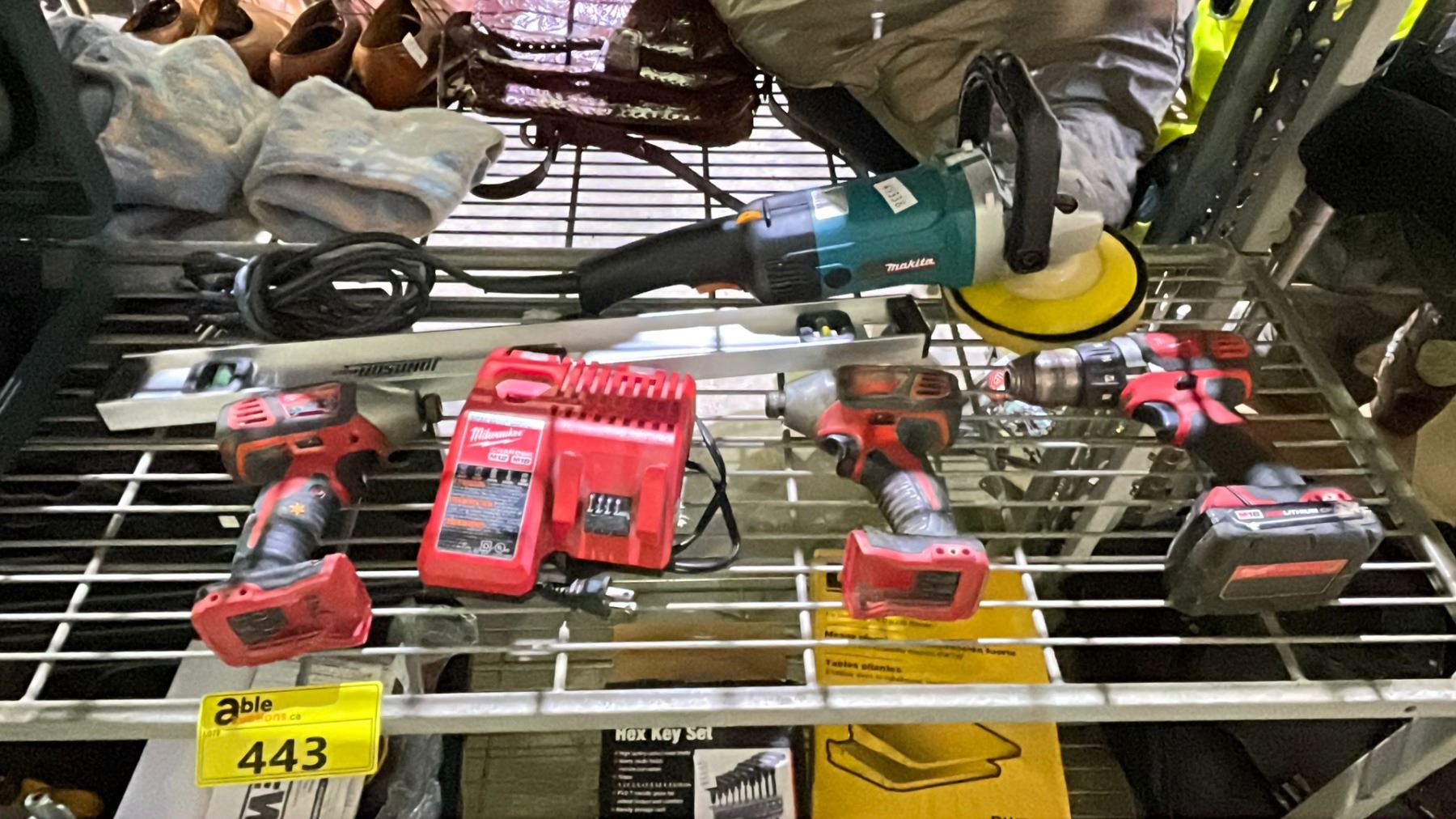 SHELF OF ASSORTED ITEMS INCLUDING; MAKITA WOOL BONNET SANDING DISC, MILWAUKEE CORDLESS DRILLS WITH BATTERY & CHARGER, LEVEL & NAILER