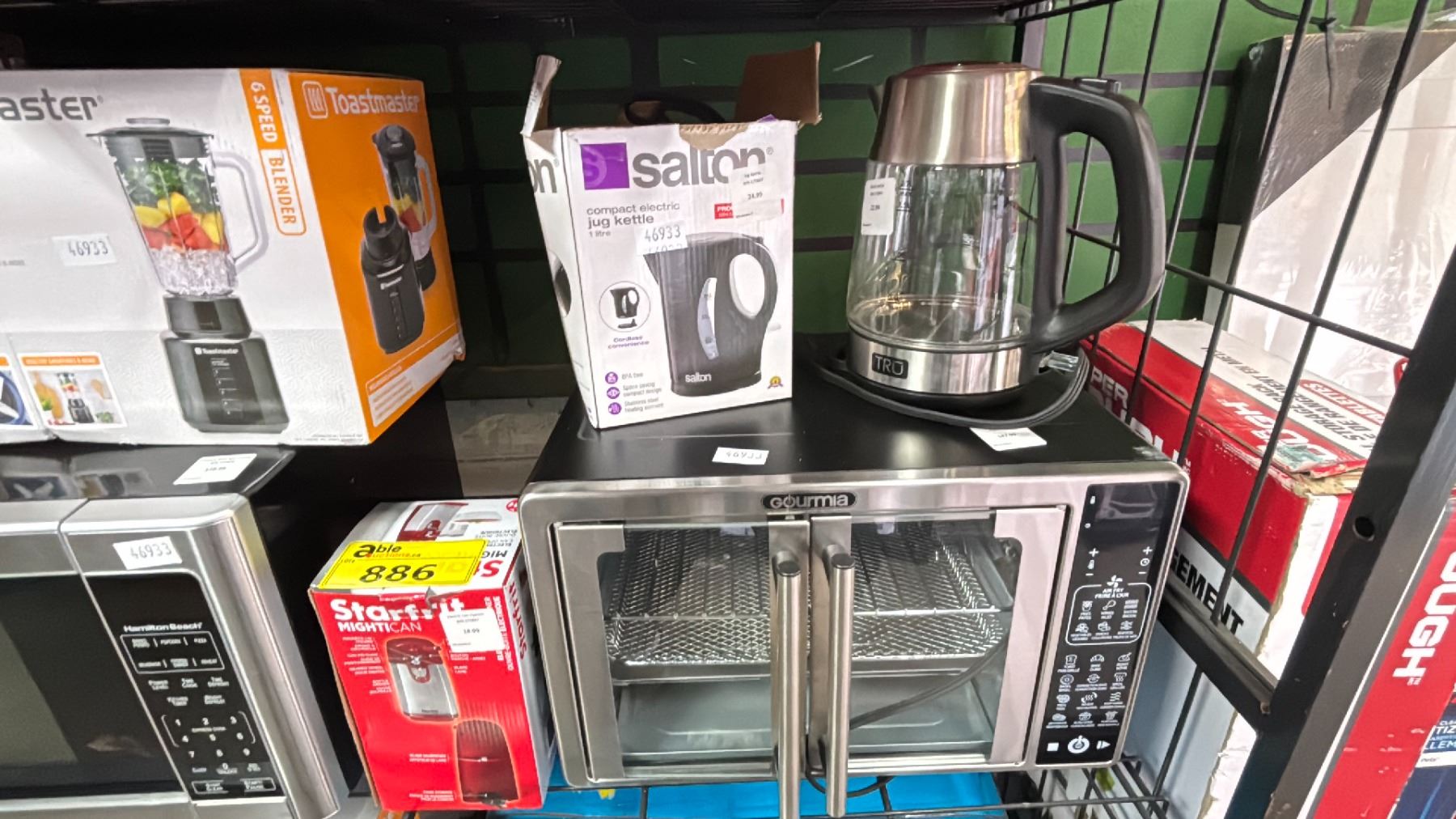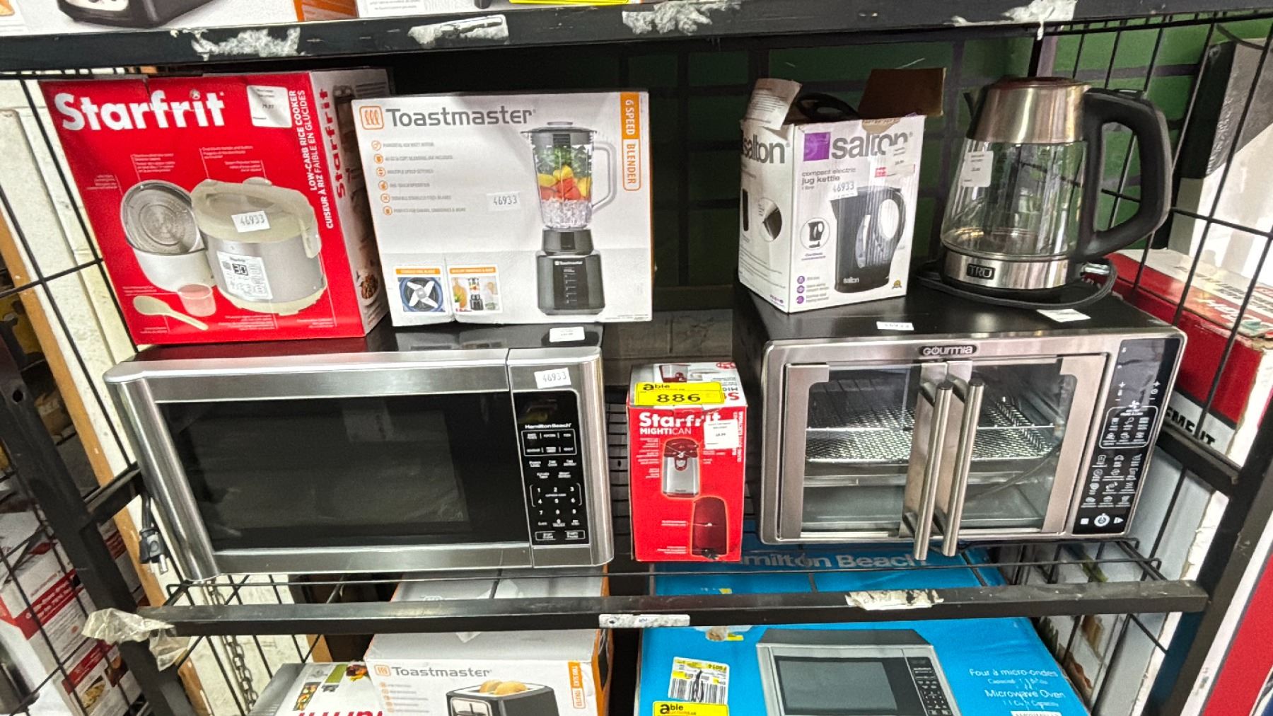 SHELF OF ASSORTED ITEMS INCLUDING; MICROWAVE OVEN, GOURMIA AIR FRYER OVEN, LOW-CARB RICE COOKER & MORE