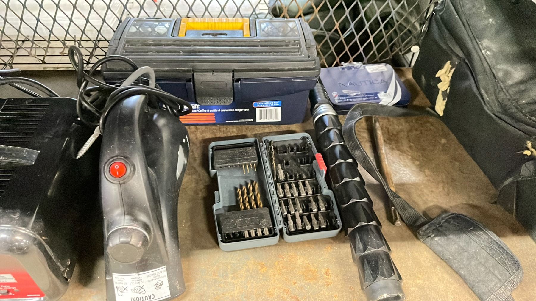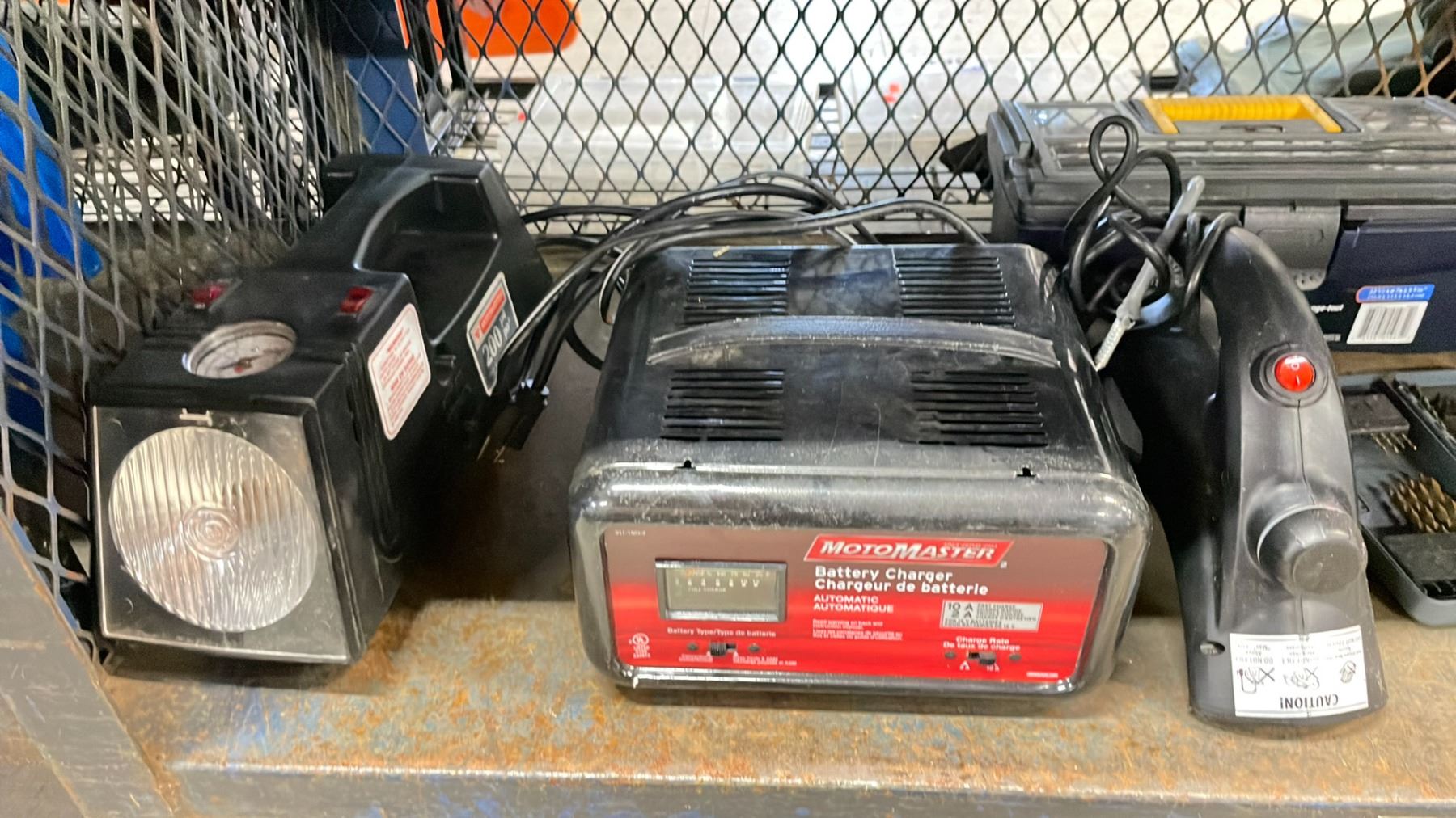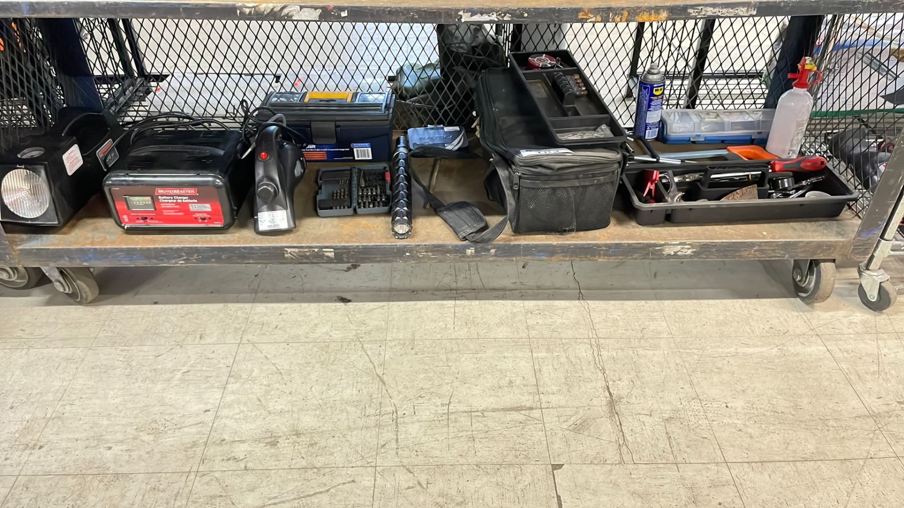 SHELF OF ASSORTED ITEMS INCLUDING; MOTOMASTER BATTERY CHARGER, TOOLBOXES WITH CONTENTS, LIGHTS & MORE