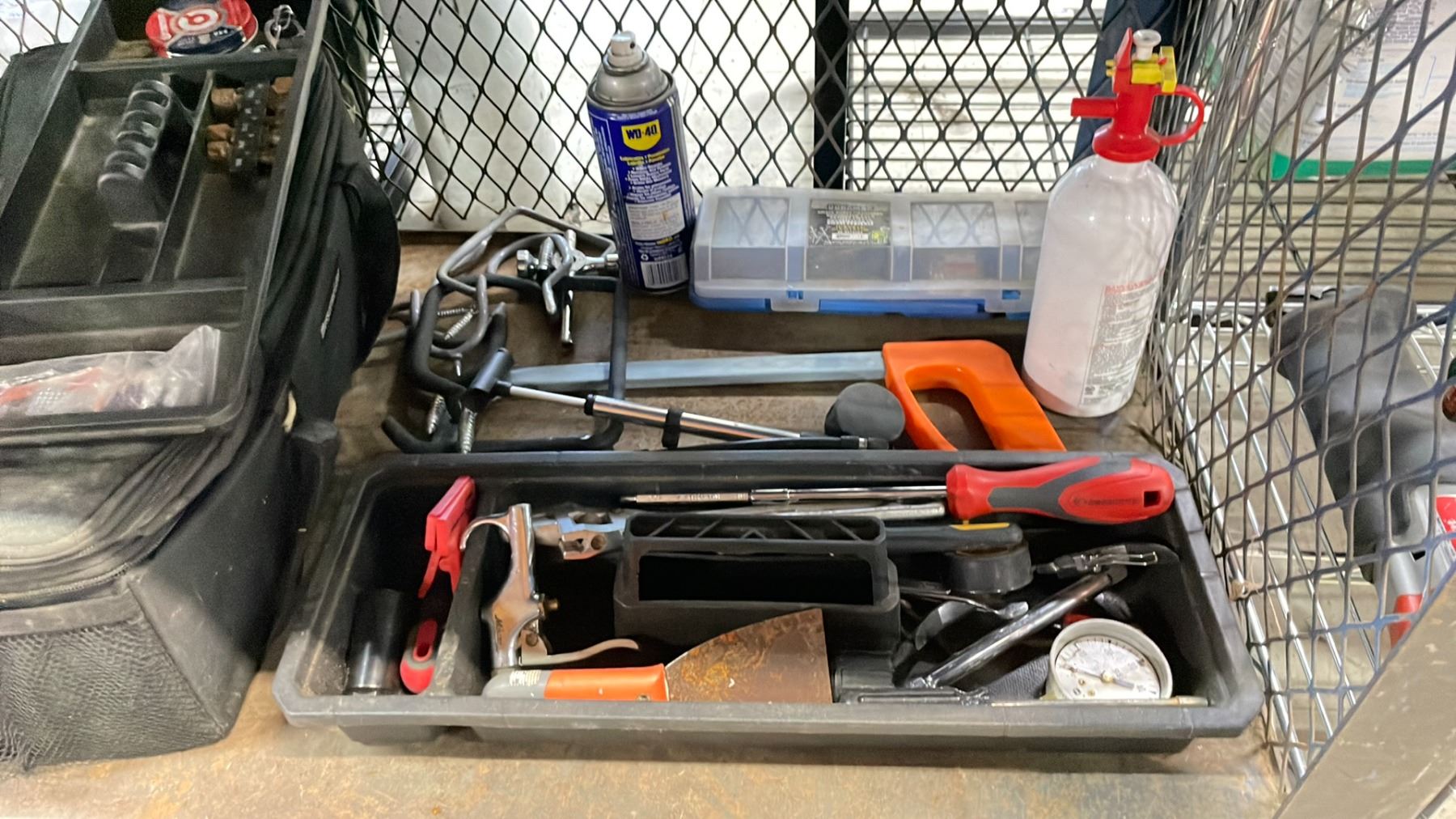 SHELF OF ASSORTED ITEMS INCLUDING; MOTOMASTER BATTERY CHARGER, TOOLBOXES WITH CONTENTS, LIGHTS &
