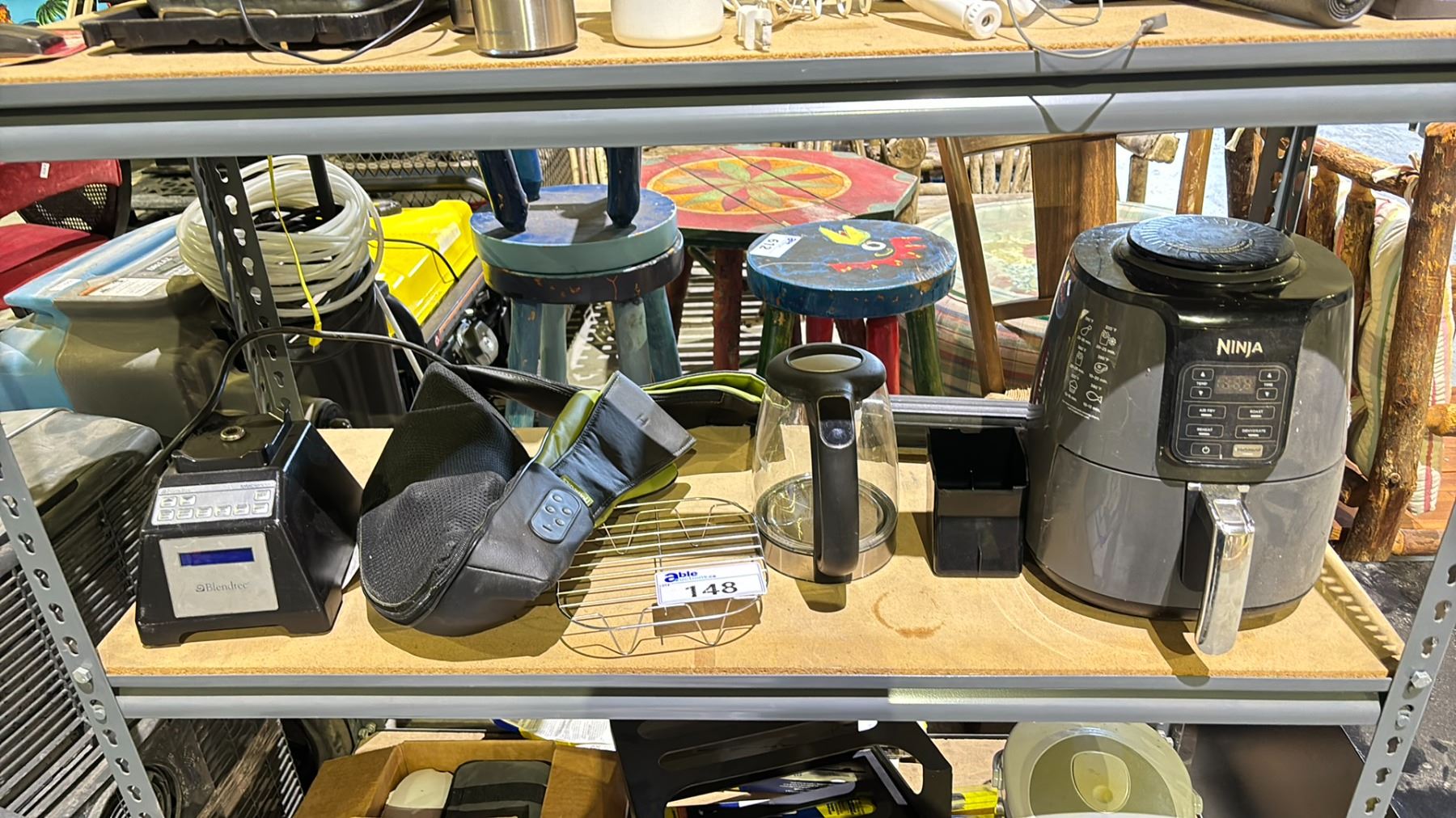 SHELF OF ASSORTED ITEMS INCLUDING; NINJA AIR FRYER, GLASS KETTLE, MASSAGER & MORE (UNKNOWN WORKING CONDITION, MAY BE MISSING PIECES)