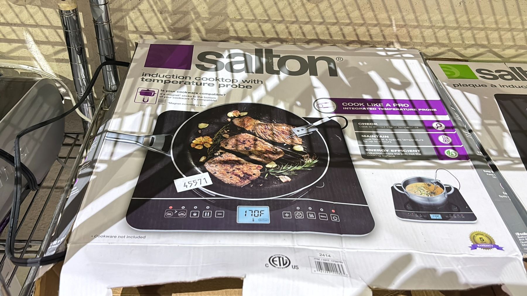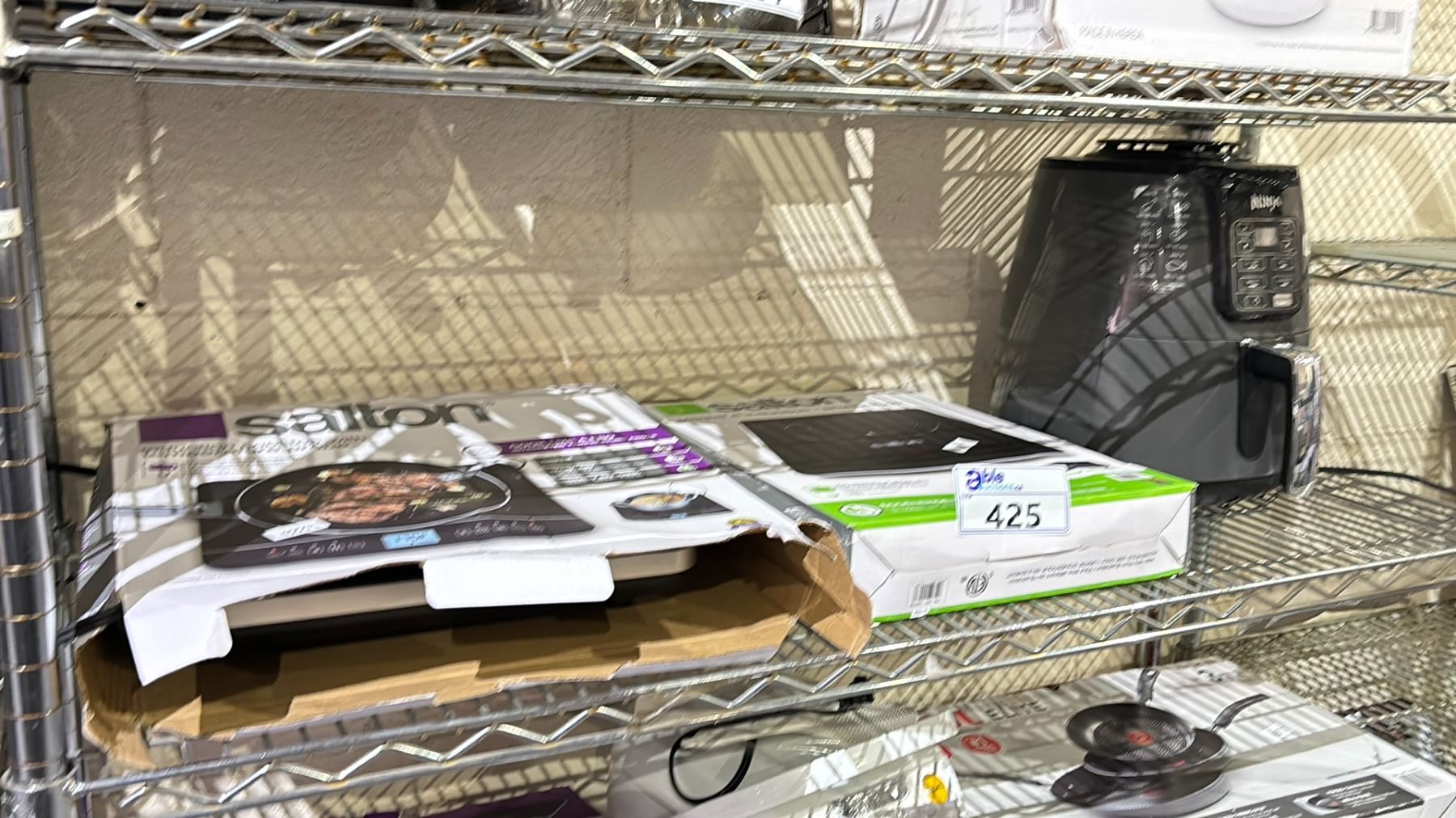 SHELF OF ASSORTED ITEMS, INCLUDING" NINJA AIRFRYER, & 2 COOKING TOPS.