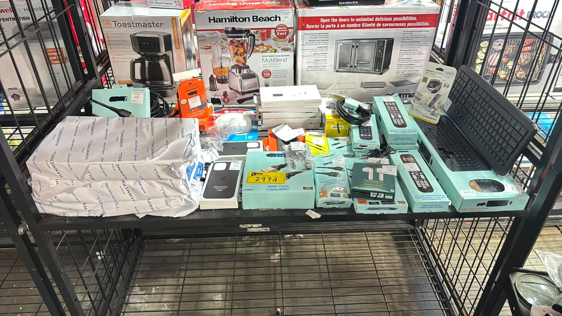 SHELF OF ASSORTED ITEMS INCLUDING; ONN UNIVERSAL 6 DEVICE REMOTE, ONN HDMI CABLE, IPHONE 12 PRO MAX