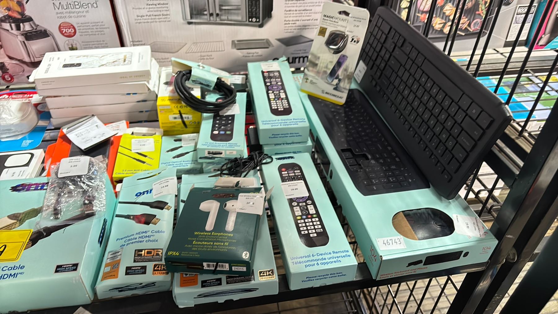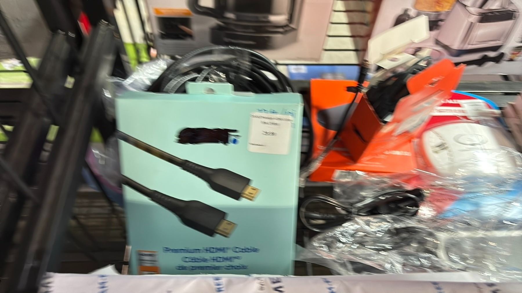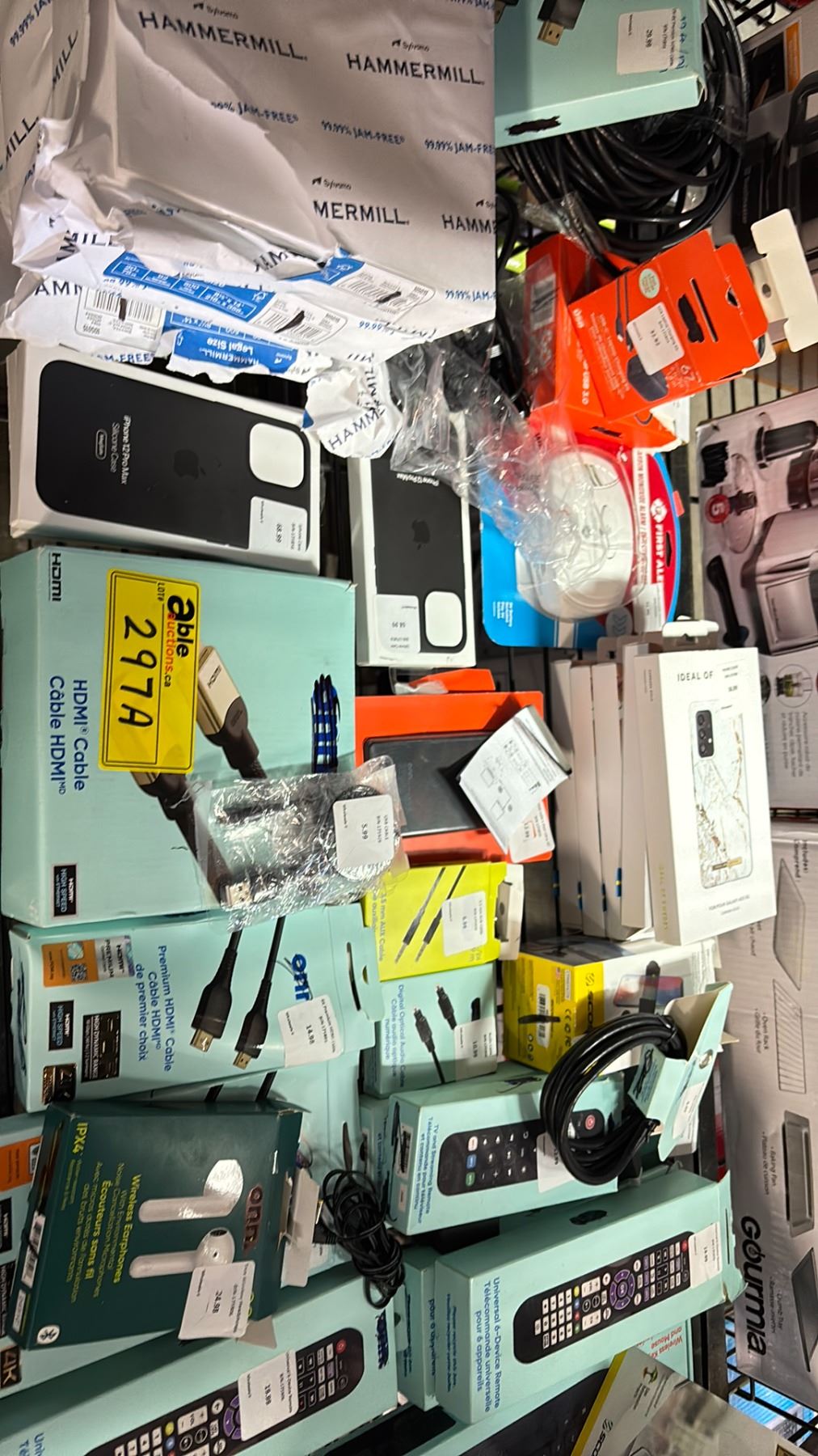 SHELF OF ASSORTED ITEMS INCLUDING; ONN UNIVERSAL 6 DEVICE REMOTE, ONN HDMI CABLE, IPHONE 12 PRO MAX CASE AND MORE