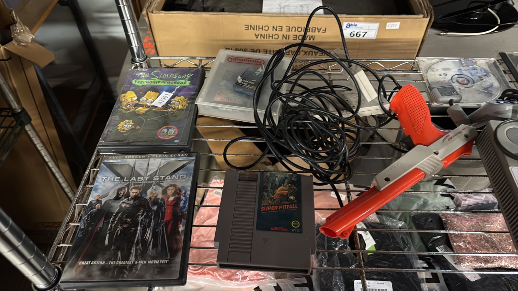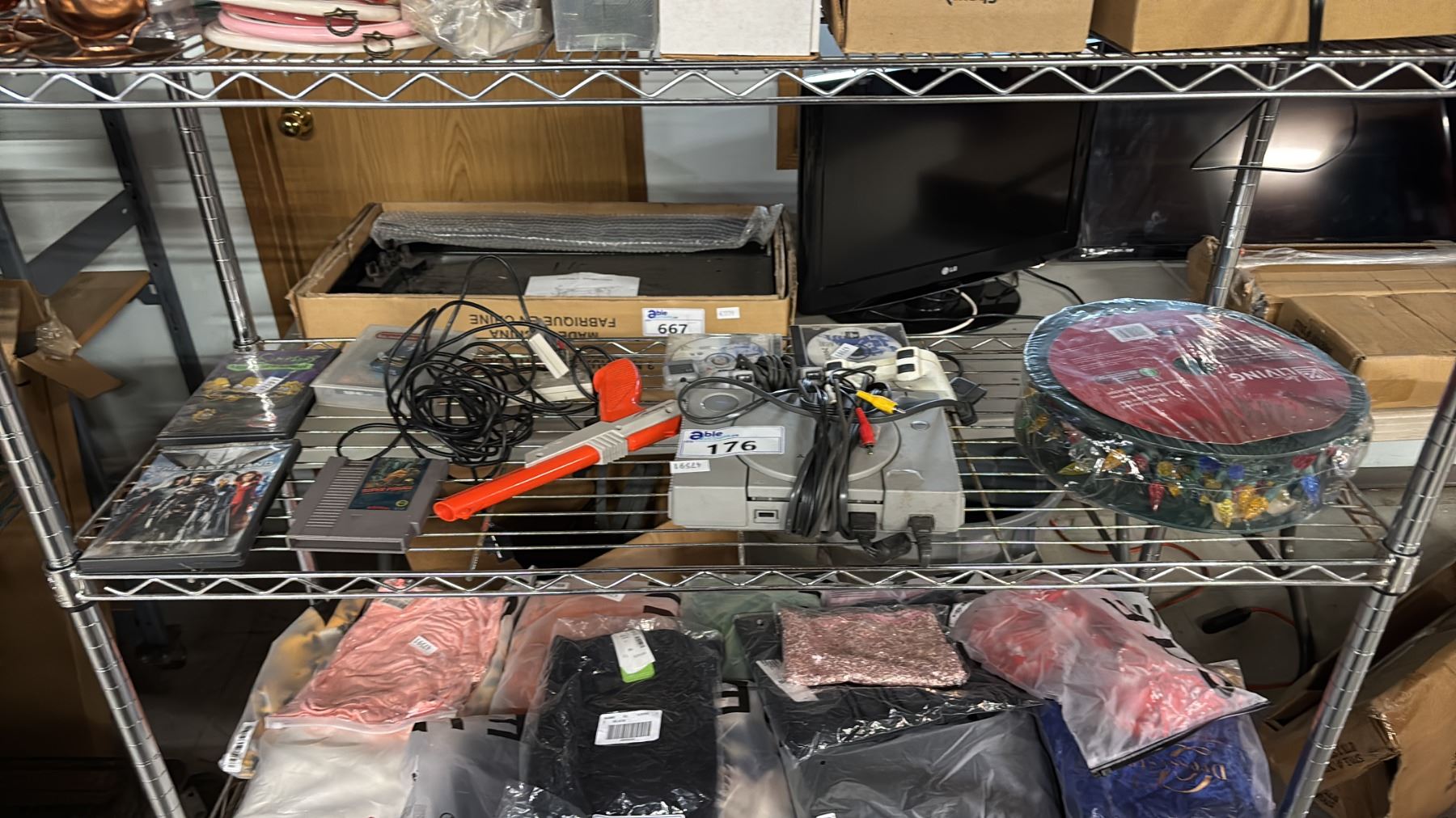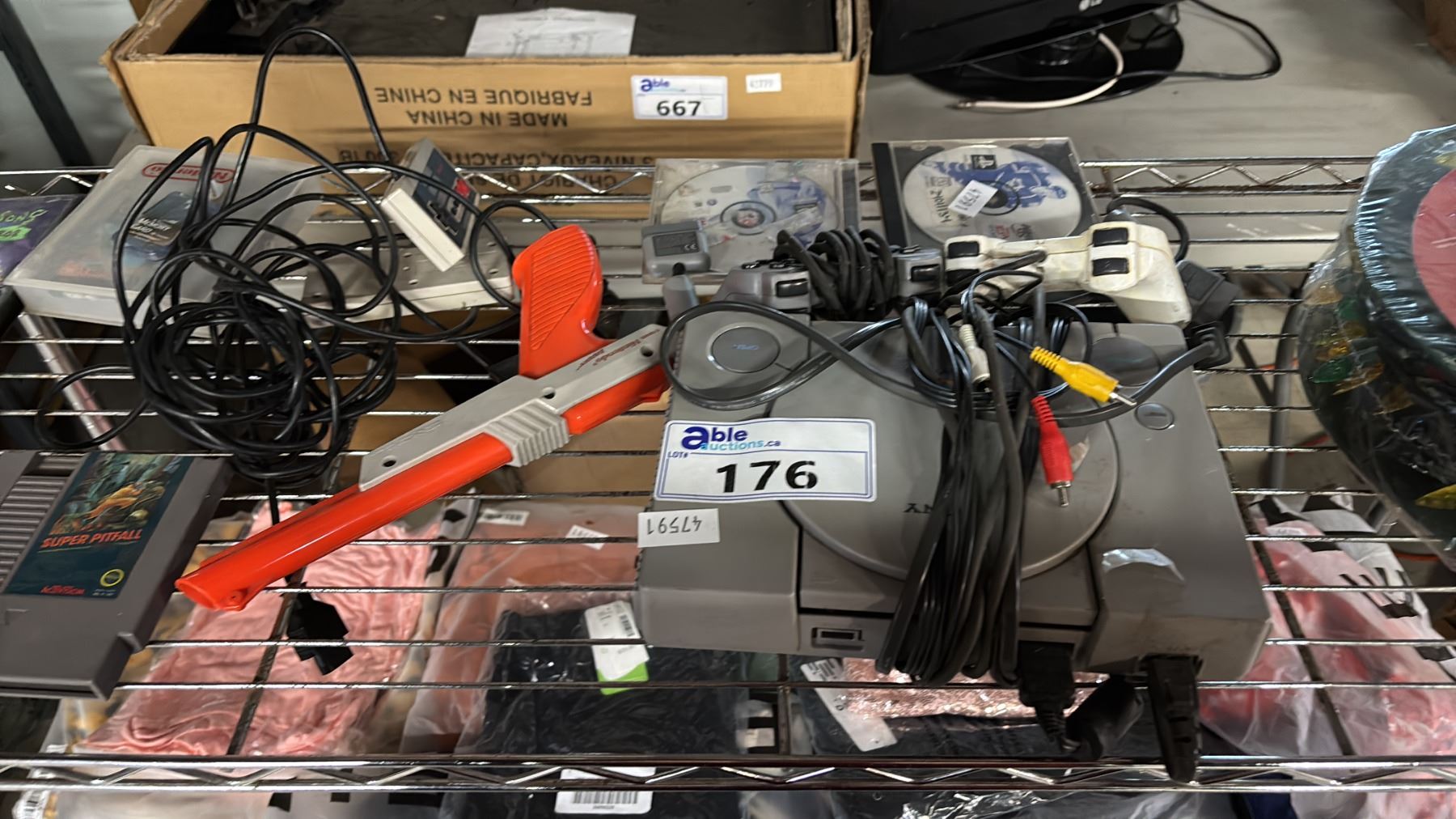 SHELF OF ASSORTED ITEMS INCLUDING; PLAYSTATION 2, SUPER PITFALL SNES GAME, DUCK HUNT GUN, CHRISTMAS LIGHTS & MORE