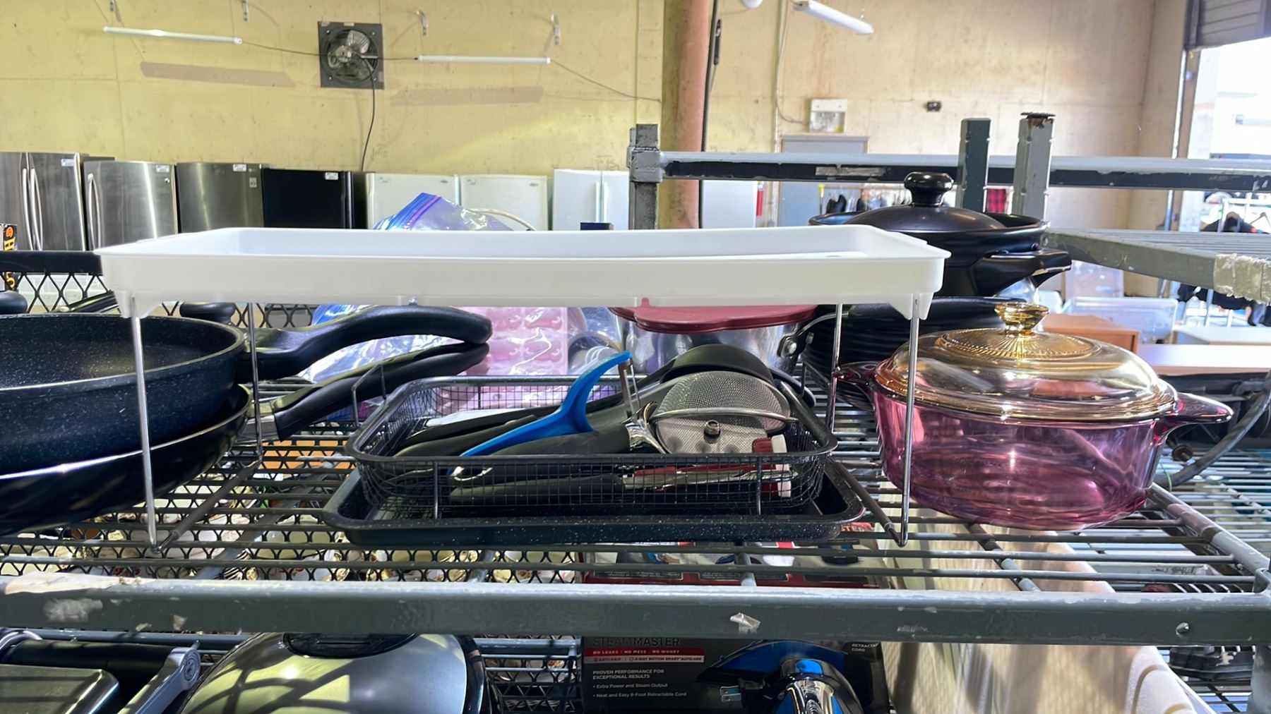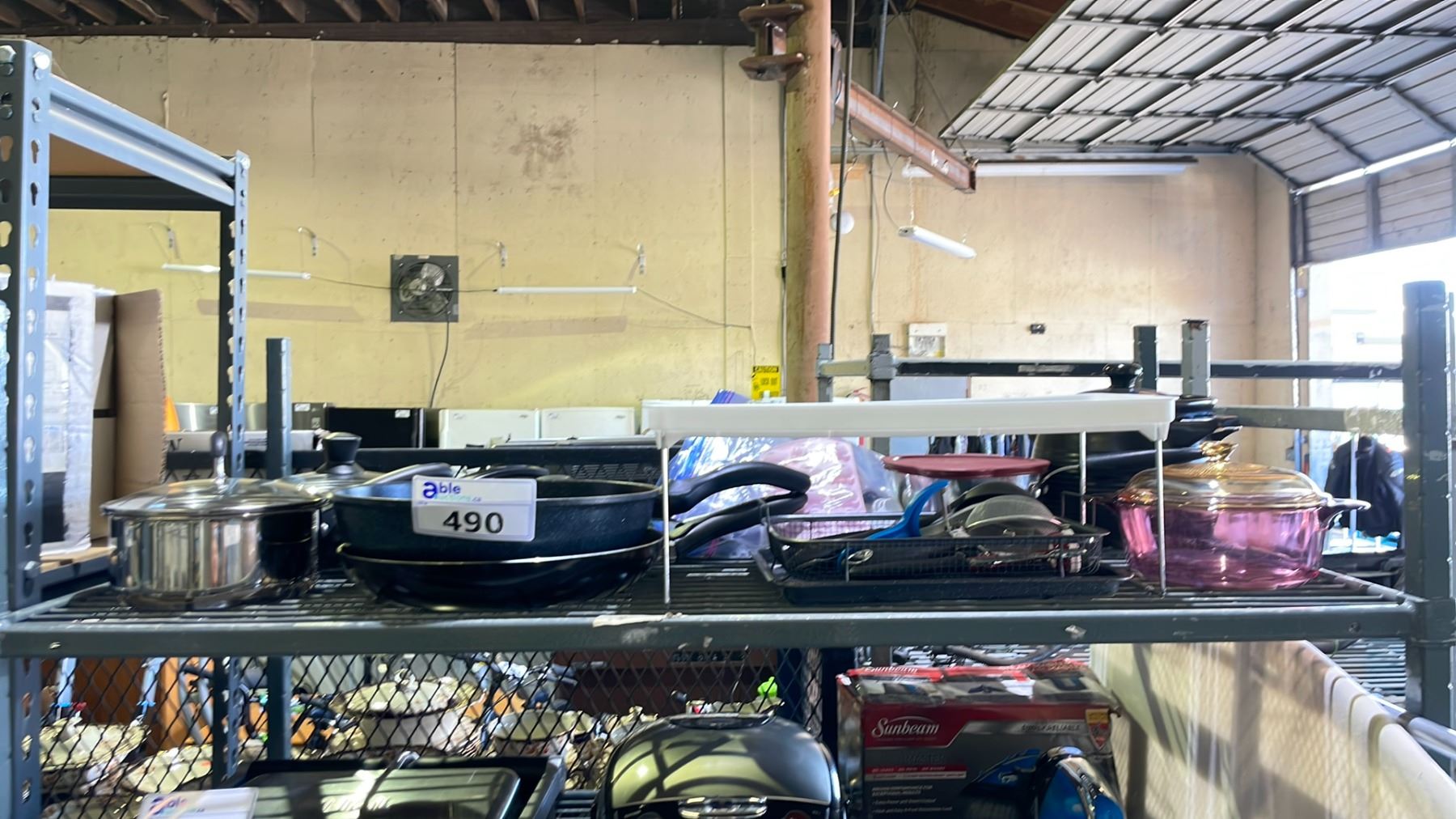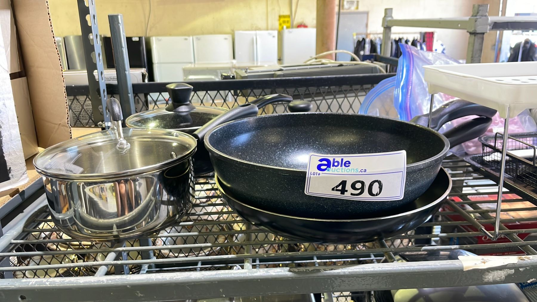 SHELF OF ASSORTED ITEMS INCLUDING; POTS, KITCHEN UTENSILS & MORE