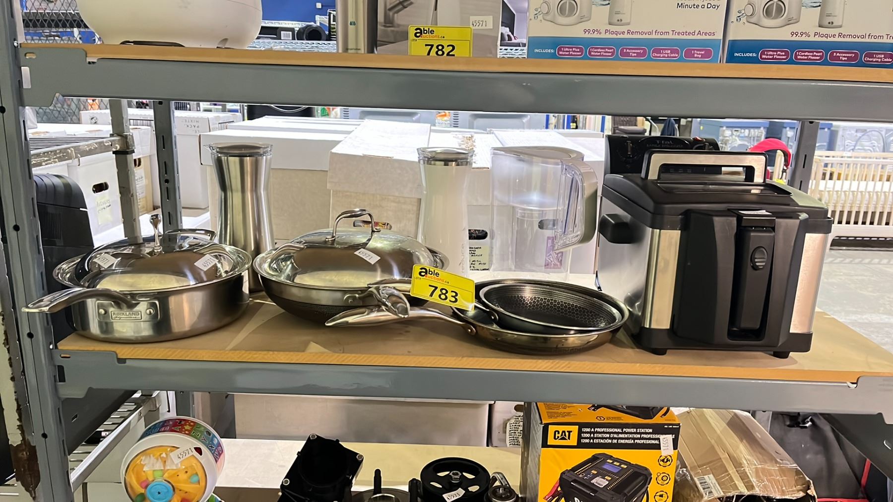 SHELF OF ASSORTED ITEMS INCLUDING; POTS & PANS, T-FAL DEEP FRYER, WATER PITCHER & MORE (UNKNOWN WORKING CONDITION, MAY BE MISSING PIECES)