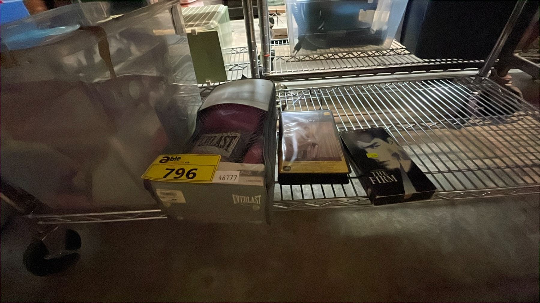 SHELF OF ASSORTED ITEMS INCLUDING; PUNCHING GLOVES, VHS TAPES & MORE