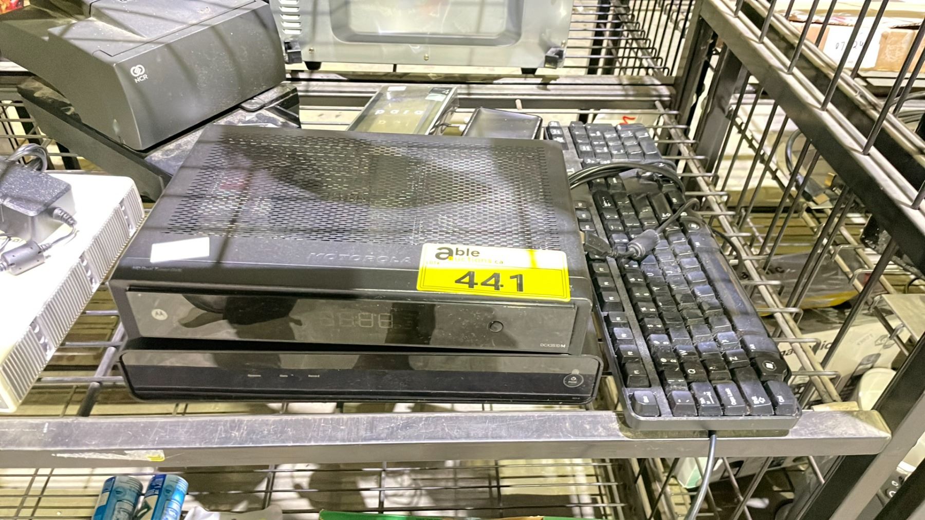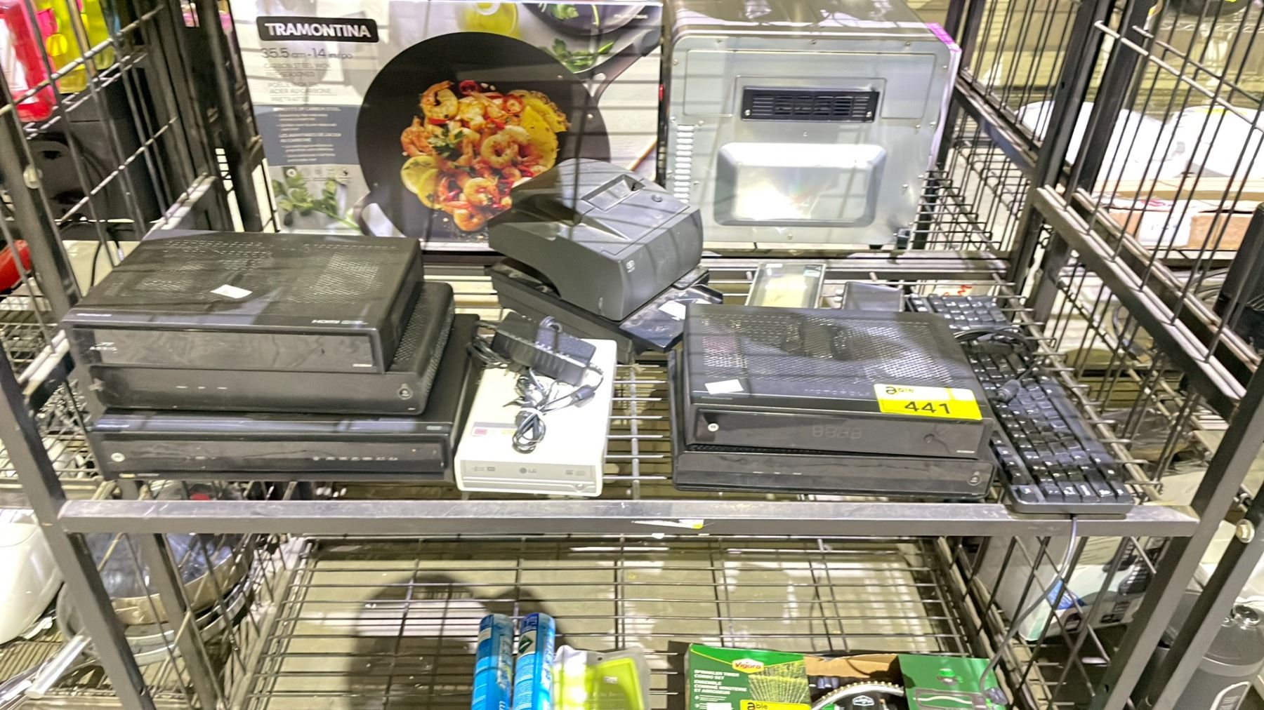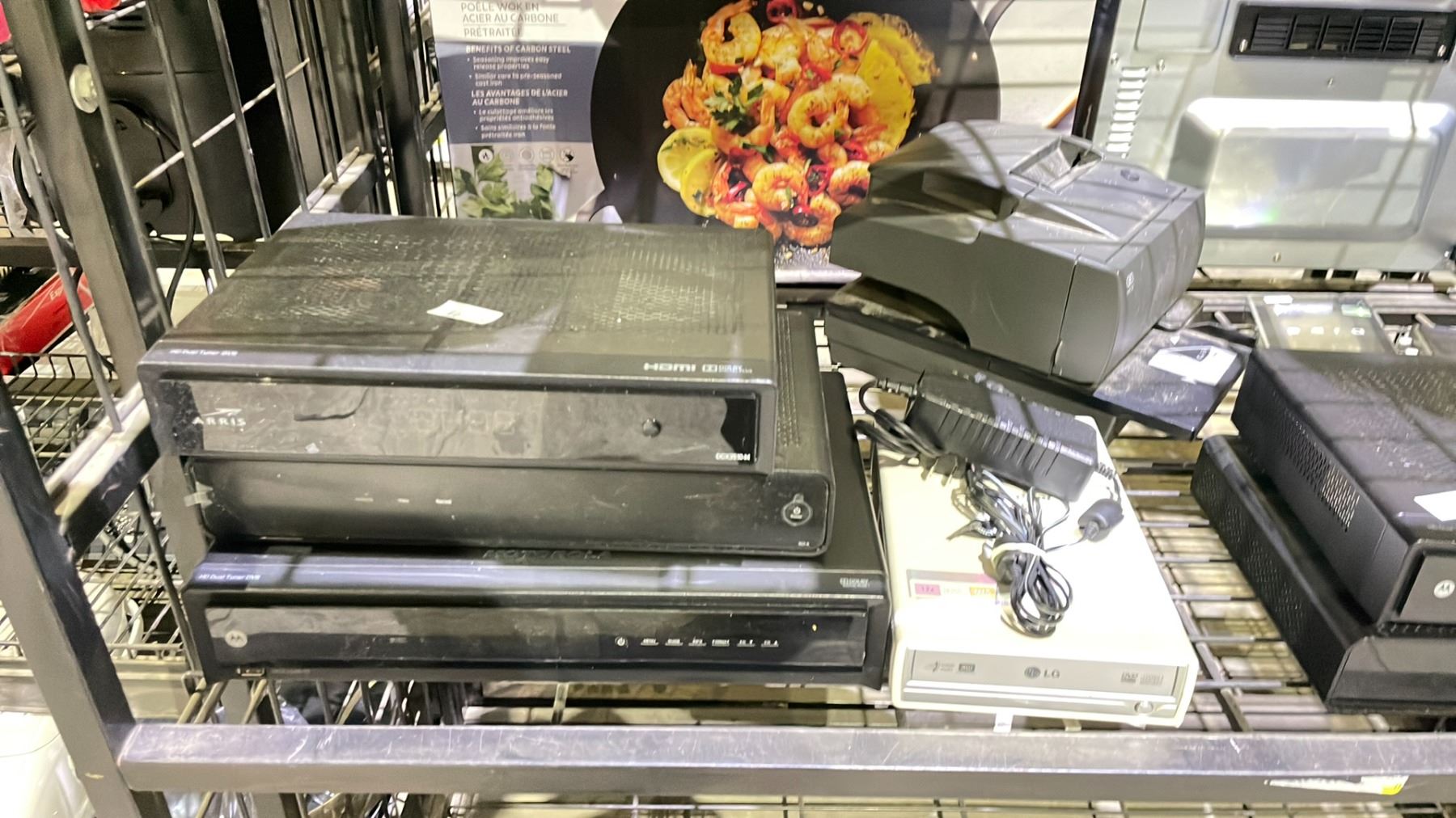 SHELF OF ASSORTED ITEMS INCLUDING; PVR'S, PHONE CASE, CD DRIVE & MORE