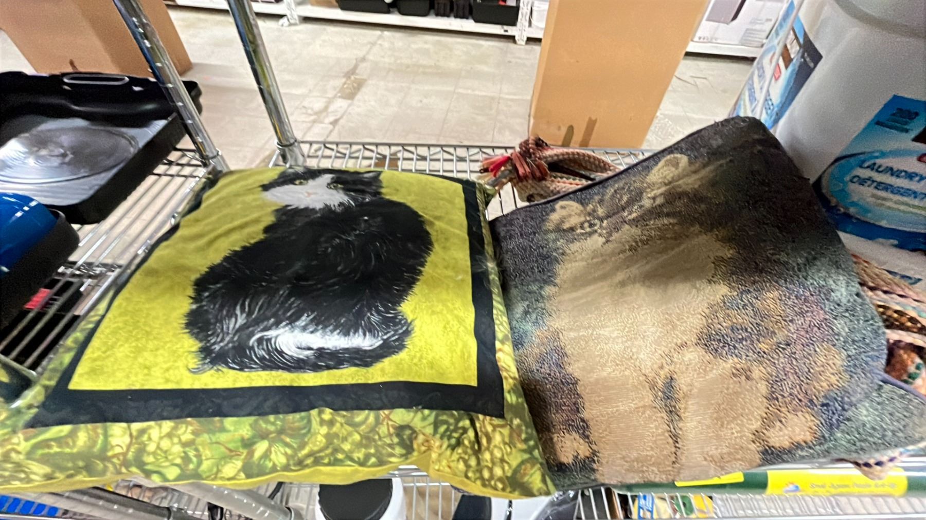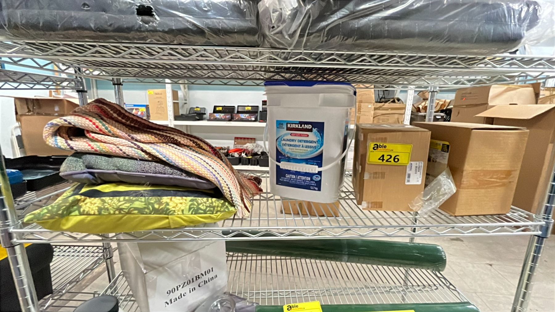 SHELF OF ASSORTED ITEMS, INCLUDING: RAGS, PILLOWS, LIGHTS & MORE