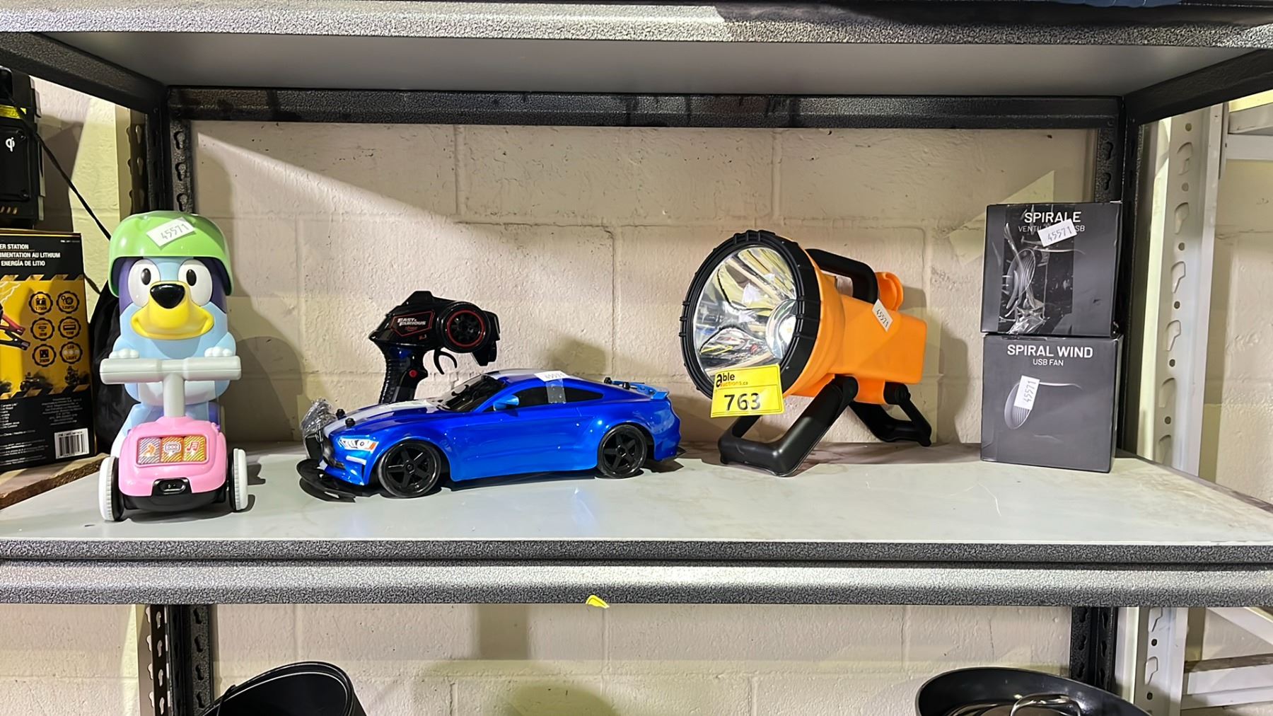 SHELF OF ASSORTED ITEMS INCLUDING; RC CAR, LIGHT, USB FANS & MORE (UNKNOWN WORKING CONDITION, MAY BE MISSING PIECES)