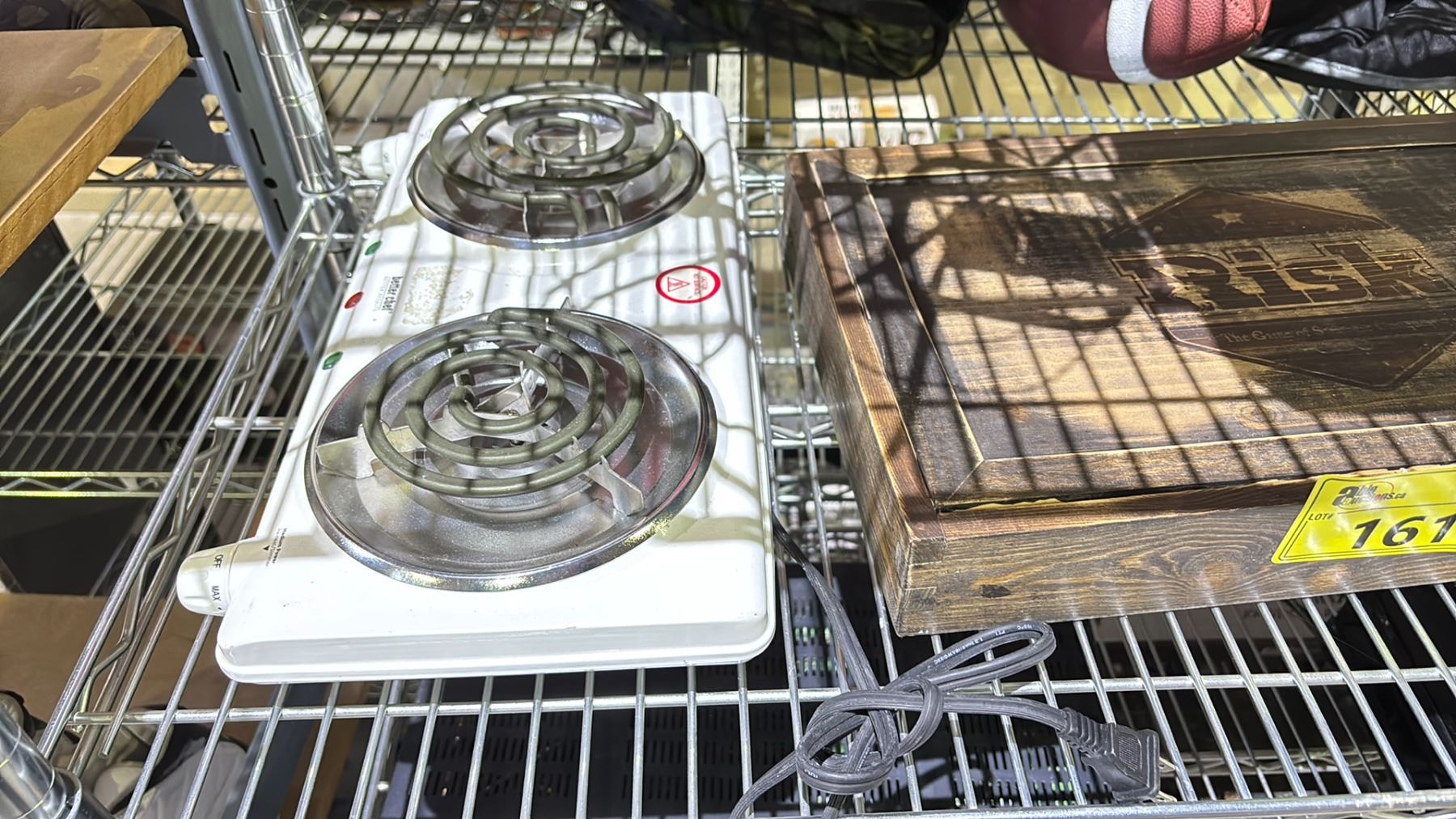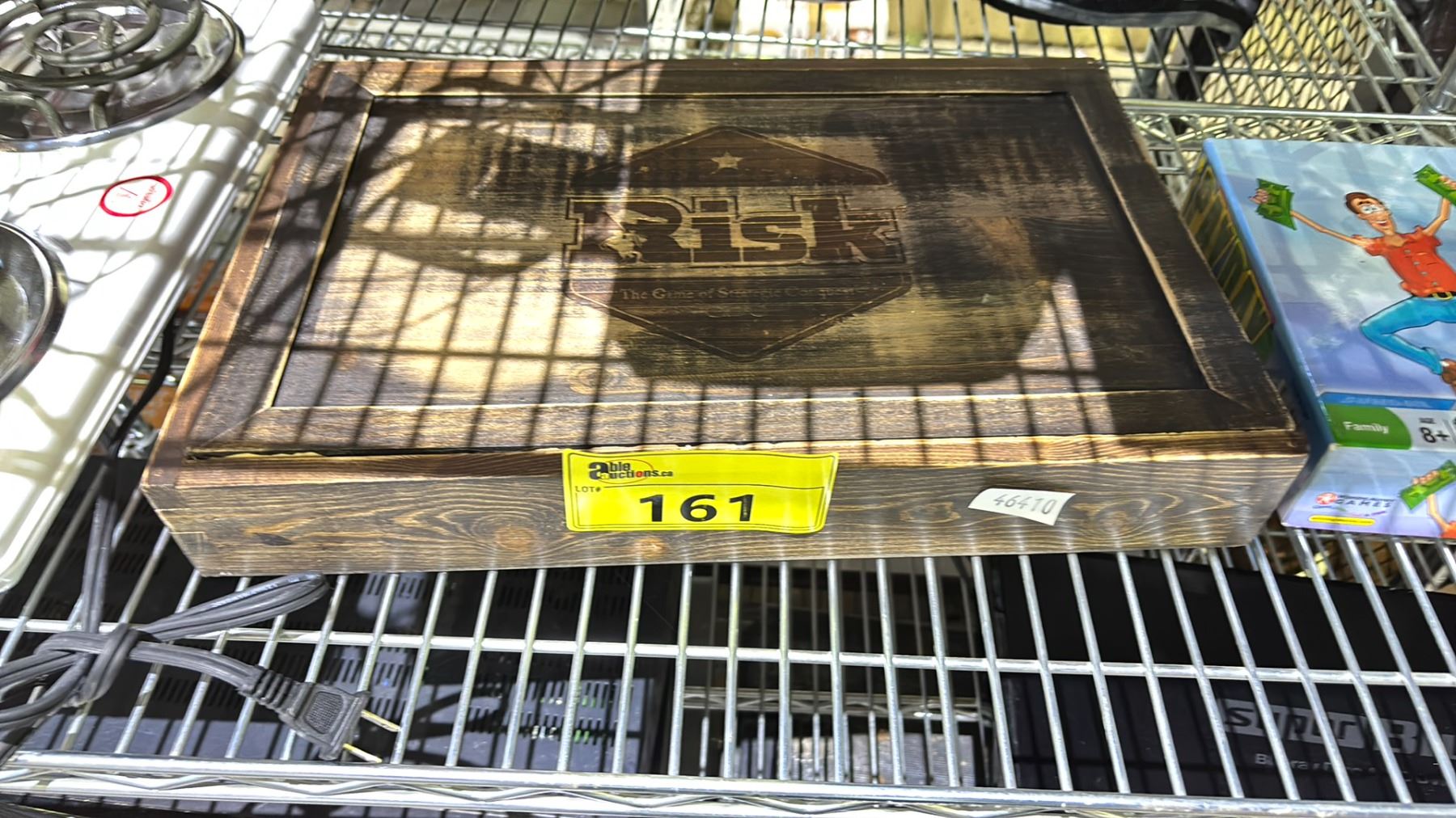 SHELF OF ASSORTED ITEMS INCLUDING; RISK WOODEN EDITION BOARD GAME, PAYDAY BOARD GAME & BETTER CHEF ELECTRIC COOK TOP