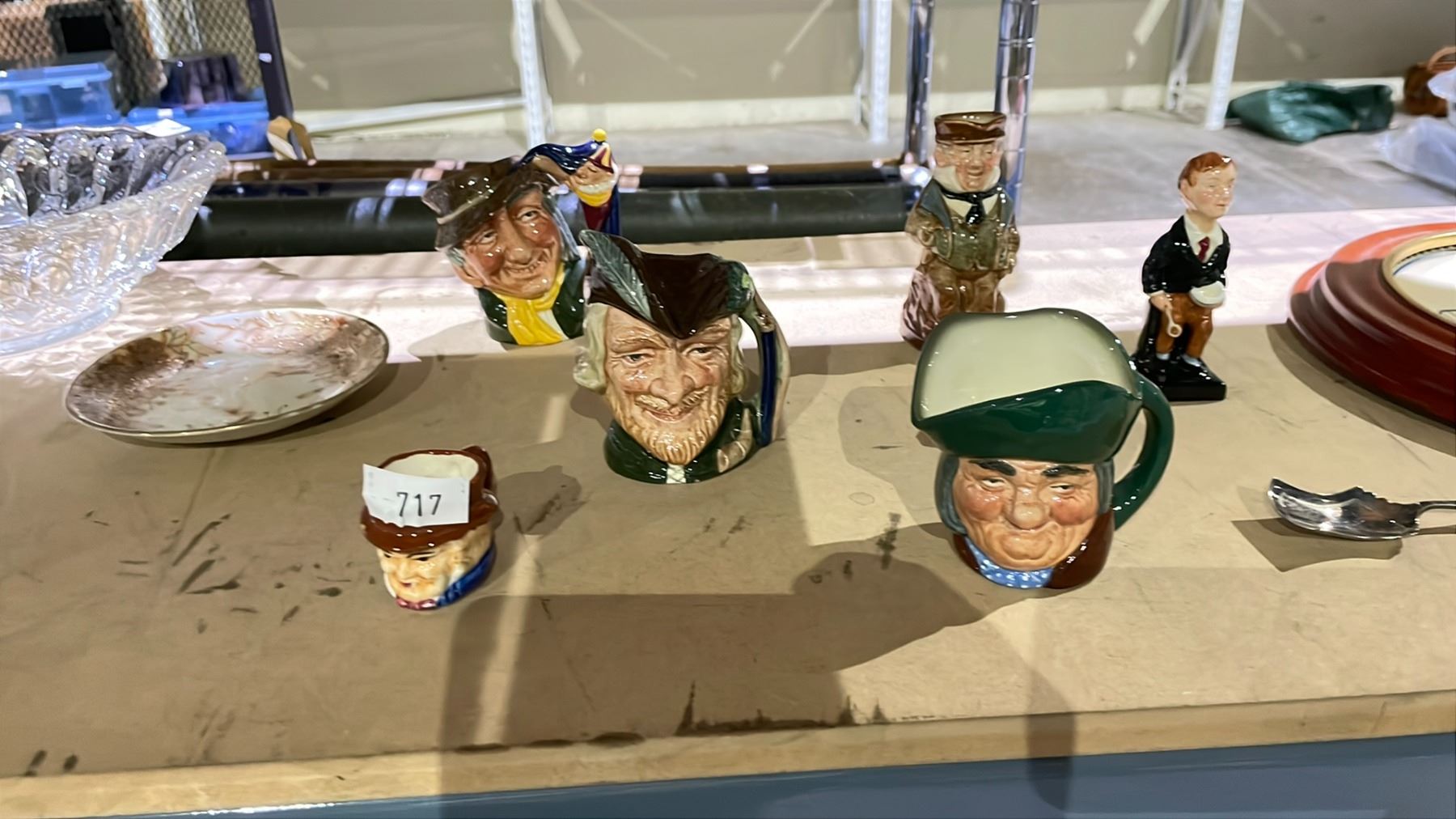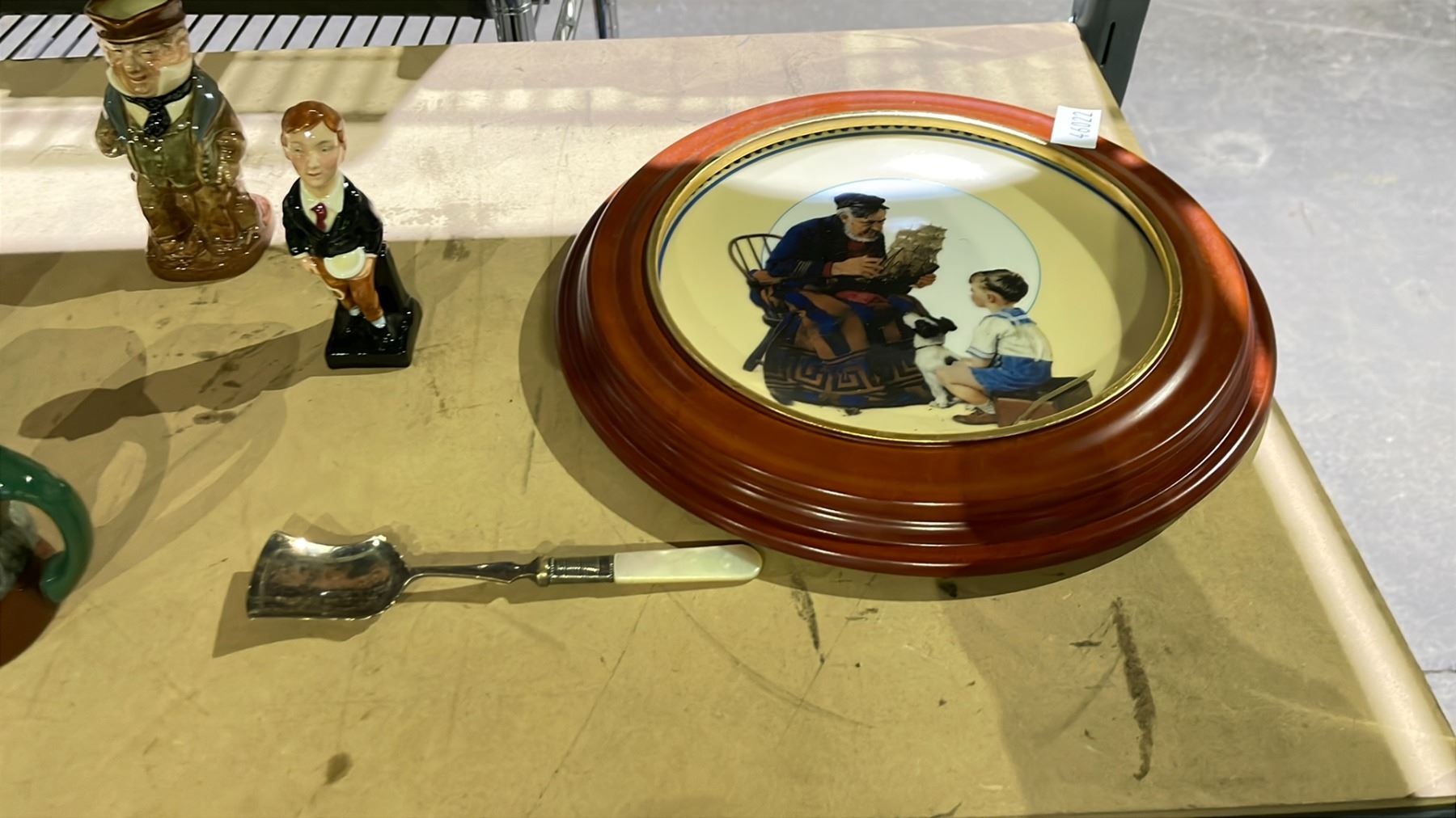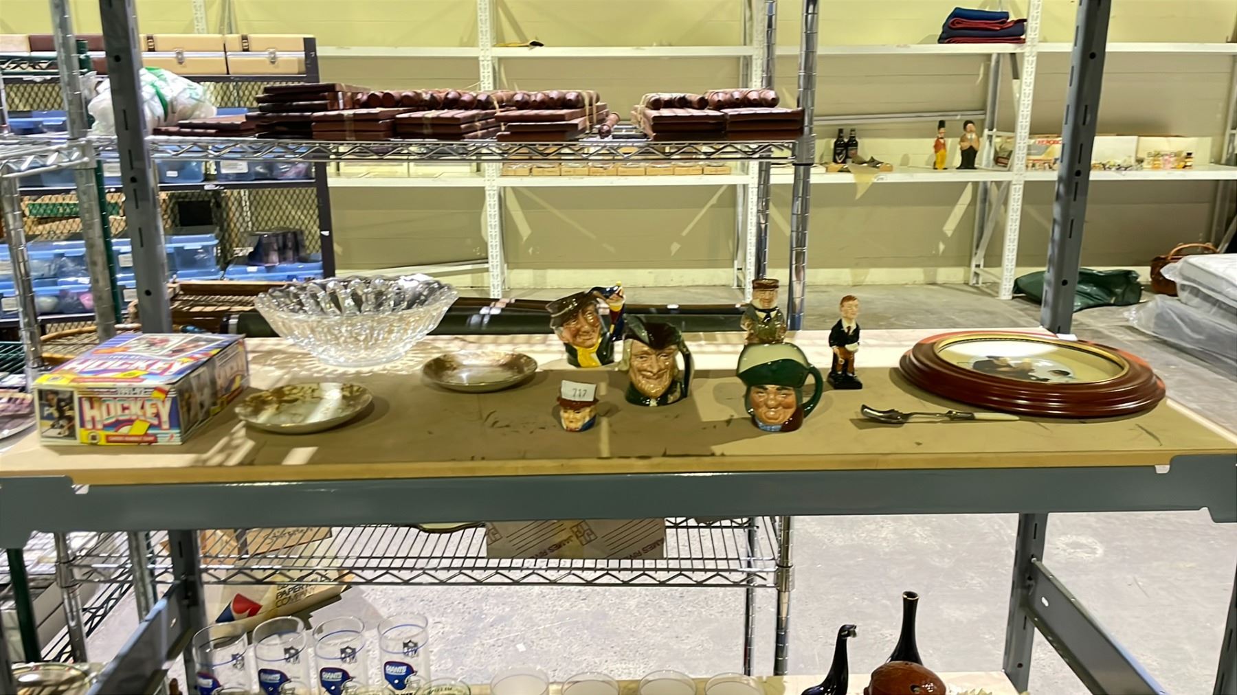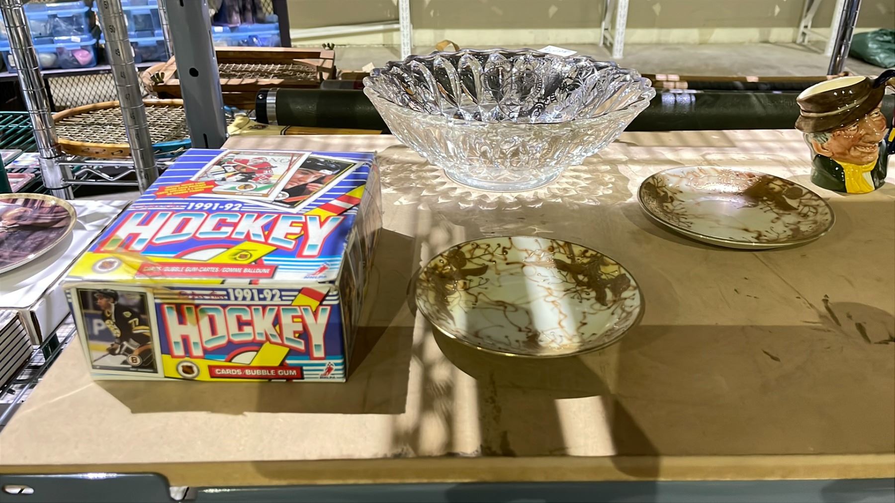 SHELF OF ASSORTED ITEMS INCLUDING; ROYAL DOULTON MUGS, HOCKEY CARDS, COLLECTIBLE PLATE & MORE