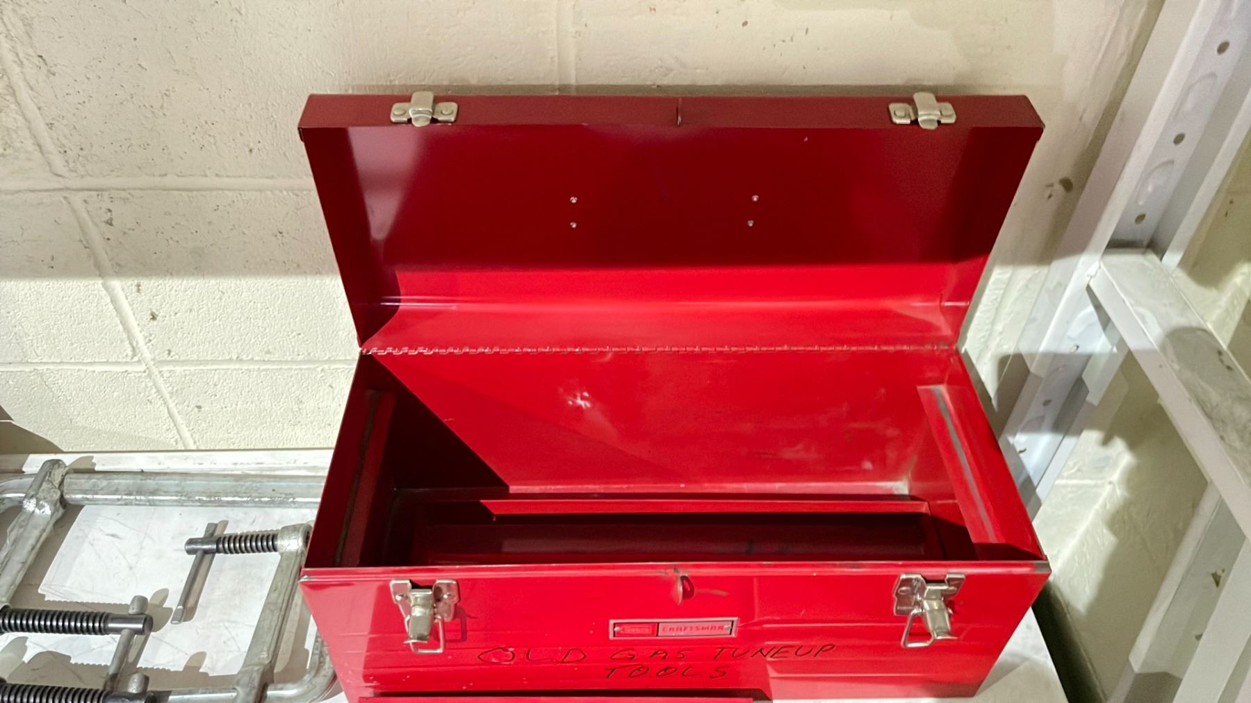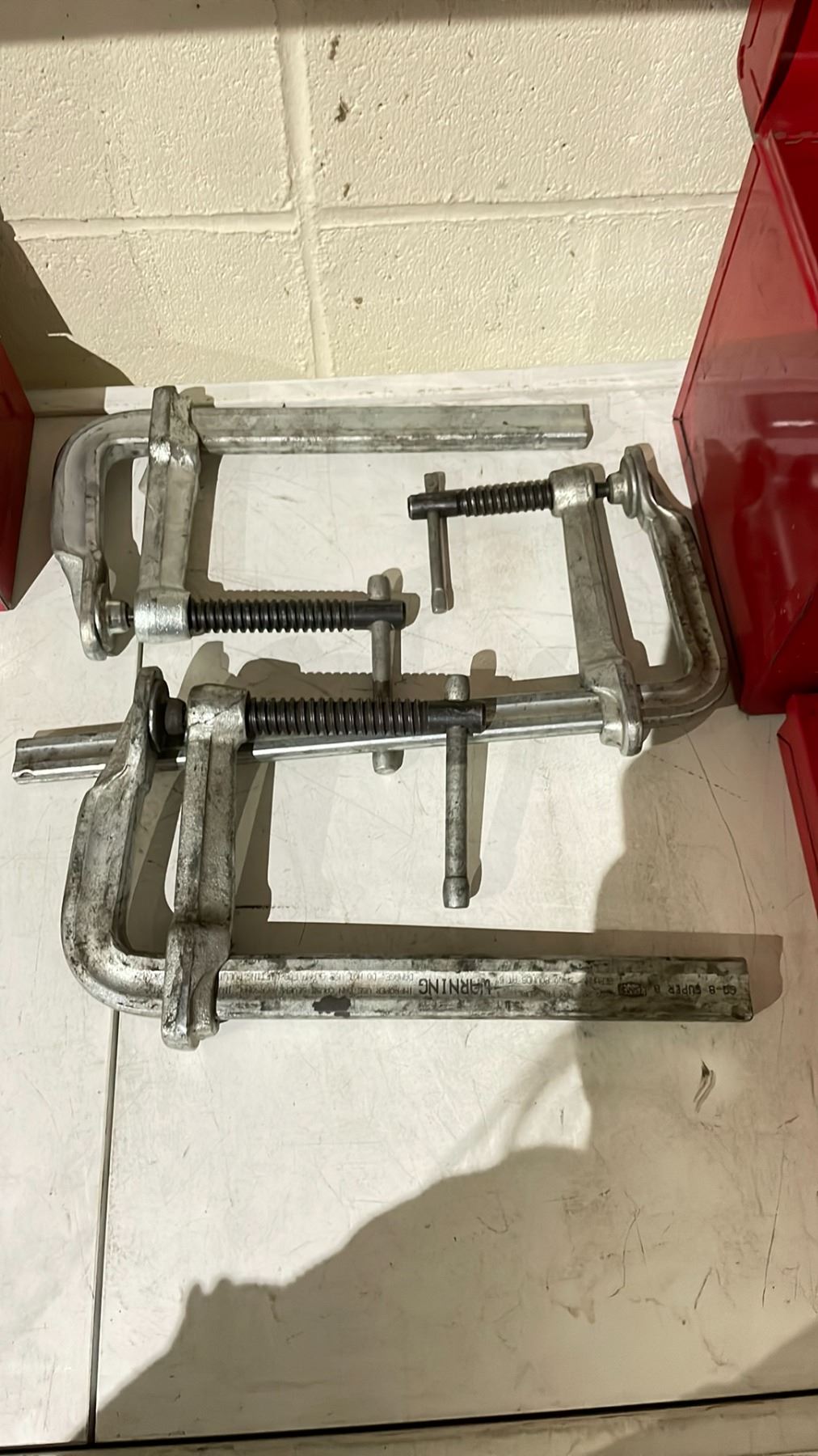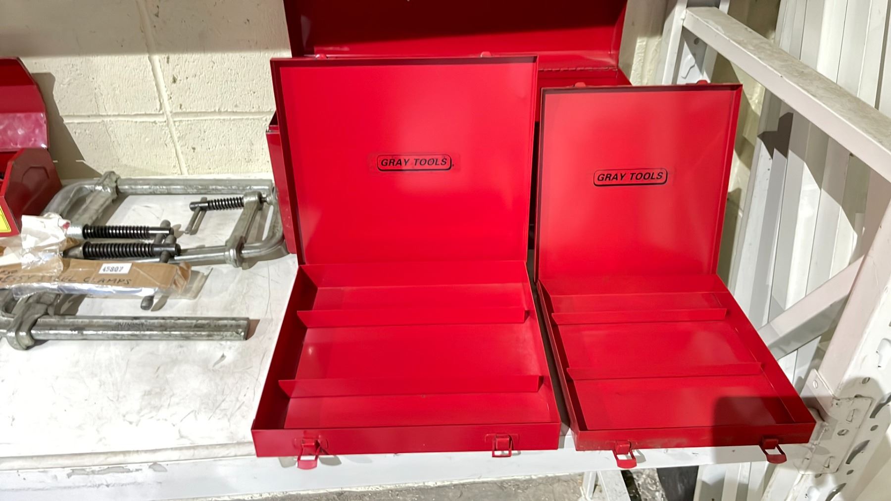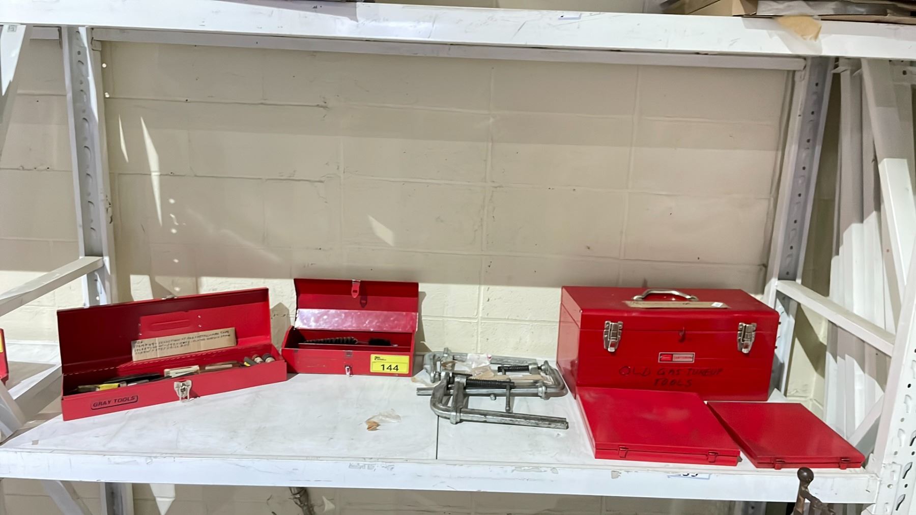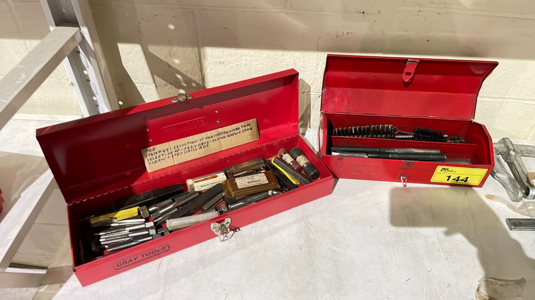 SHELF OF ASSORTED ITEMS INCLUDING; SAG, METRIC & PIPE TAPS, EASYOUTS FLUTED SCREW, SPIRAL SCREW & STEP DRILL BITS, 3 BESSY STEEL CLAMPS & 3 EMPTY TOOLBOXES