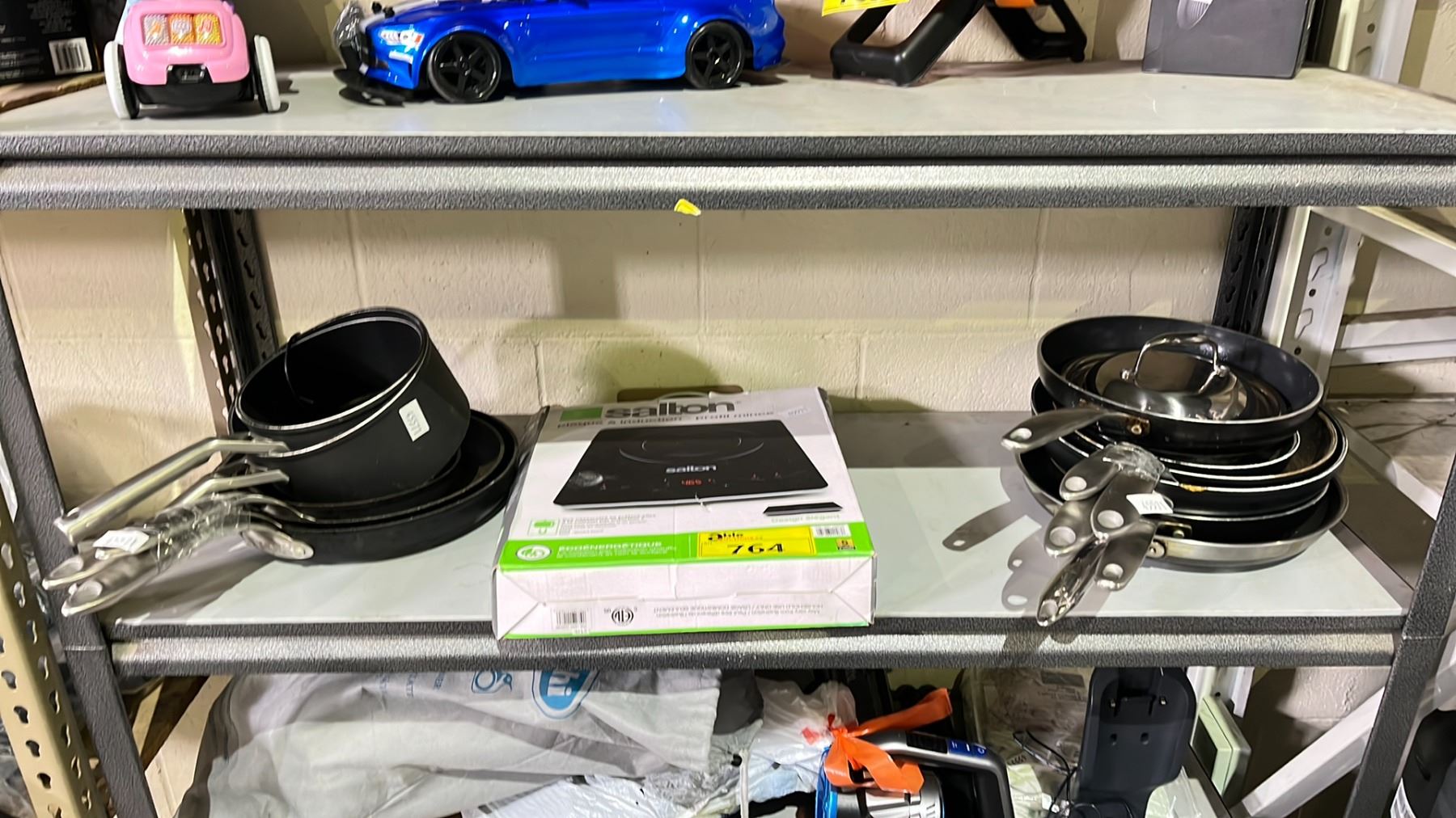 SHELF OF ASSORTED ITEMS INCLUDING; SALTON COOKTOP & ASSORTED POTS & PANS (UNKNOWN WORKING CONDITION, MAY BE MISSING PIECES)