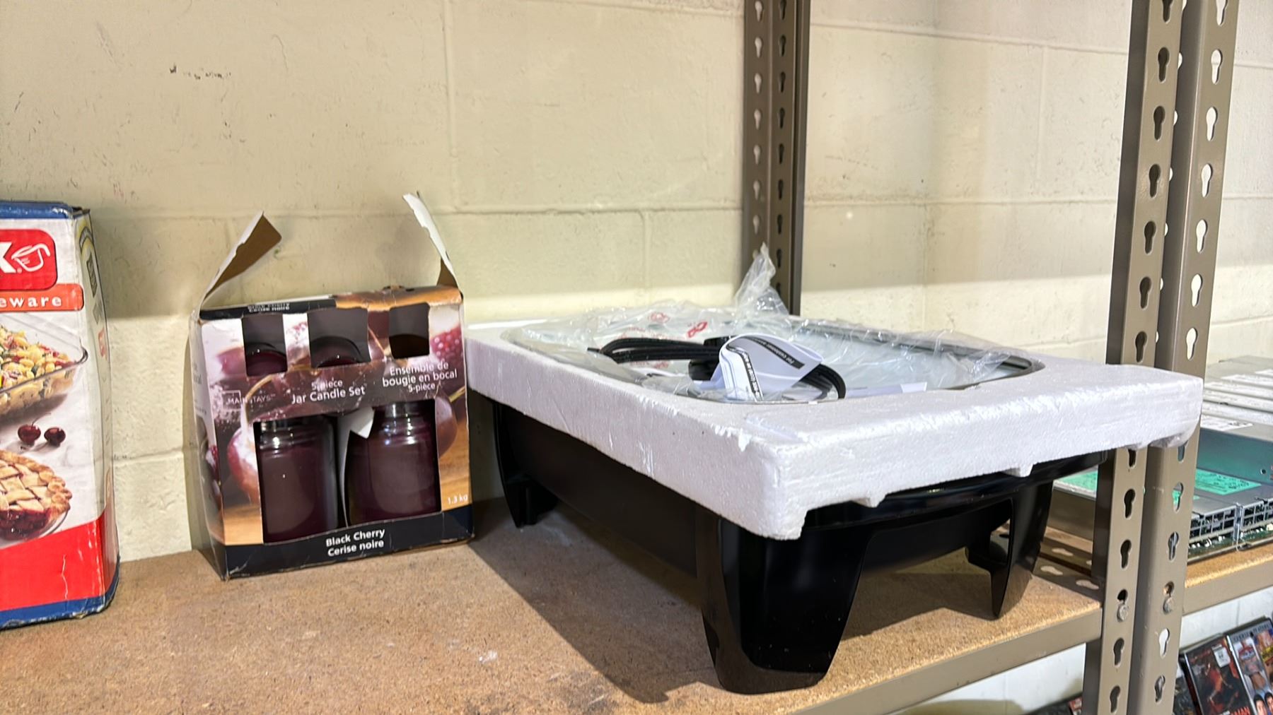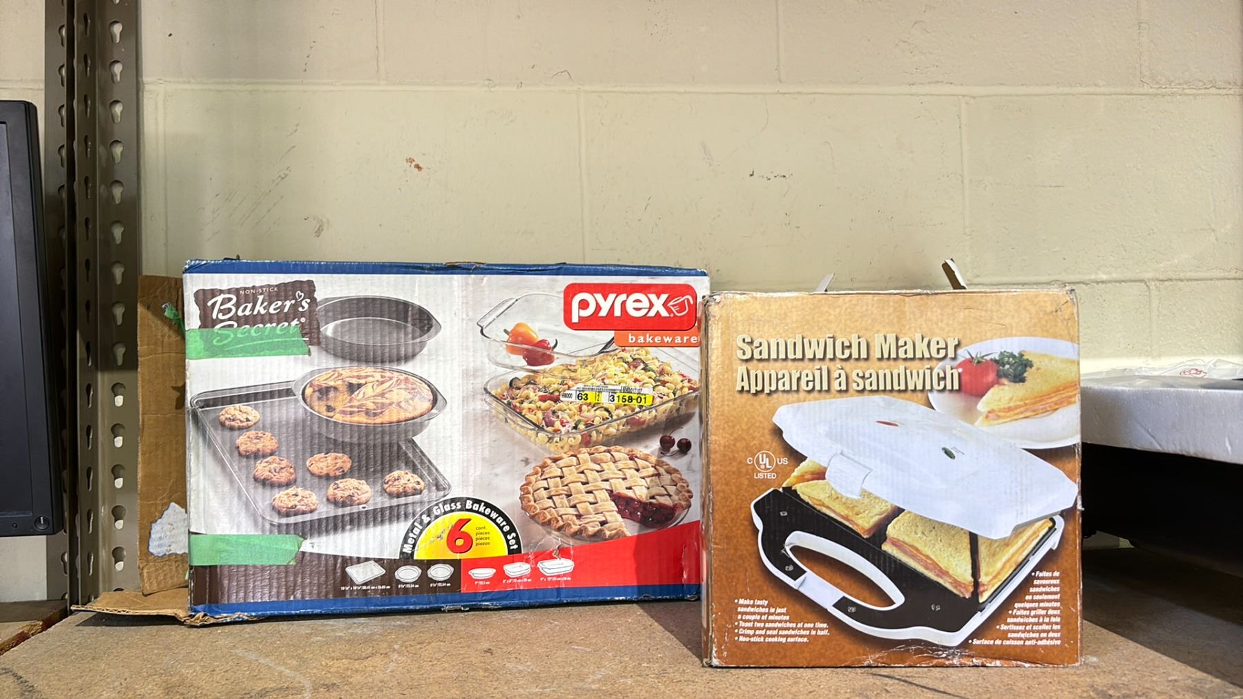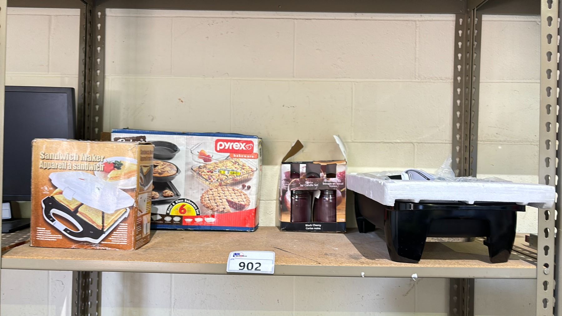 SHELF OF ASSORTED ITEMS INCLUDING; SANDWICH MAKER, PYREX BAKEWARE, JAR CANDLE SET & ELECTRIC SKILLET