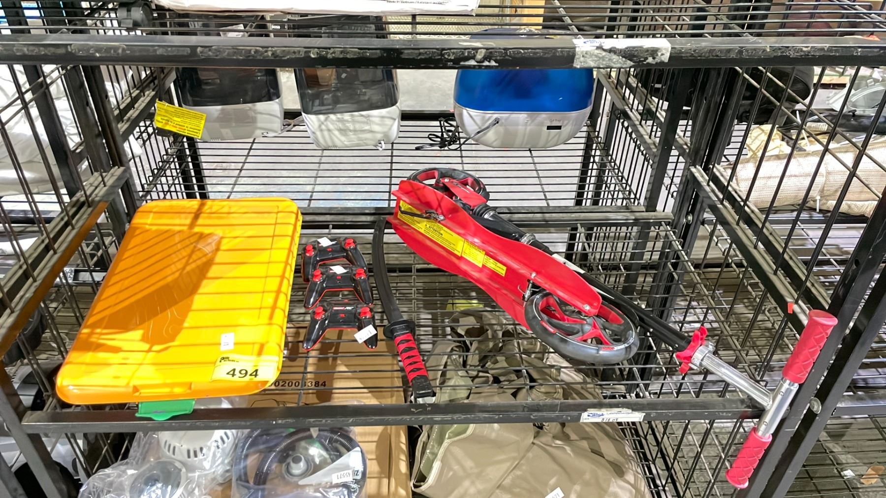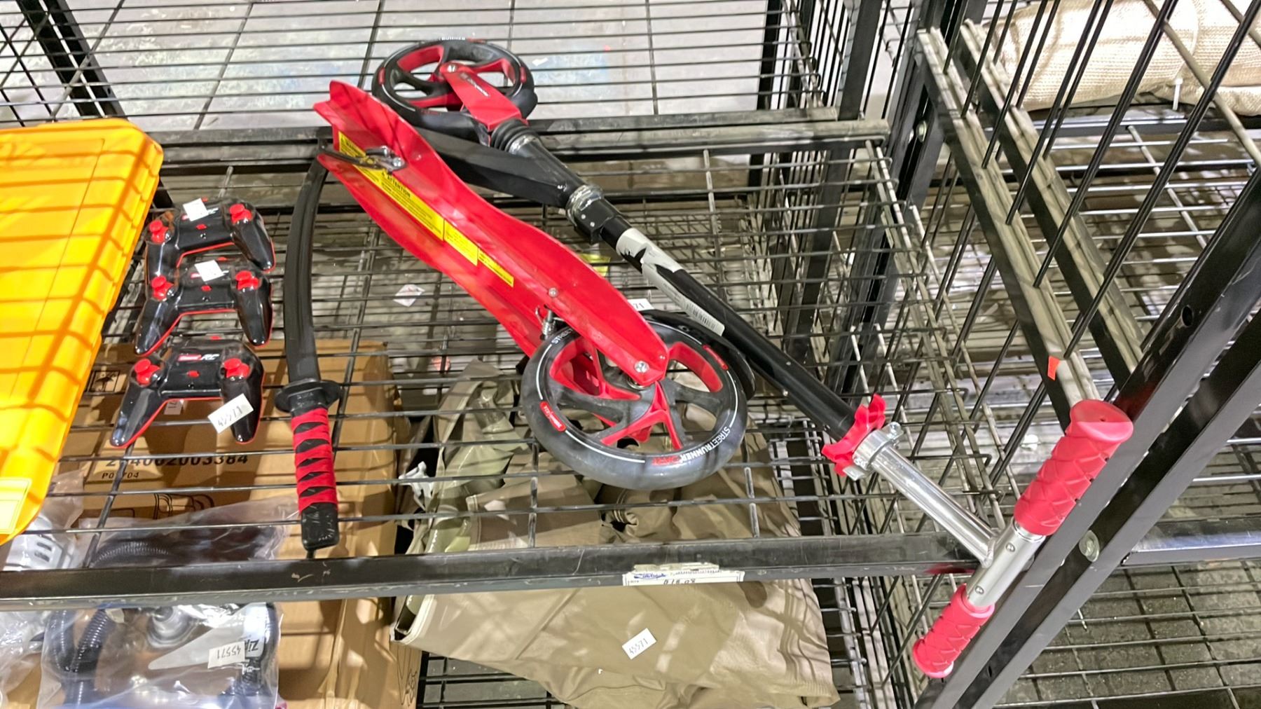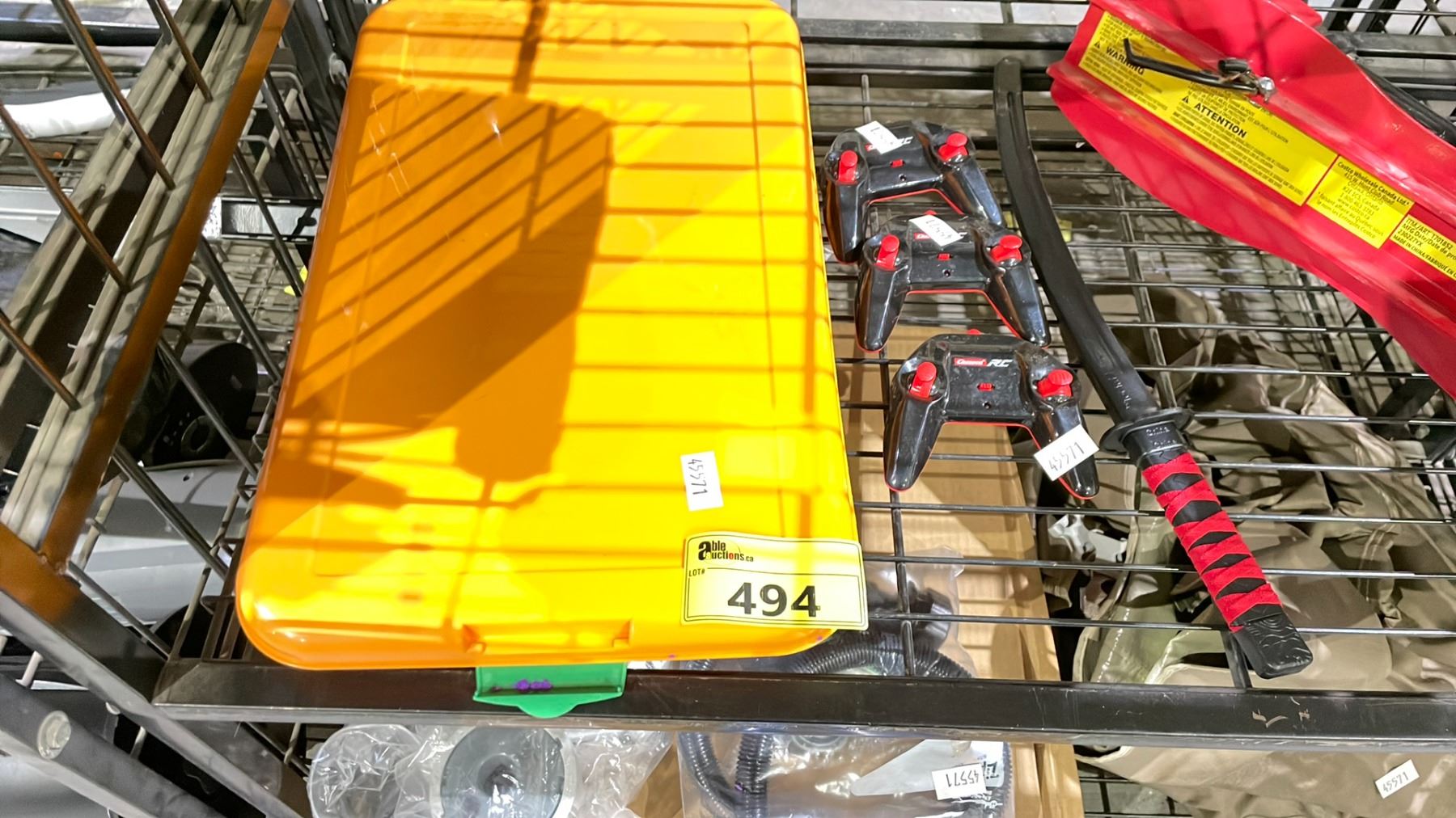 SHELF OF ASSORTED ITEMS INCLUDING; SCOOTER, PLASTIC SWORD, CARRERA RC CONTROLLERS & MORE