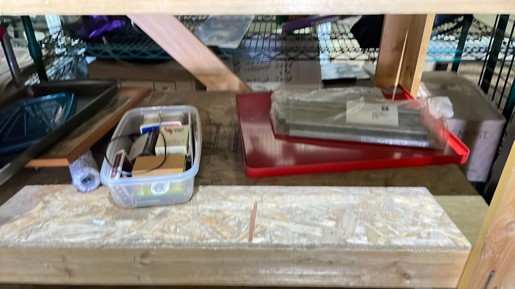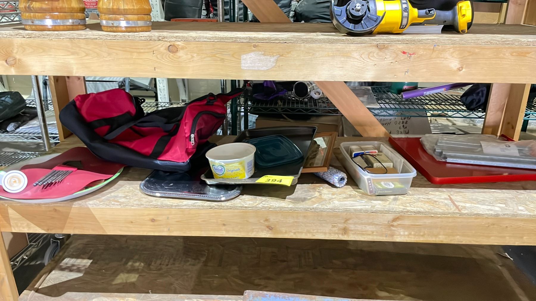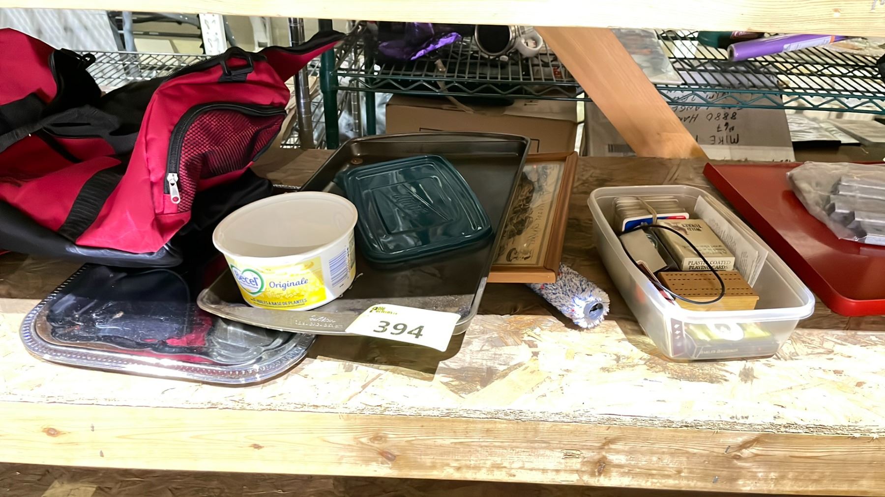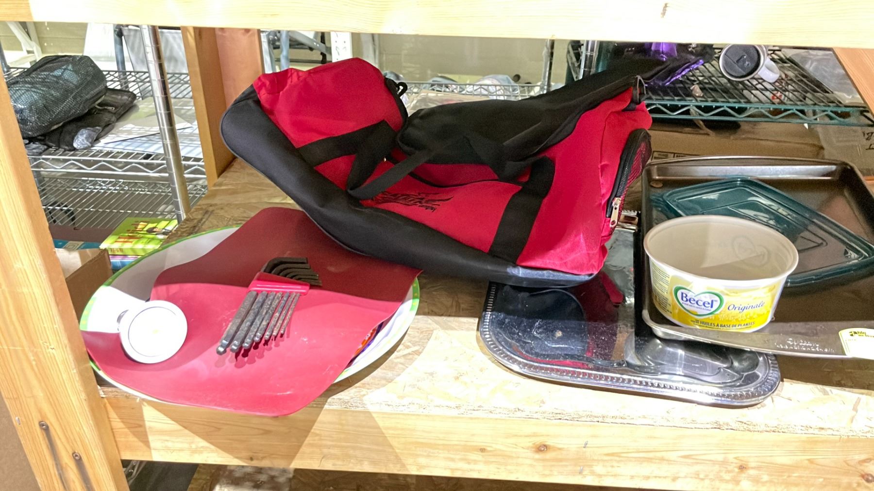 SHELF OF ASSORTED ITEMS INCLUDING; SERVING TRAY, ALLEN KEYS, LED LIGHTBULB & MORE