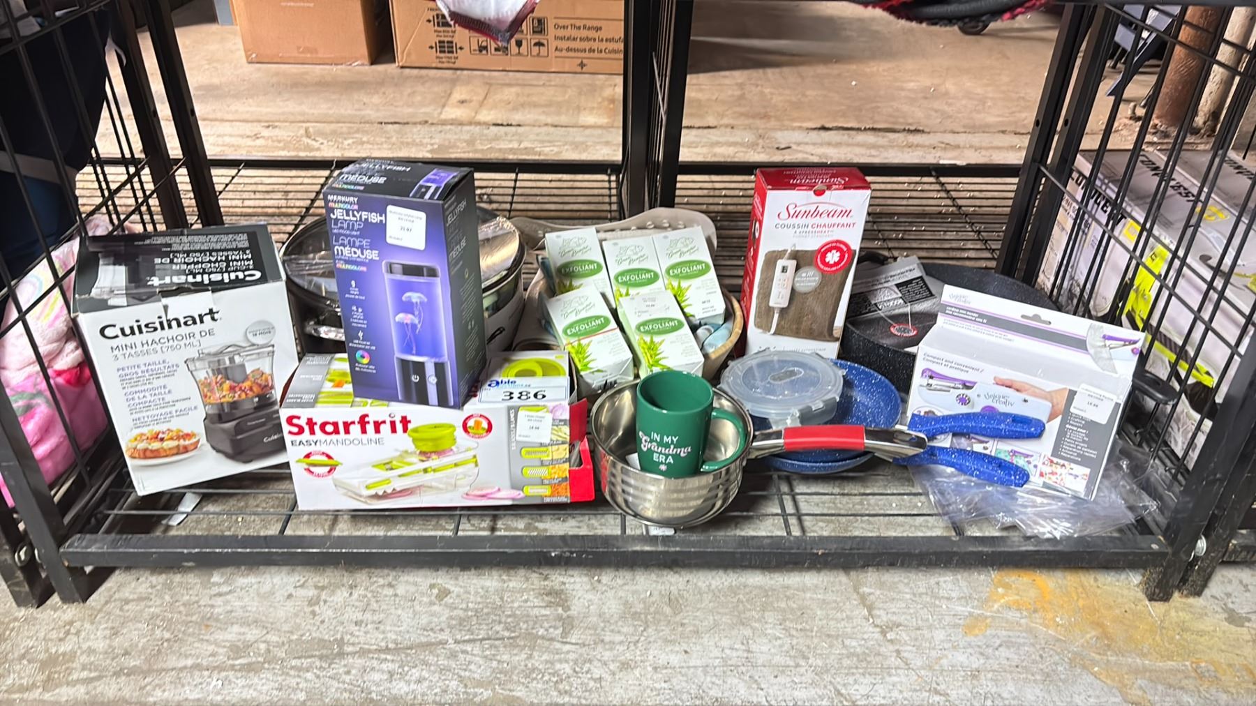 SHELF OF ASSORTED ITEMS INCLUDING; STARFRIT EASY MONDOLINE, CUISINART MINI CHOPPER, ALOE EXFOLIANT