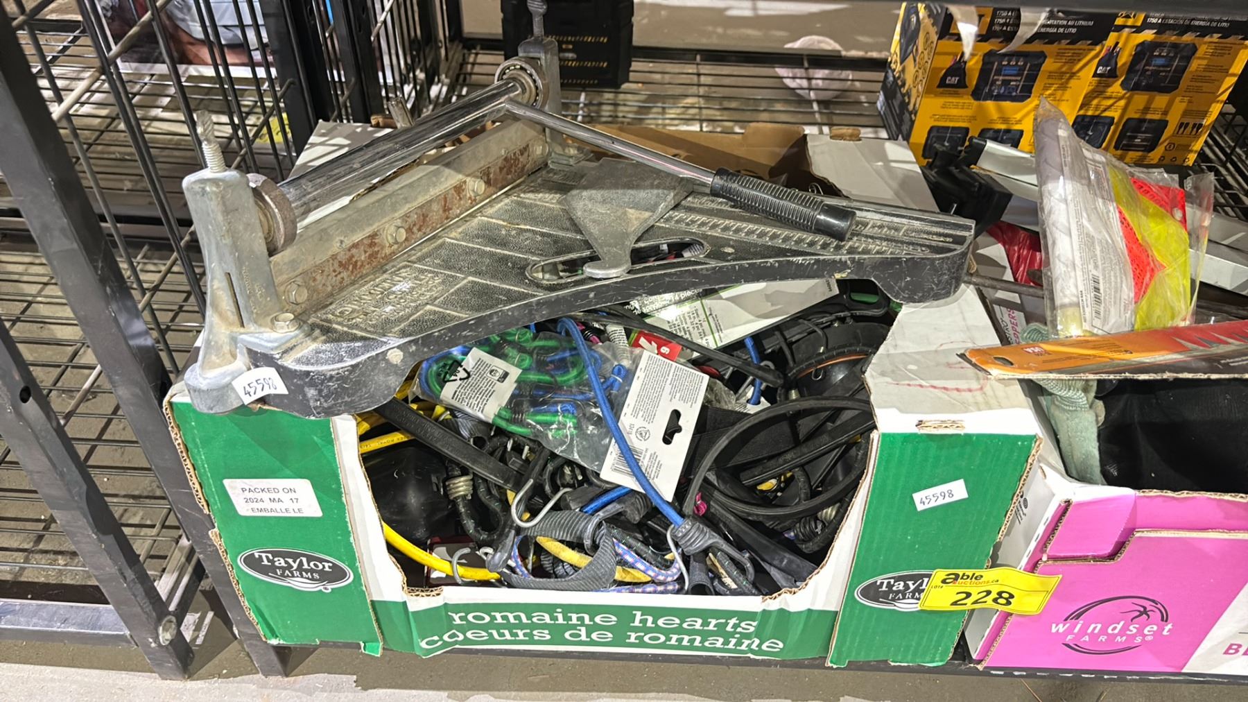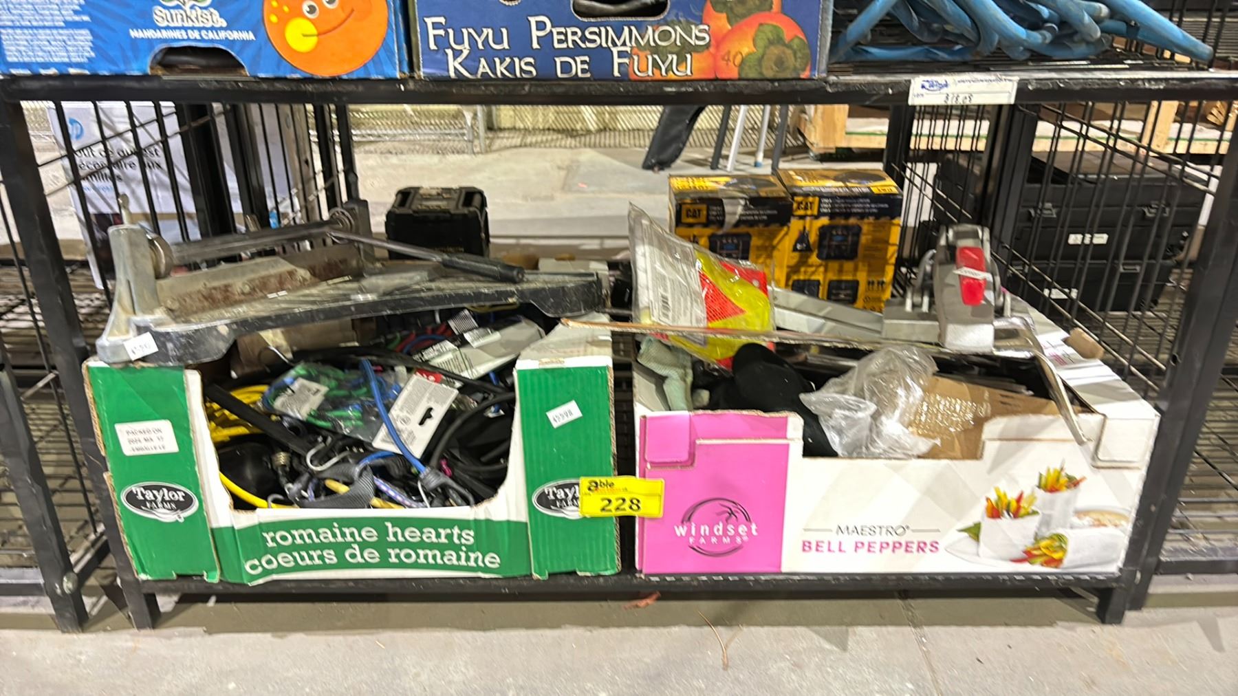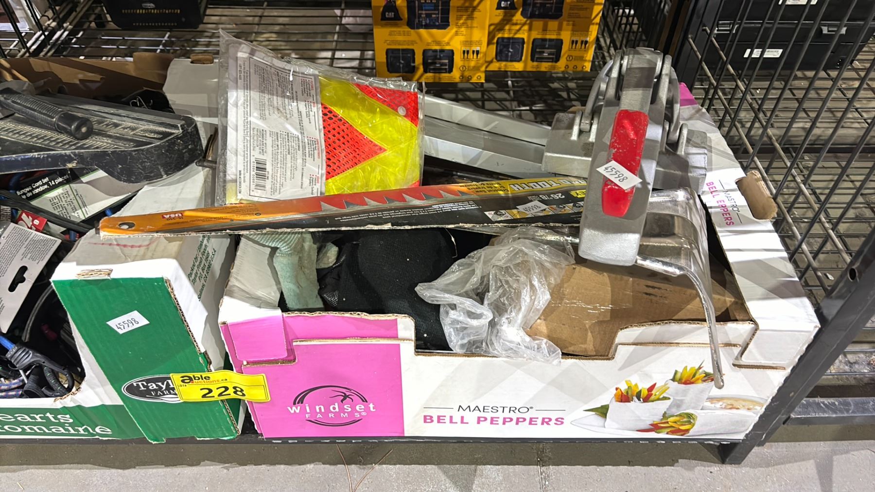 SHELF OF ASSORTED ITEMS INCLUDING; TRAFFIC VEST, TILE CUTTER, CARPET STRETCHER & MORE