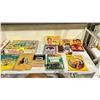 SHELF OF ASSORTED ITEMS INCLUDING; VINTAGE BOARD GAMES, BOOKS, BLACKJACK DEALING MACHINE & MORE