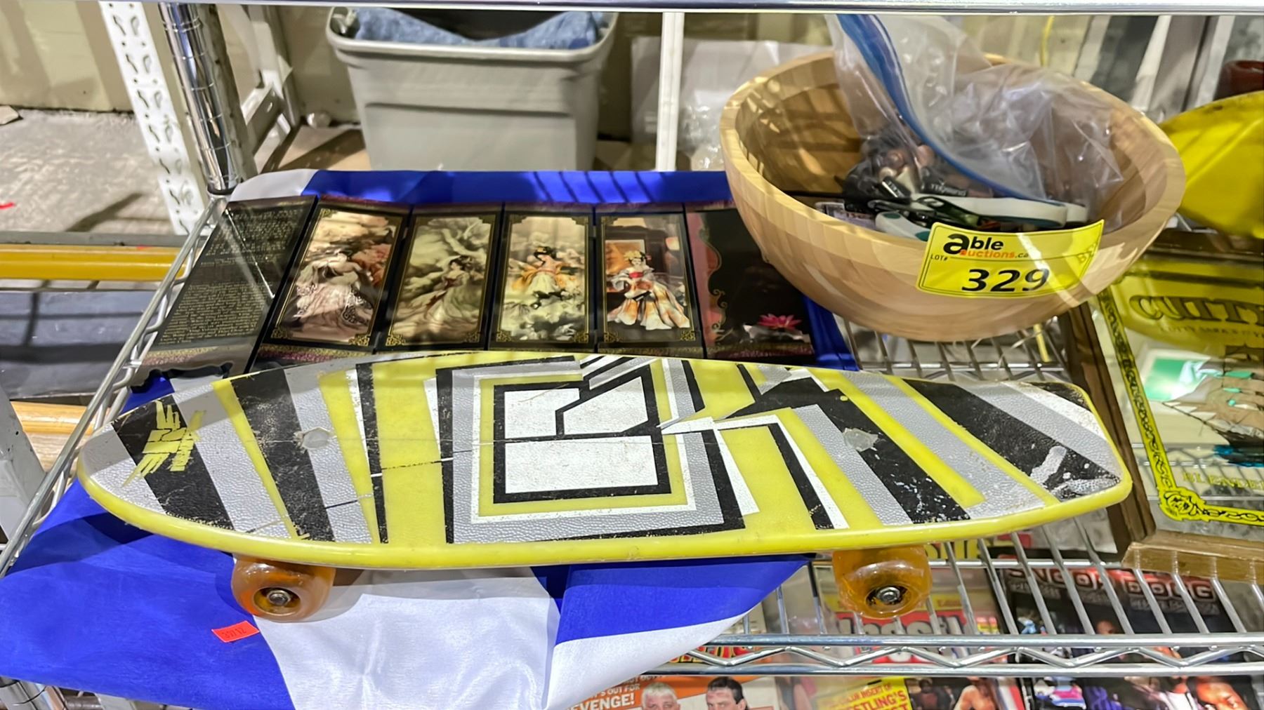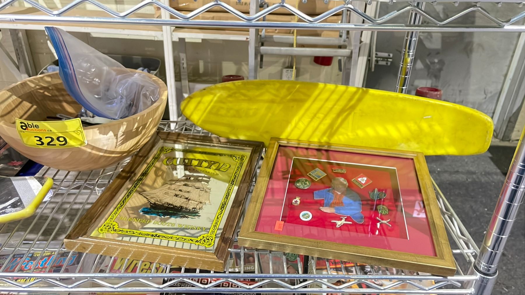 SHELF OF ASSORTED ITEMS INCLUDING; VINTAGE SKATEBOARDS, FRAMED MIRRORED SCOTS WHISKEY ADVERT, PAINTED DESK 6 PANEL DIVIDER & MORE