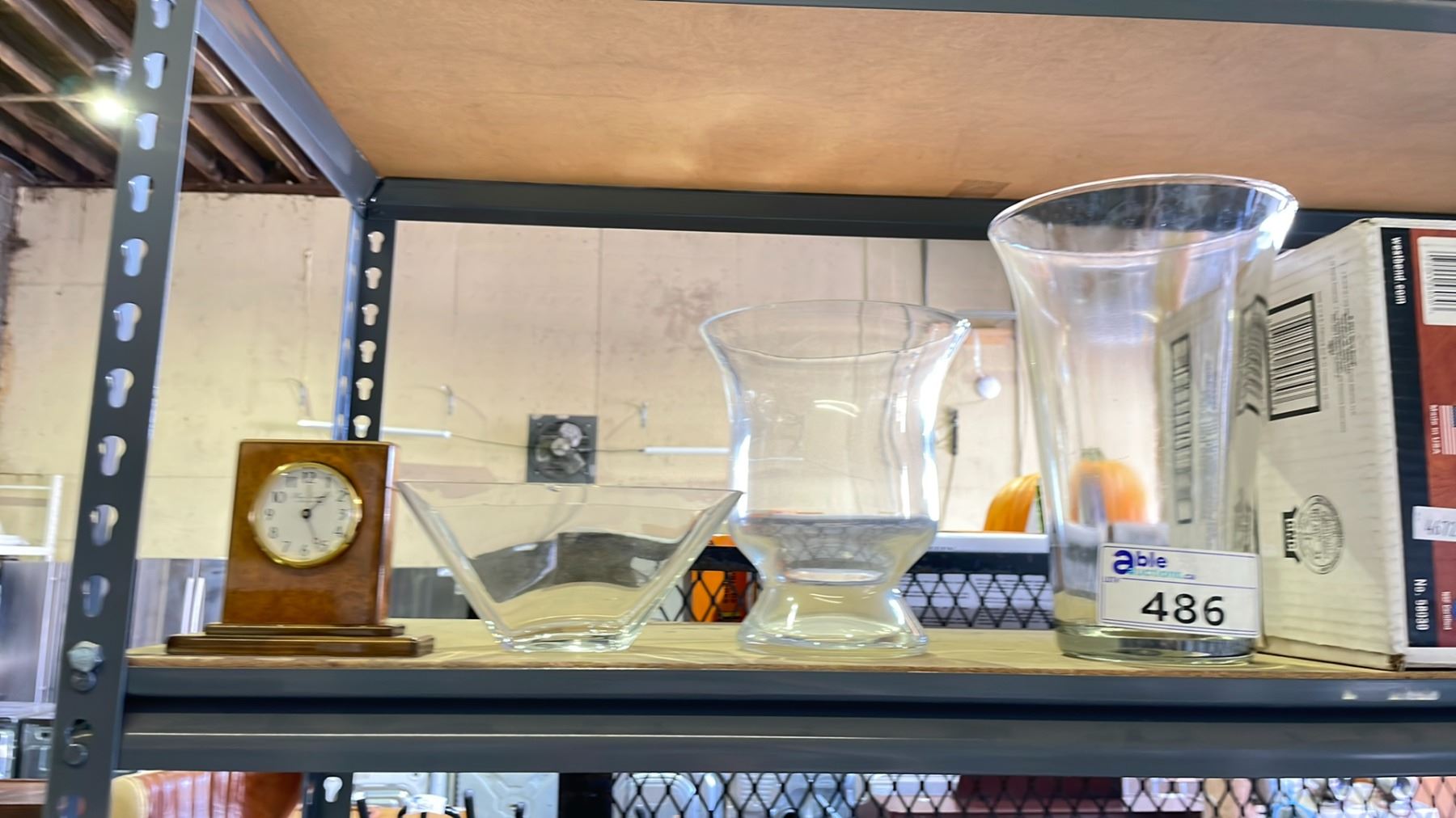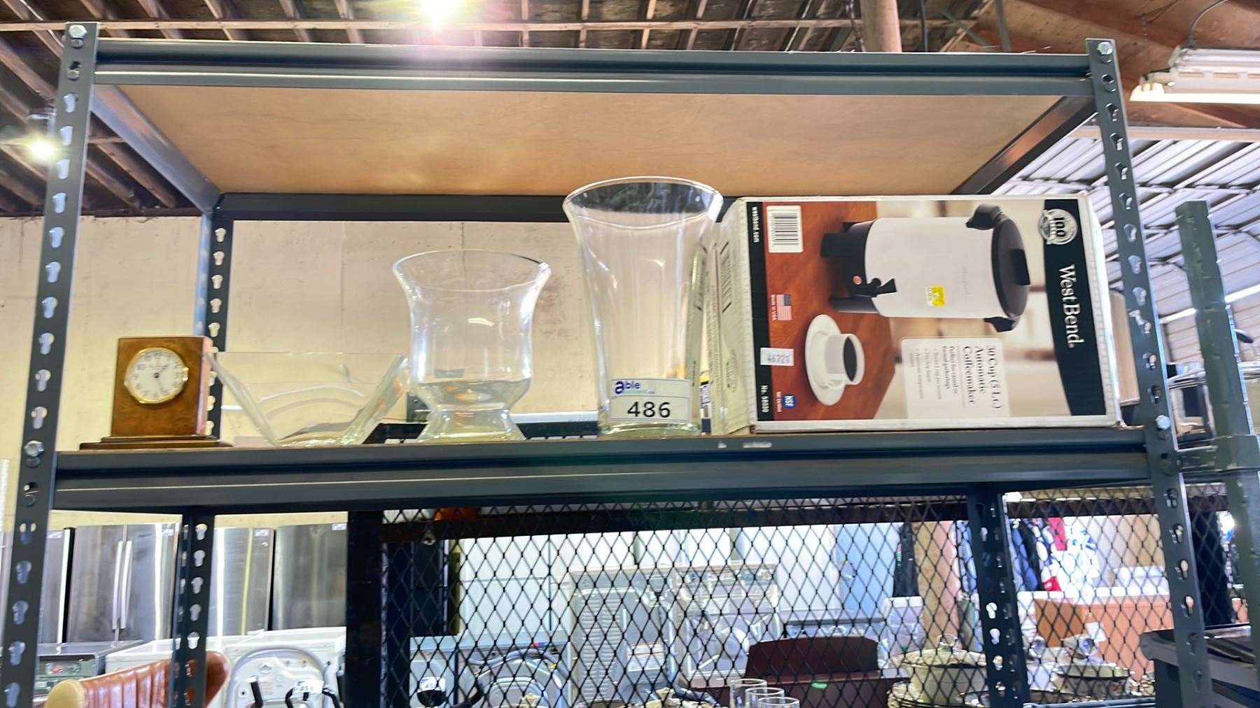 SHELF OF ASSORTED ITEMS INCLUDING; WESTBEND 30 CUP AUTOMATIC COFFEE MAKER, GLASS VASES, DESK CLOCK & GLASS BOWL