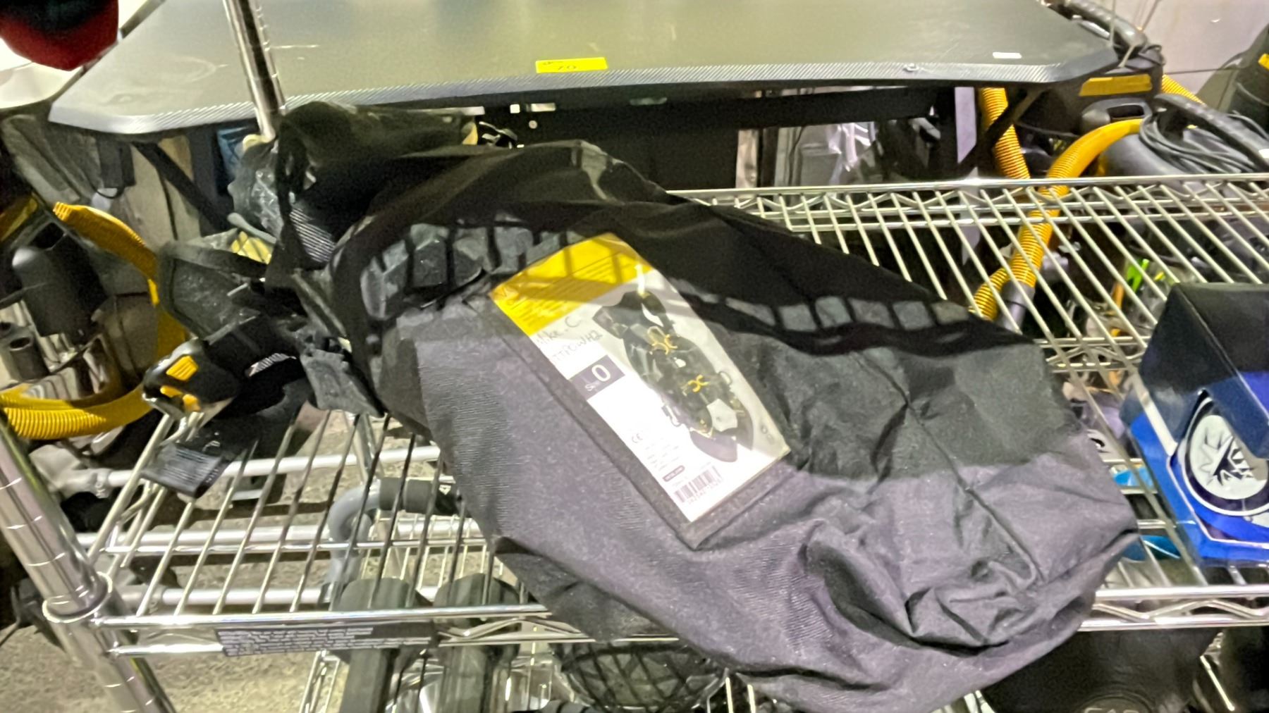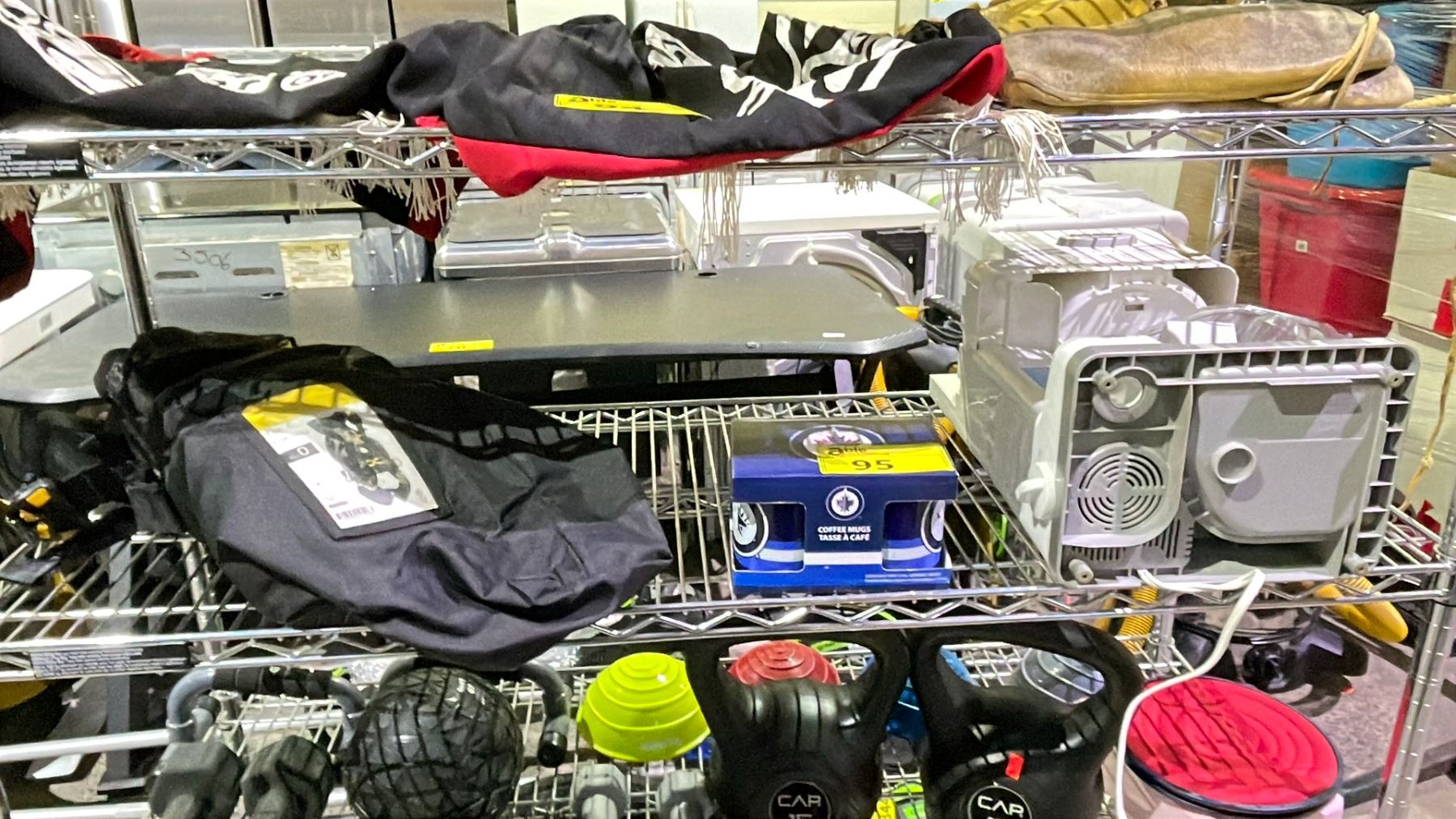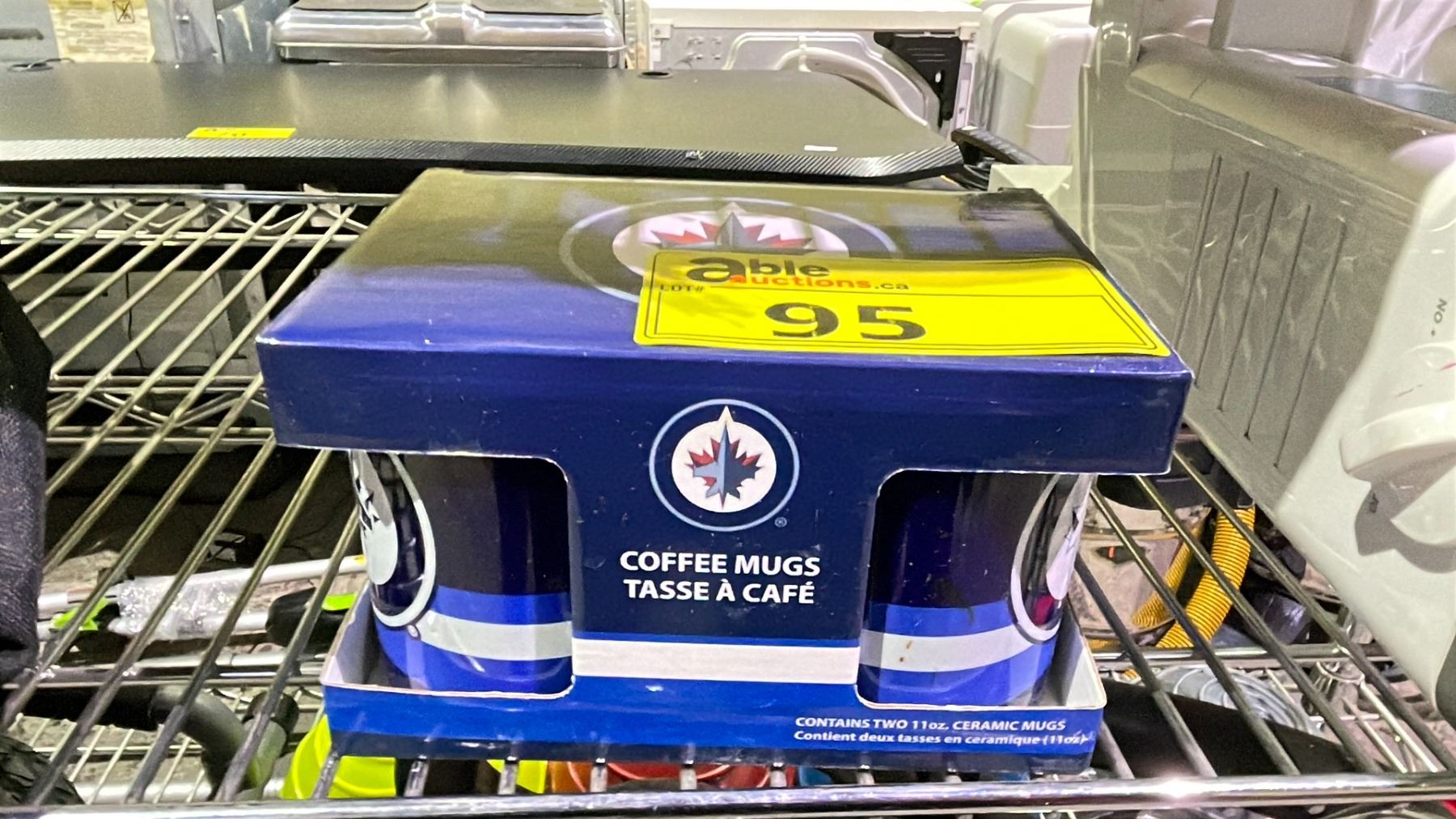 SHELF OF ASSORTED ITEMS INCLUDING; WINNIPEG JETS COFFEE MUGS, CUISINART SOFT SERVE ICE CREAM MAKER & FALL ARREST VEST