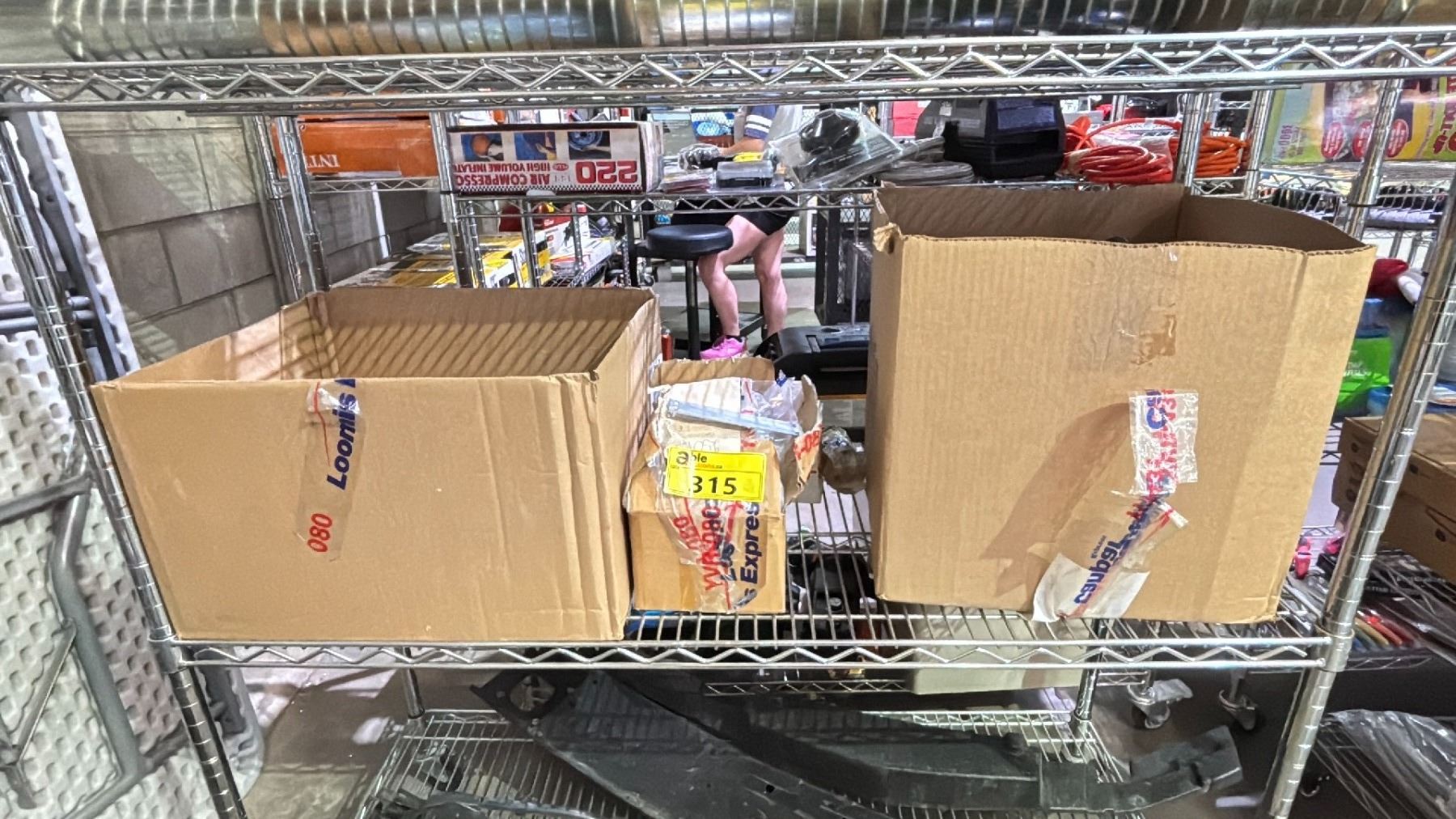 SHELF OF ASSORTED ITEMS INCLUDING; WOOD SCREWS, RUBBER PIPE CAPS, SMALL METAL PLATES & MORE