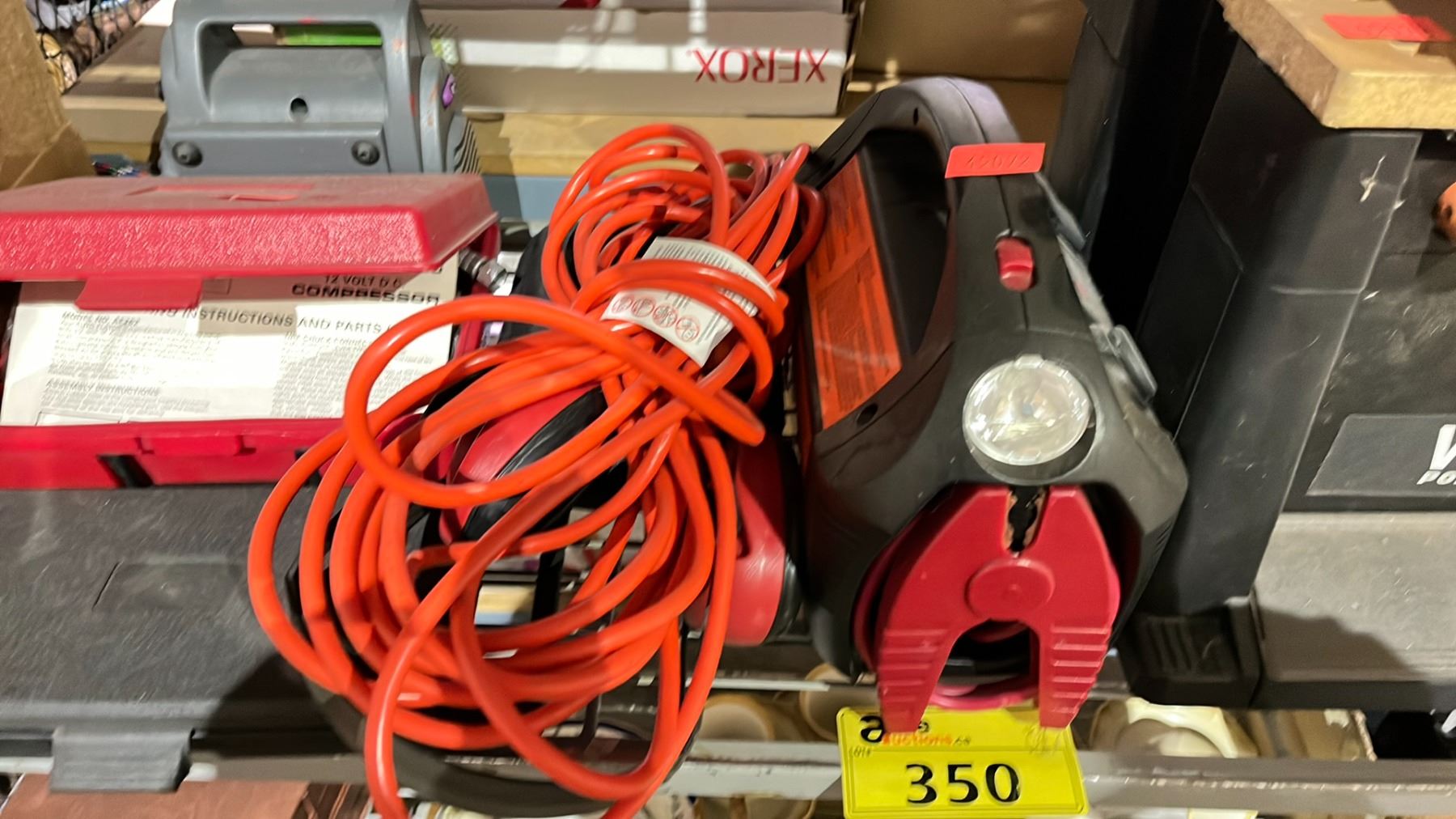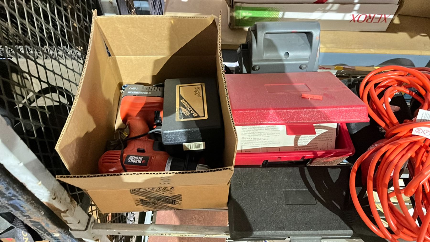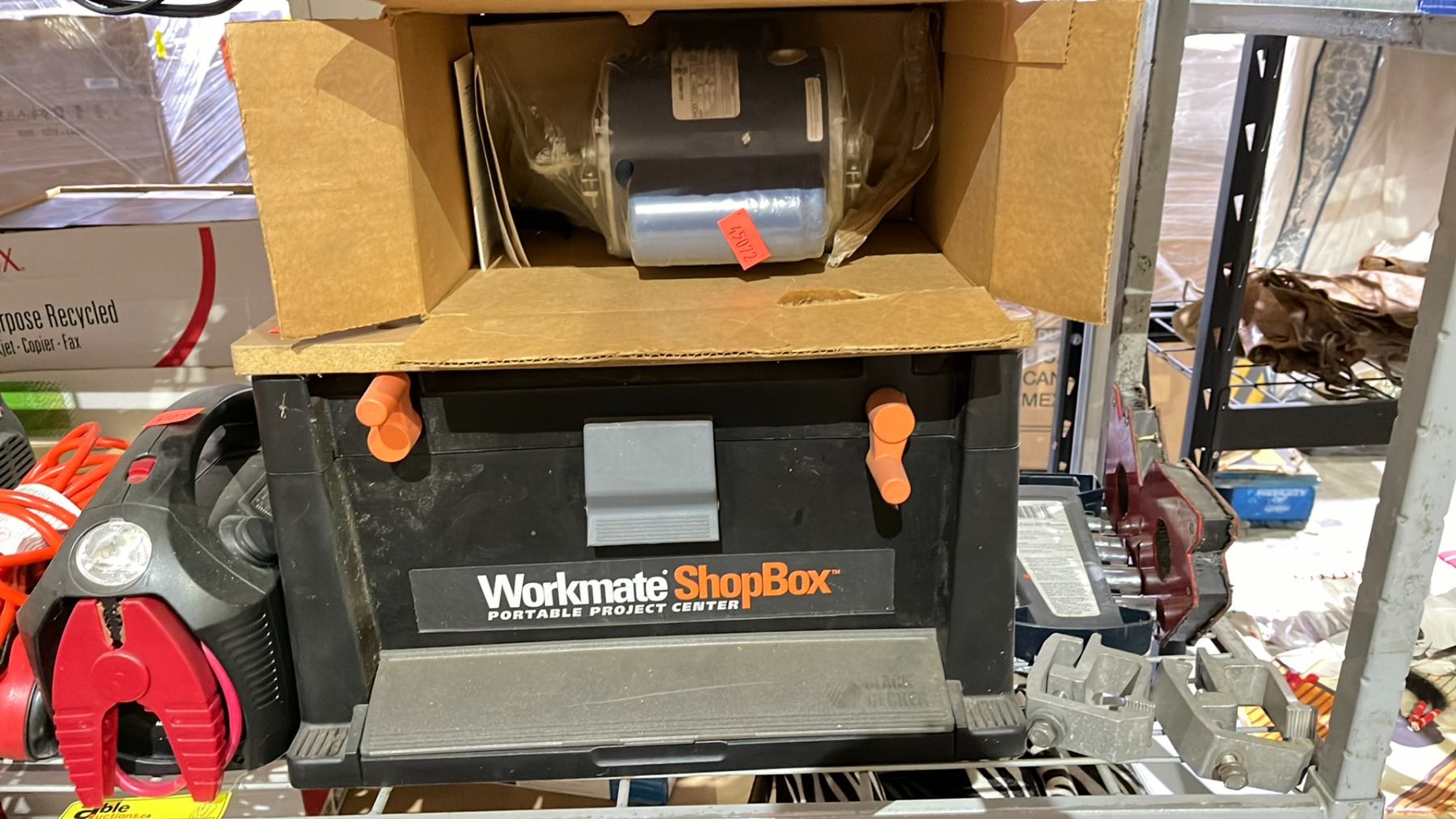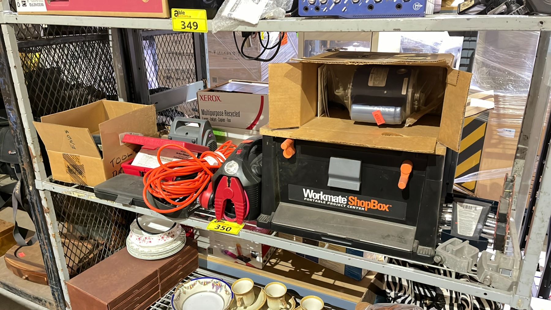 SHELF OF ASSORTED ITEMS INCLUDING; WORKMATE SHOPBOX, RATCHET SET, MOTOMASTER ELIMINATOR BATTERY PACK & MORE