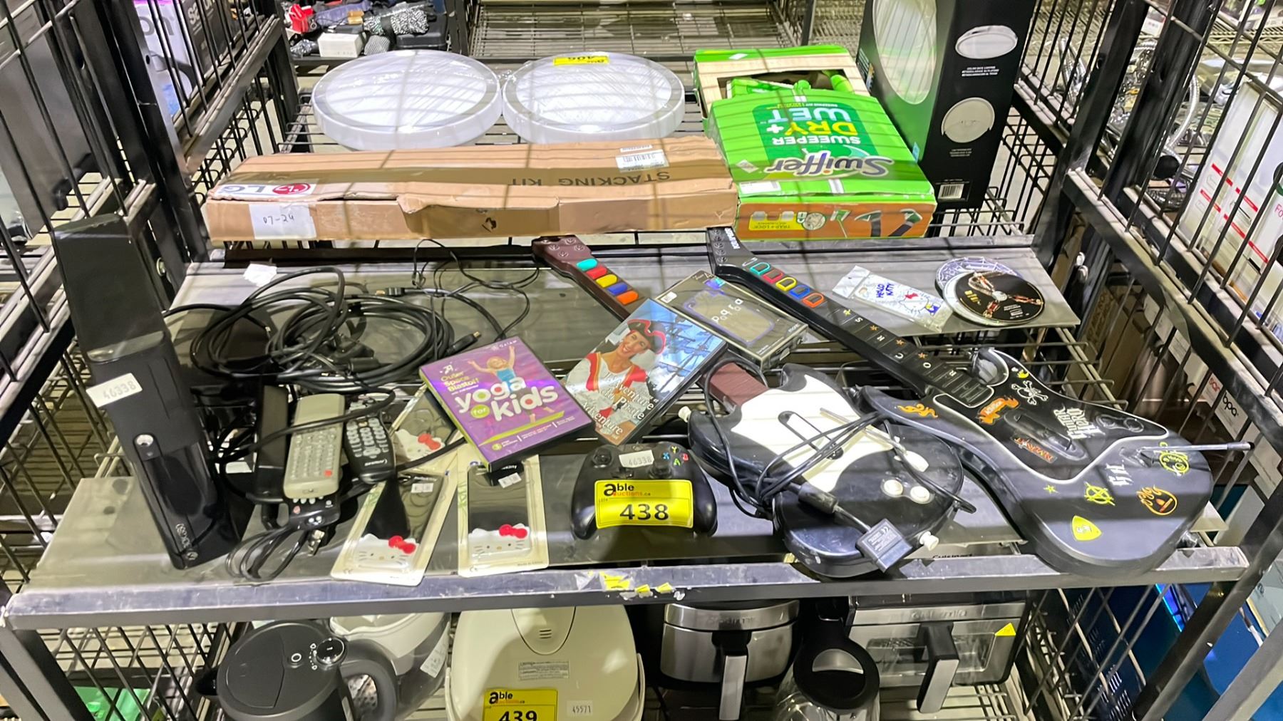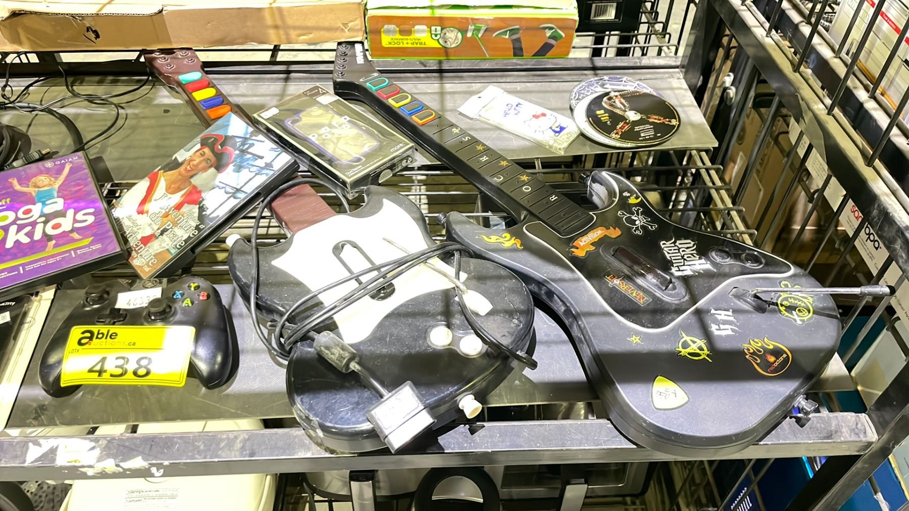 SHELF OF ASSORTED ITEMS INCLUDING; XBOX 360, GUITAR HERO GUITARS, PHONE CASES & MORE