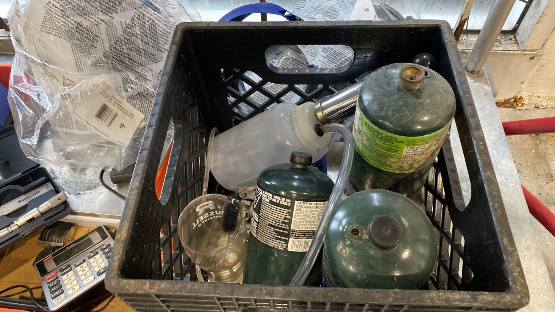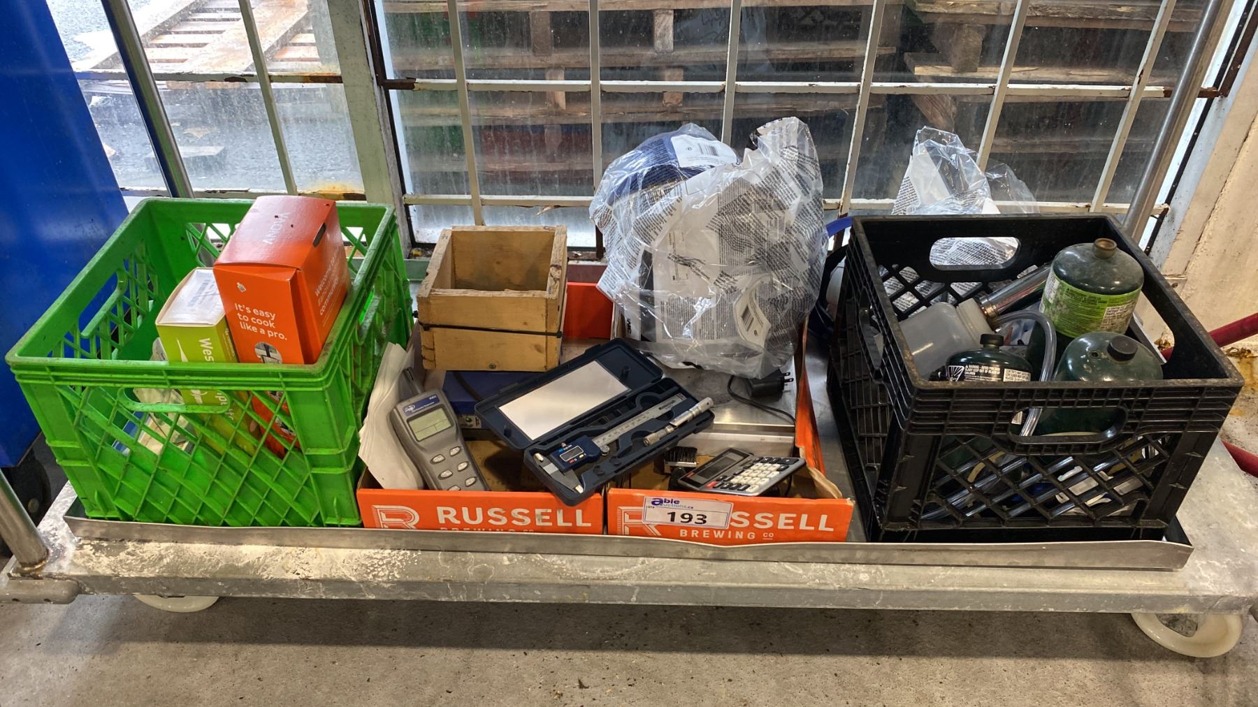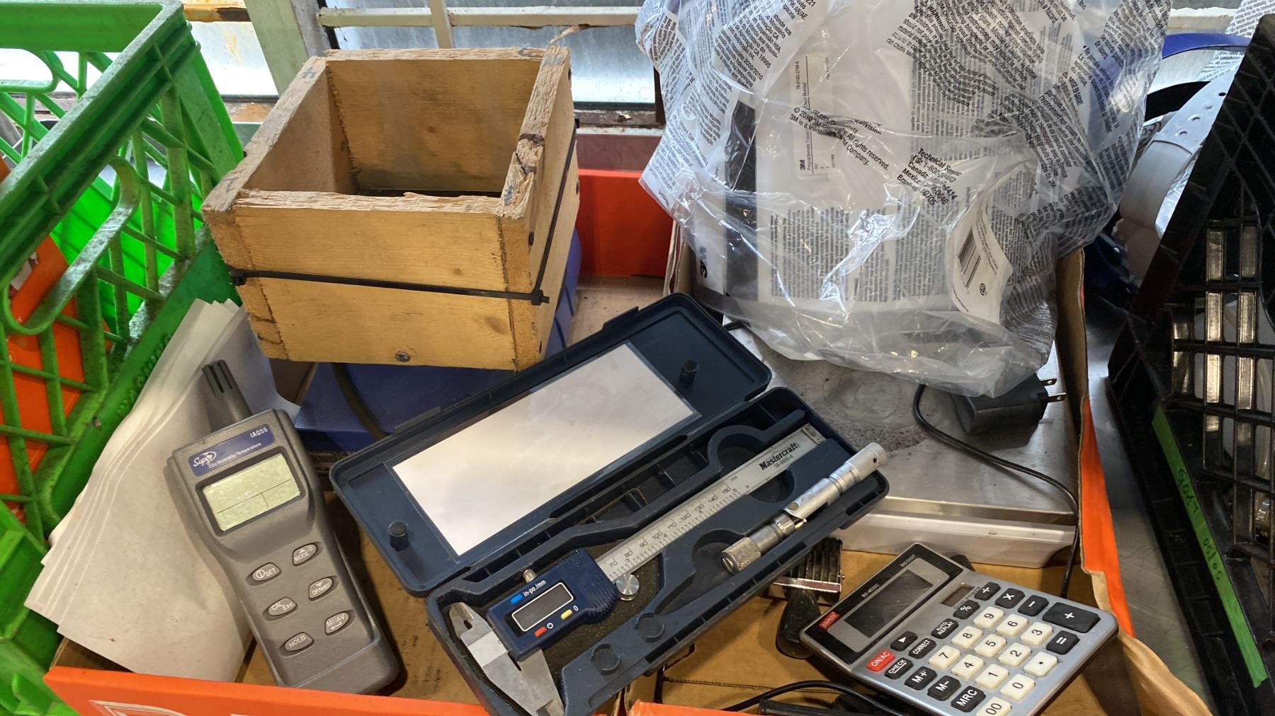 SHELF OF ASSORTED ITEMS- RED PIPE STAND, WEIGH SCALES, PROTECTIVE FACE SHIELDS, PRECISION INSTRUMENTS AND MORE