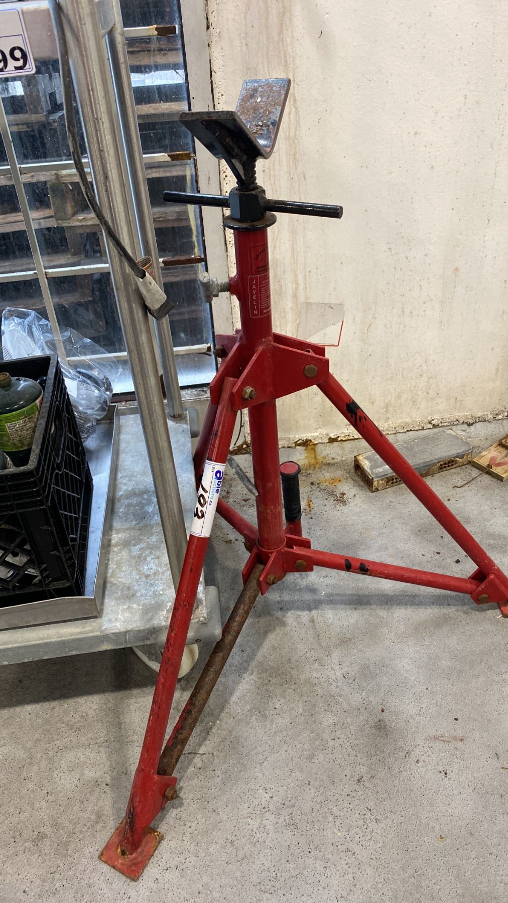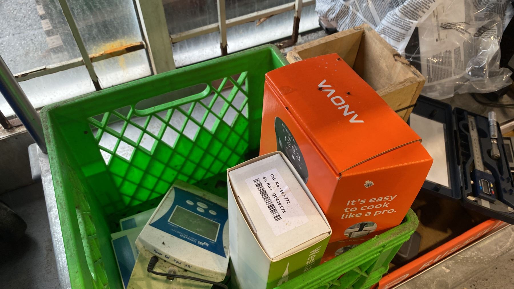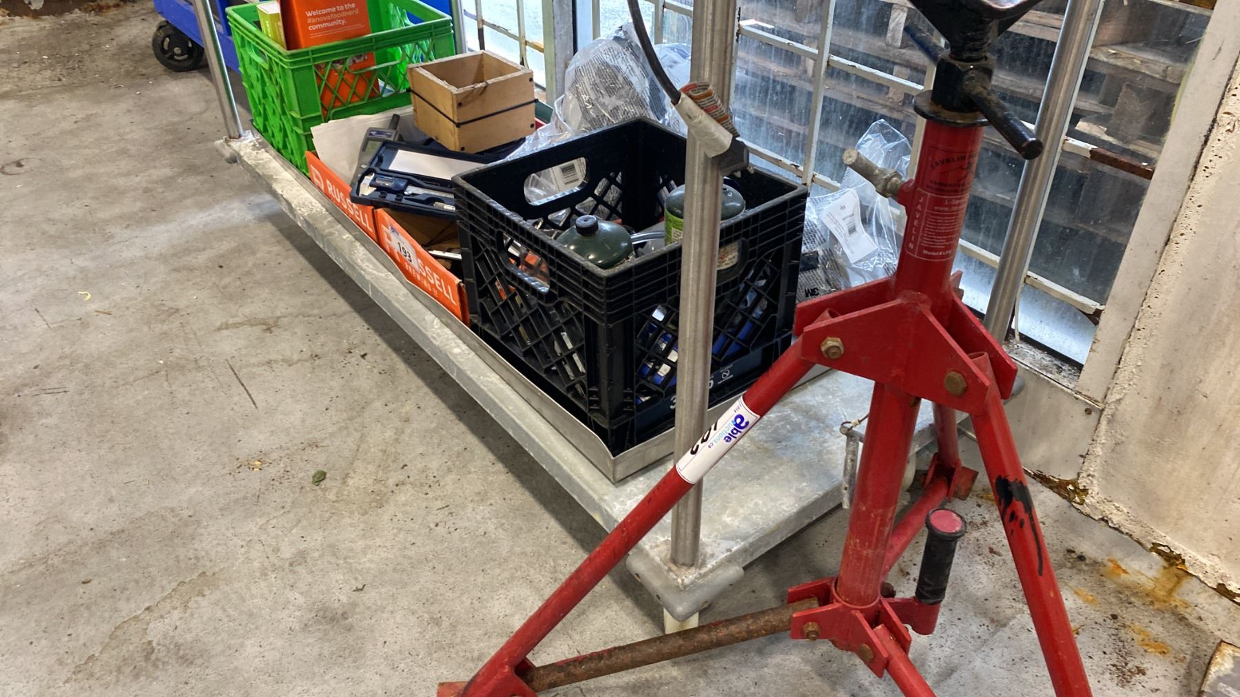 SHELF OF ASSORTED ITEMS- RED PIPE STAND, WEIGH SCALES, PROTECTIVE FACE SHIELDS, PRECISION