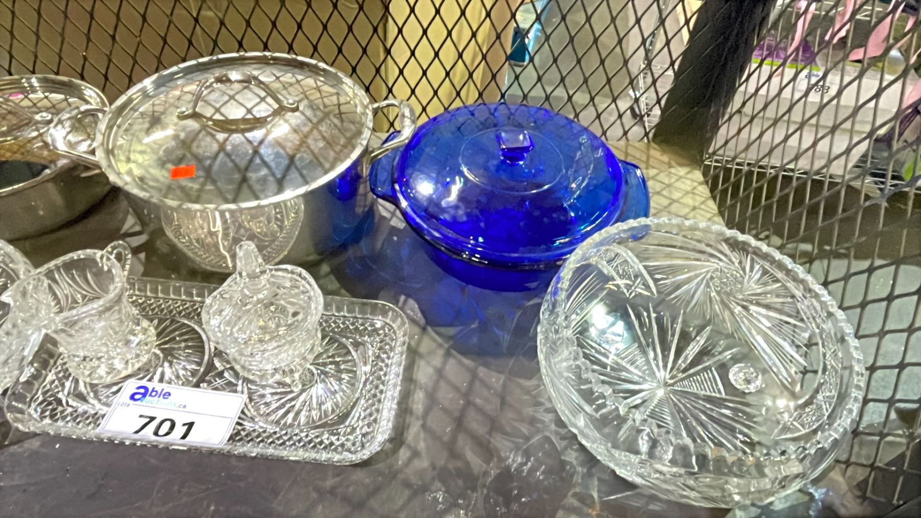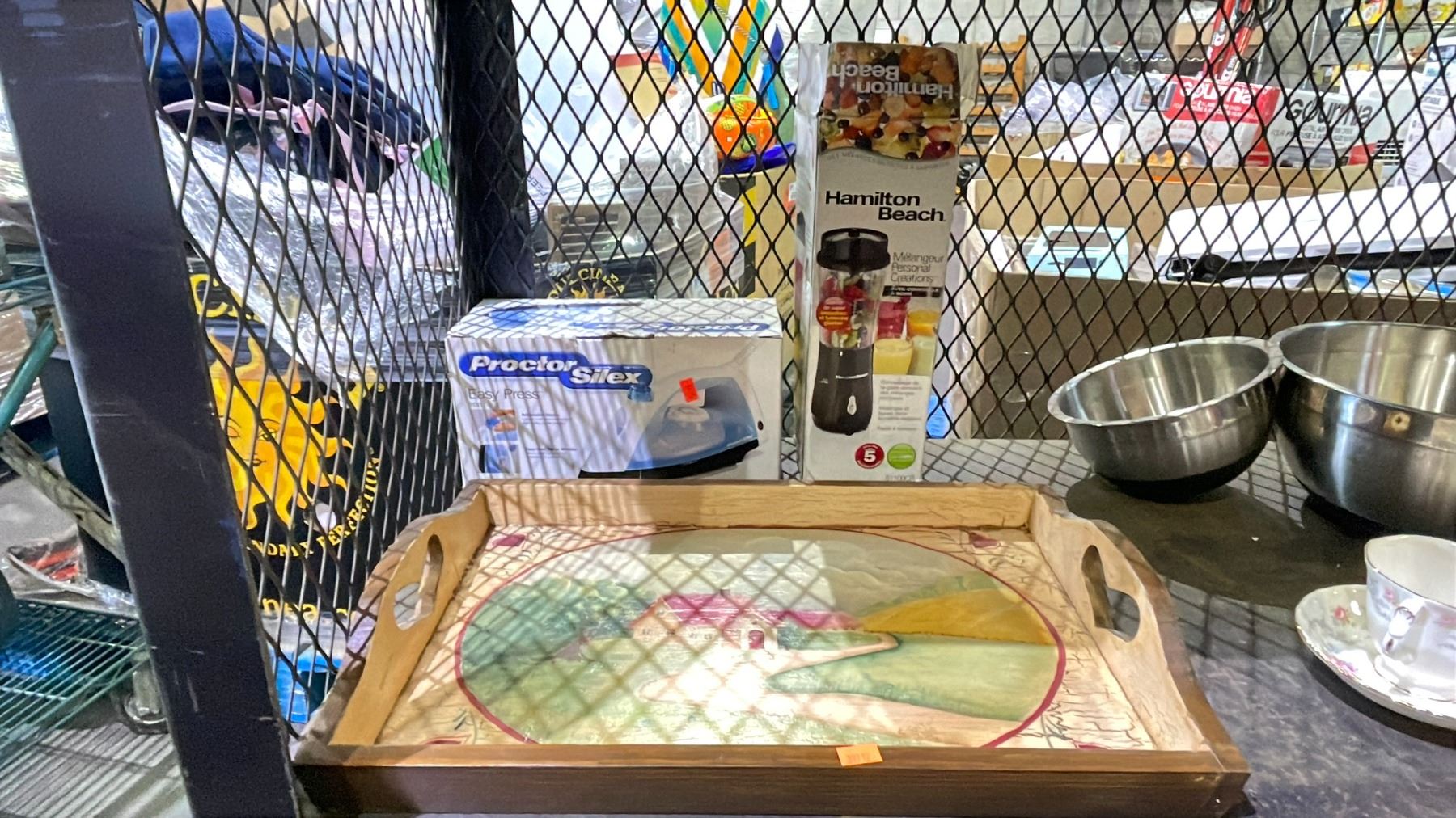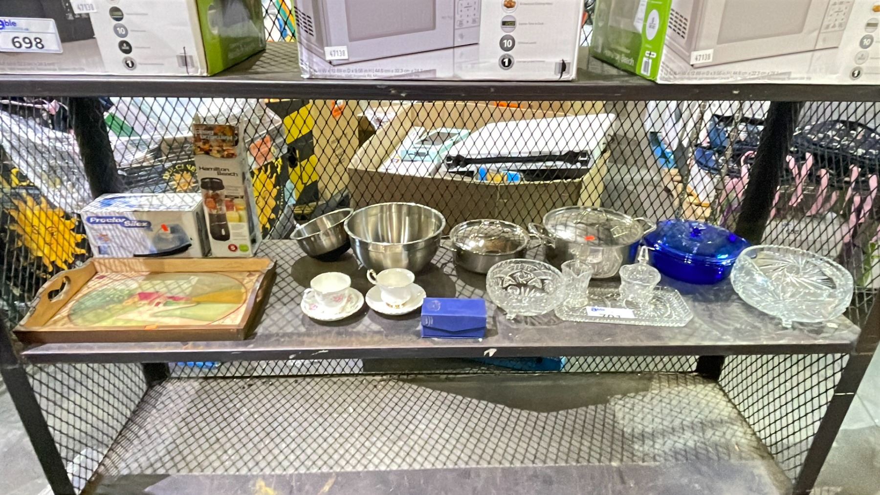 SHELF OF ASSORTED KITCHEN ITEMS: POTS, CASSEROLE DISH, BLENDER, IRON & MORE