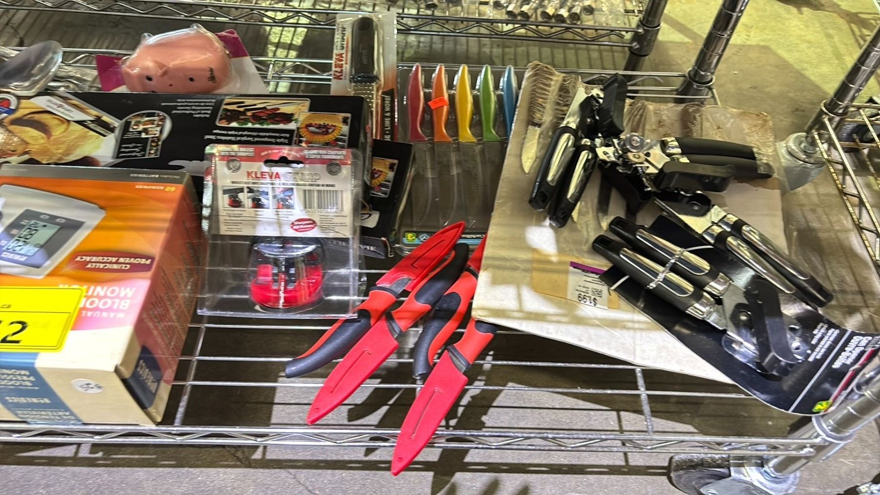 SHELF OF ASSORTED KITCHEN UTENSILS/CUTLERY, KITCHEN SCALES & MORE