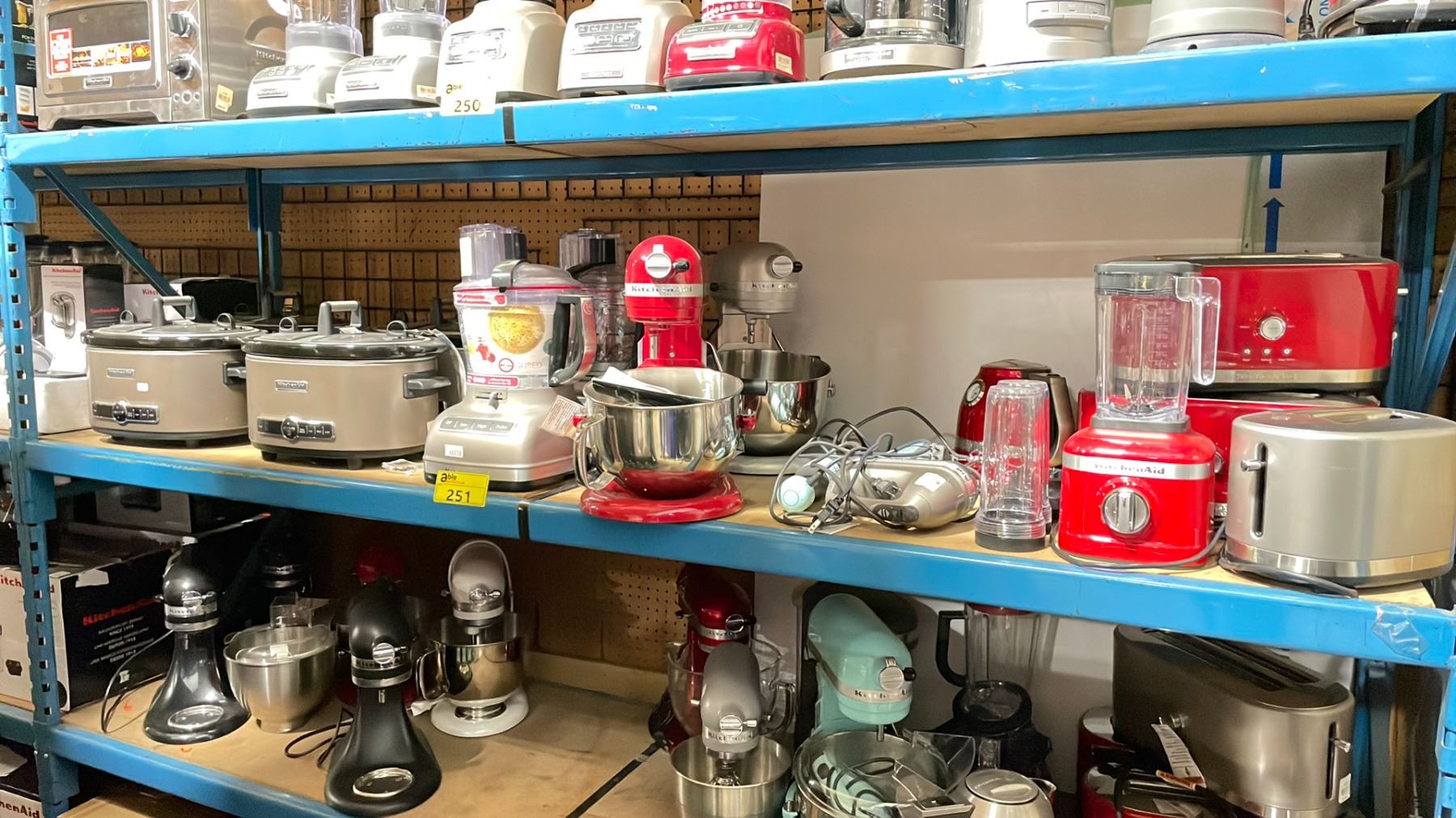 SHELF OF ASSORTED KITCHENAID DISPLAY/RETURN APPLIANCES *UNKNOWN WORKING CONDITION* INCLUDING CROCKPOTS, FOOD PROCESSORS, STAND MIXERS, HAND MIXERS, KETTLE, BLENDERS TOASTERS
