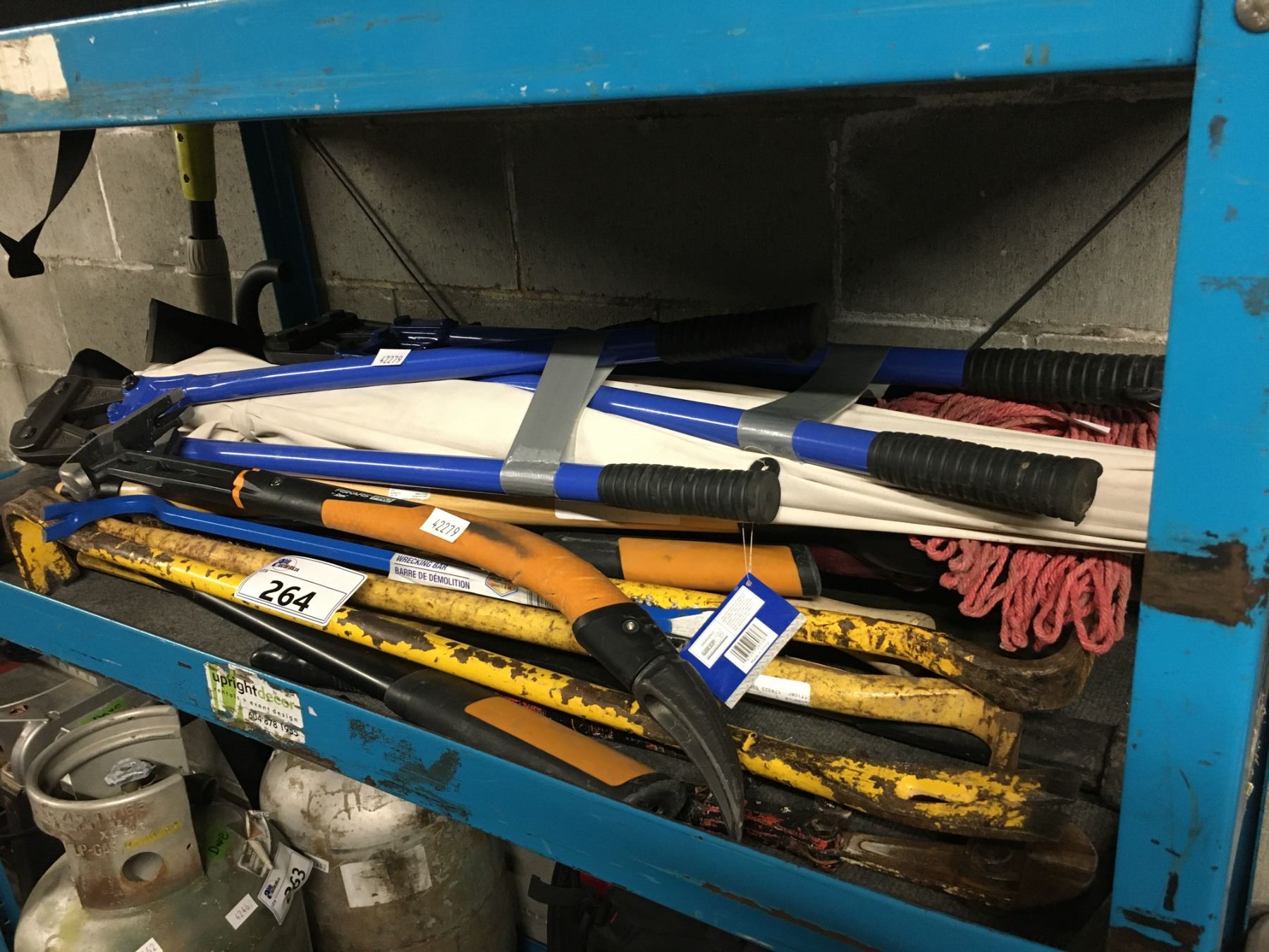 SHELF OF ASSORTED LARGE HAND TOOLS INCLUDING RYOBI ELECTRIC HIGH REACH 8" CHAINSAW BOLT CUTTERS, PRYBARS, PICKAXES AND CROWBARS