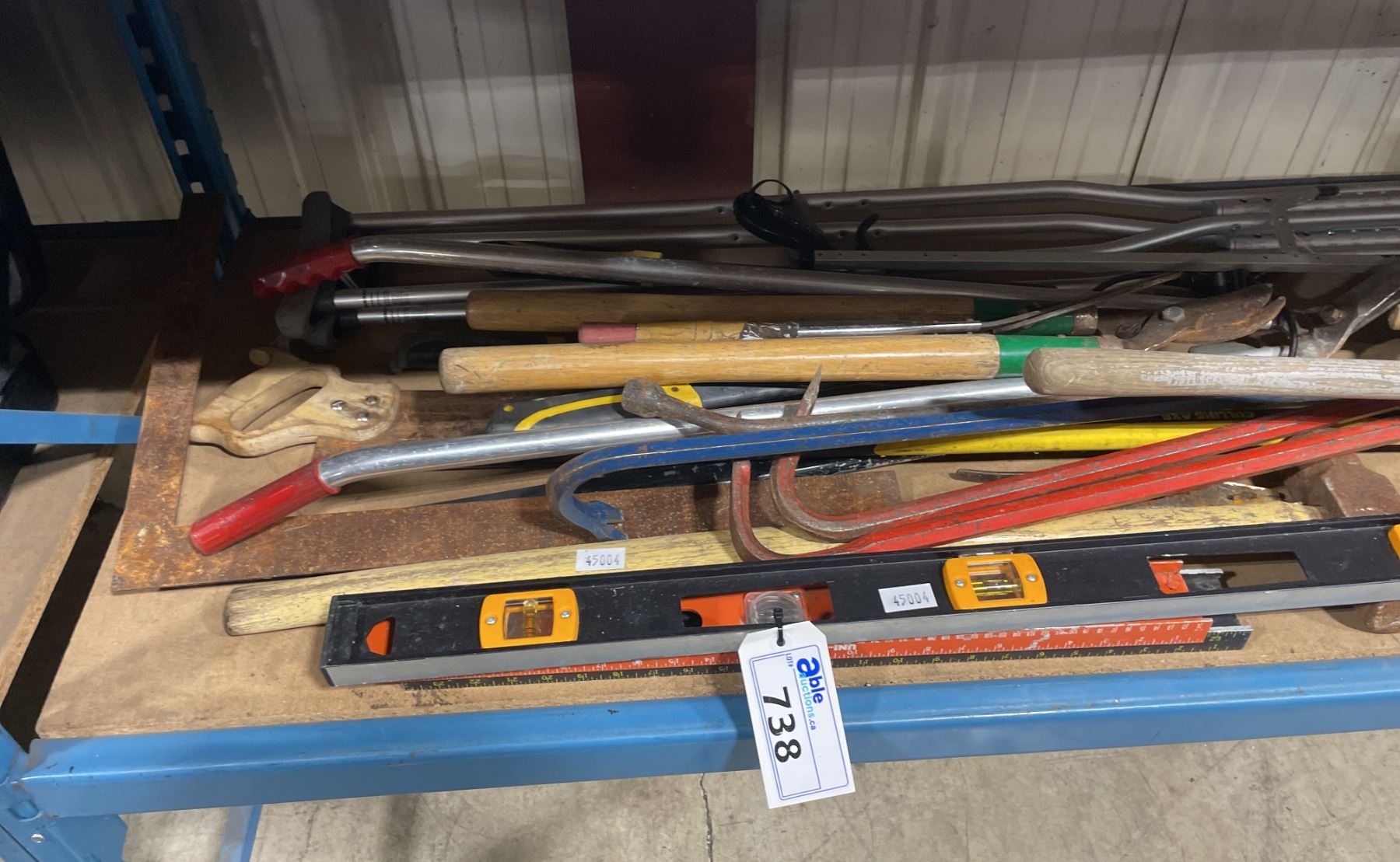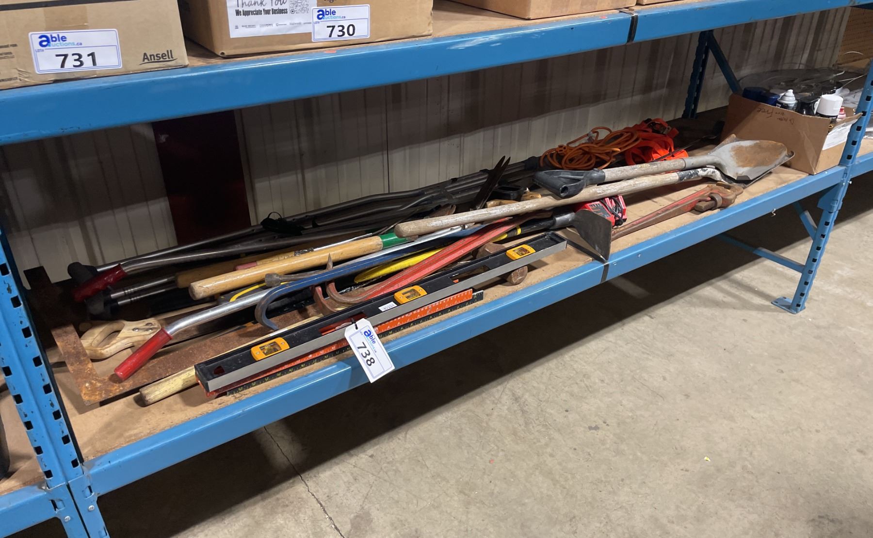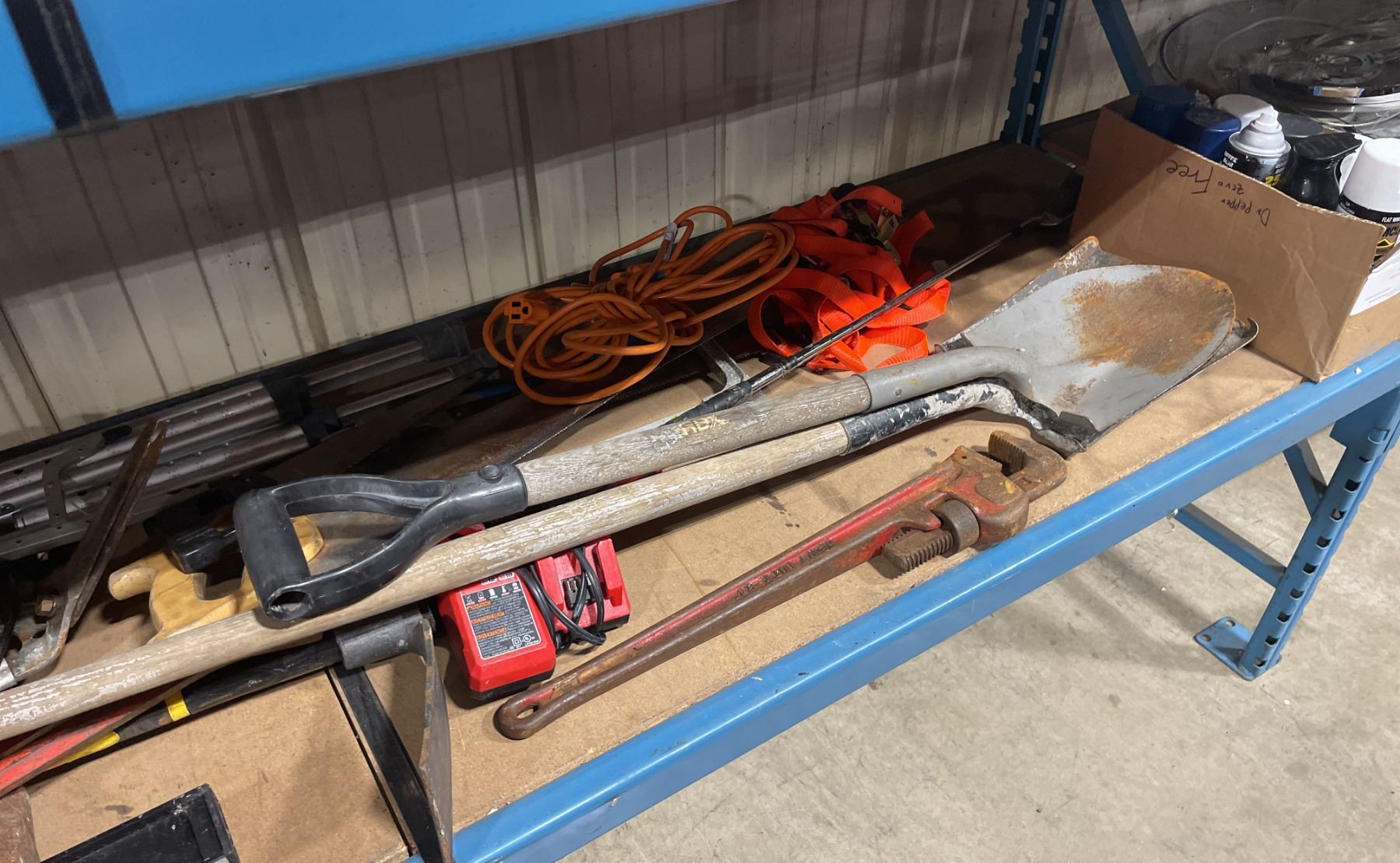 SHELF OF ASSORTED LARGE TOOLS, YARD TOOLS, & SPRAY PAINT