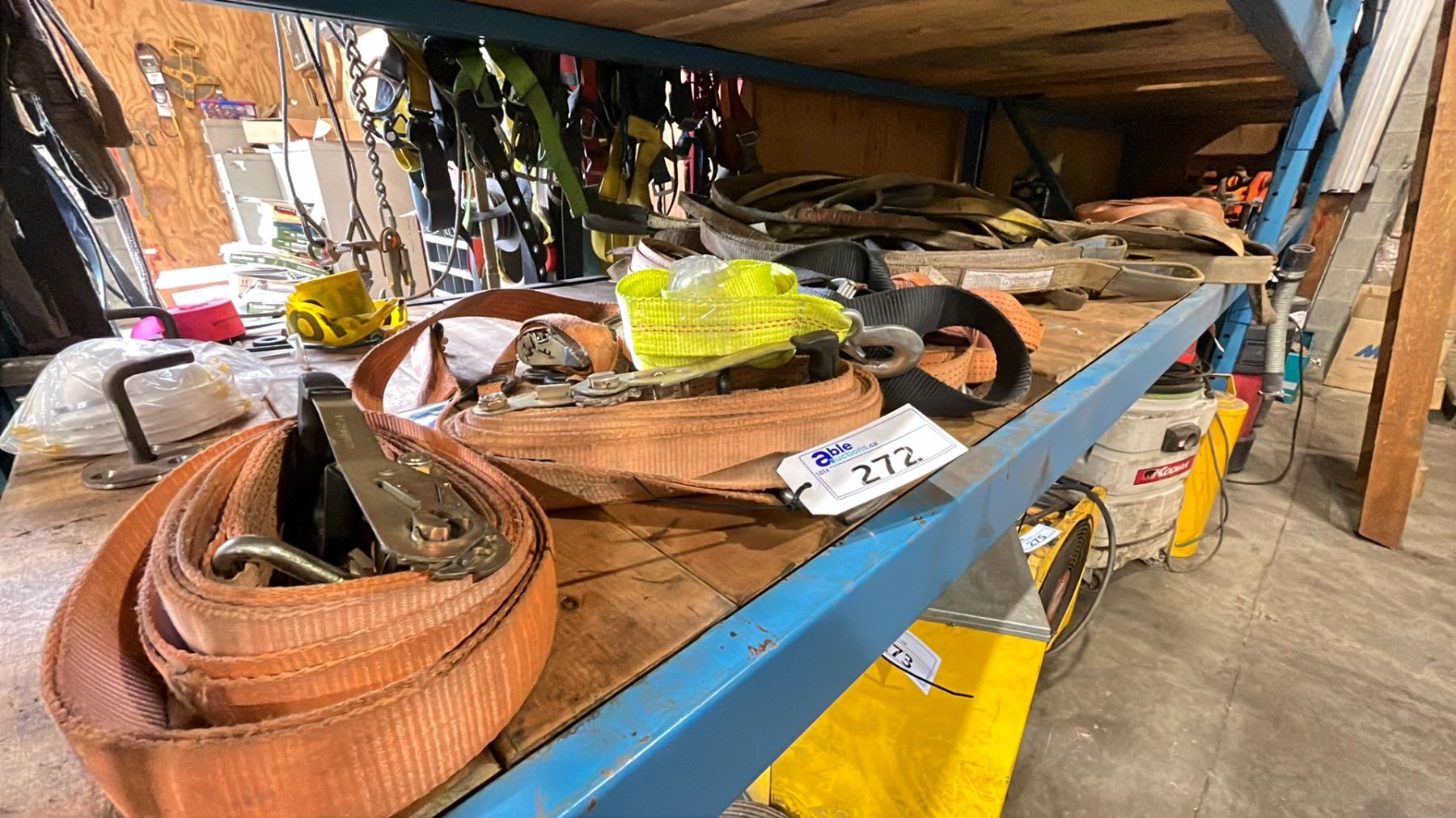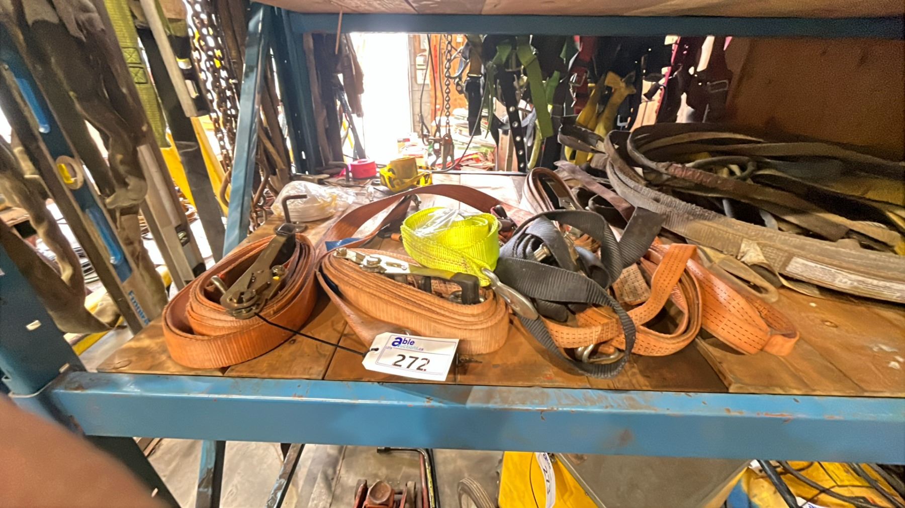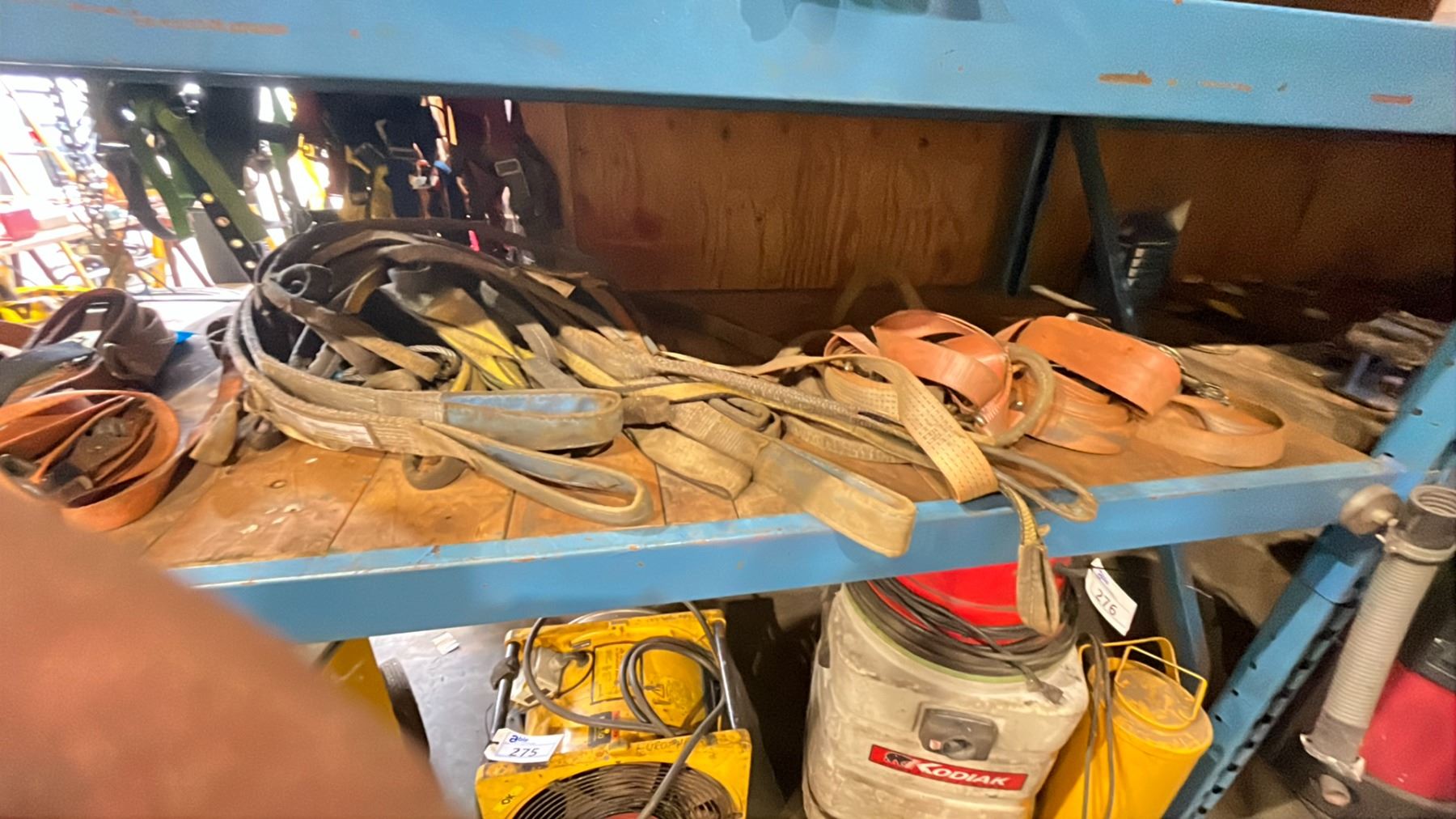 SHELF OF ASSORTED LIFTING SLINGS & RATCHET TIE DOWNS