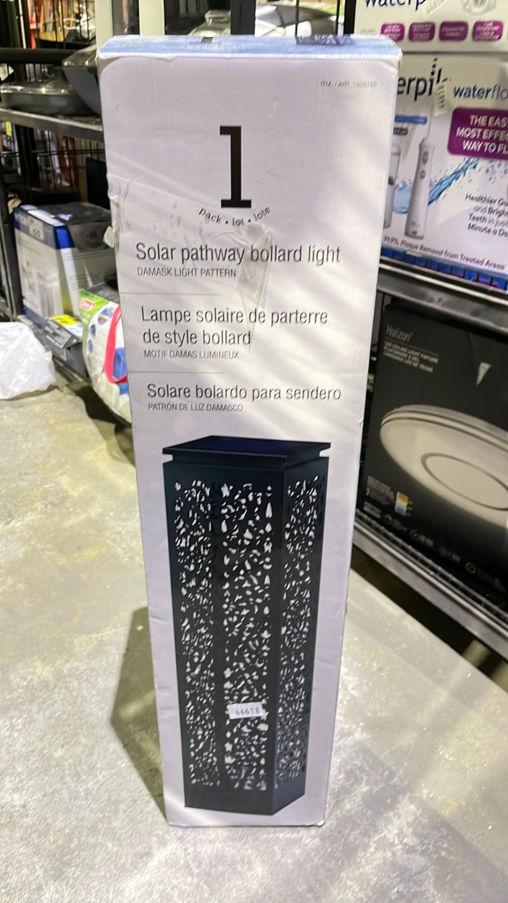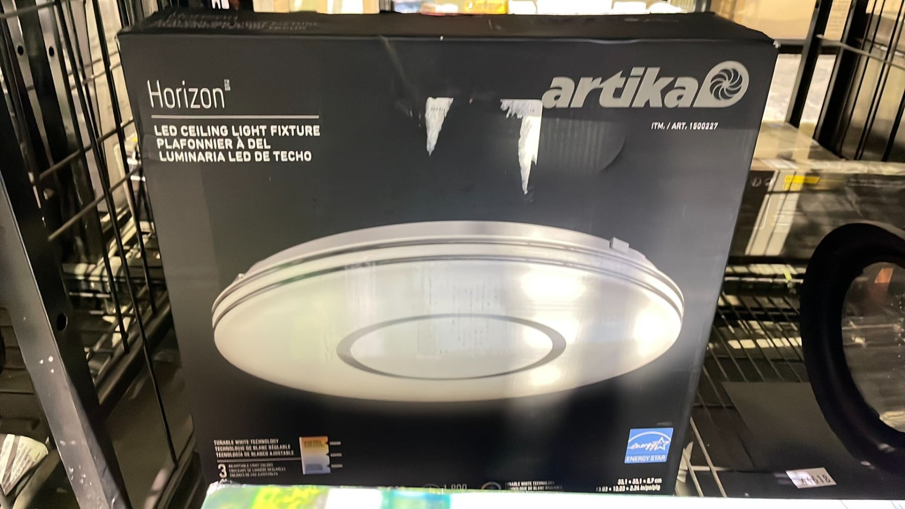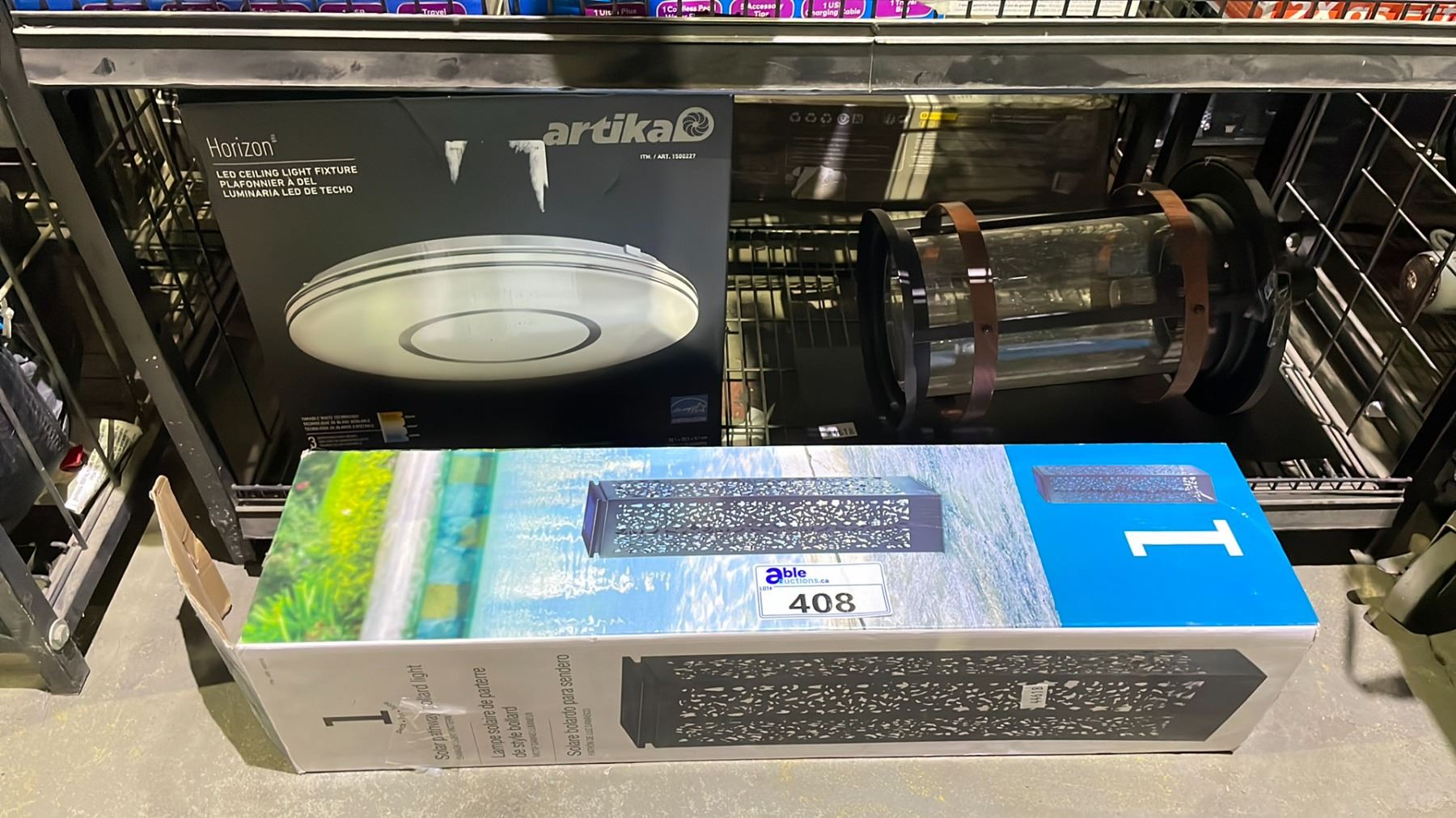 SHELF OF ASSORTED LIGHTING INCLUDING; LED CEILING LIGHT, SOLAR PATHWAY BOLLARD LIGHT & OUTDOOR LED LIGHT FIXTURE