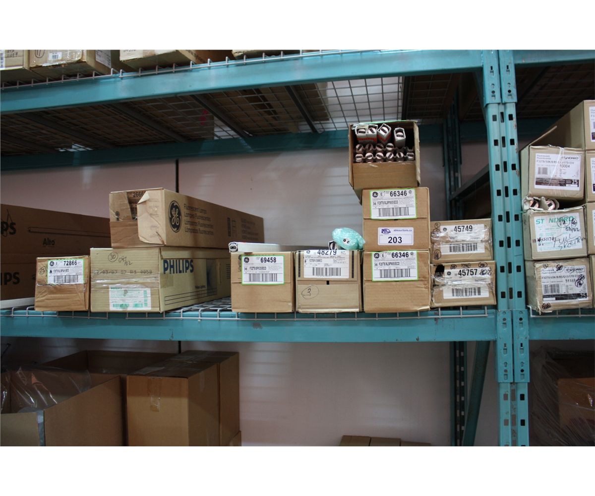 SHELF OF ASSORTED LIGHTING PRODUCTS ( LOCATED ON BLUE PALLET RACKING )