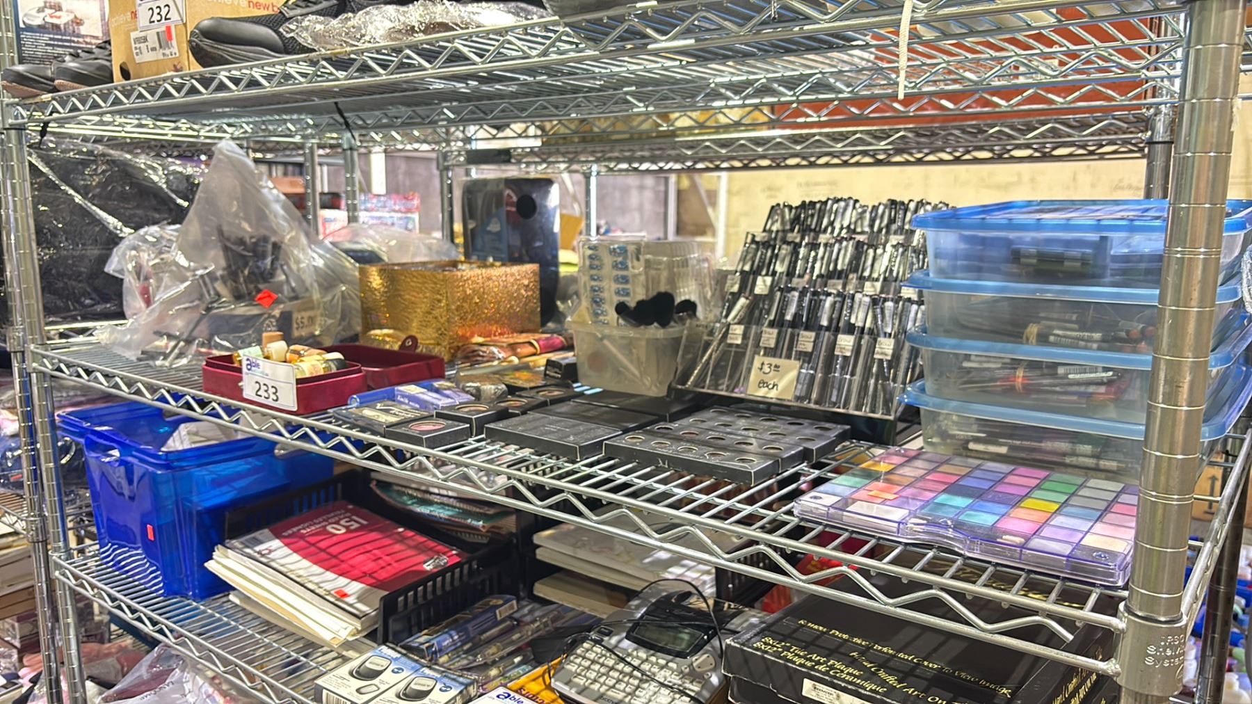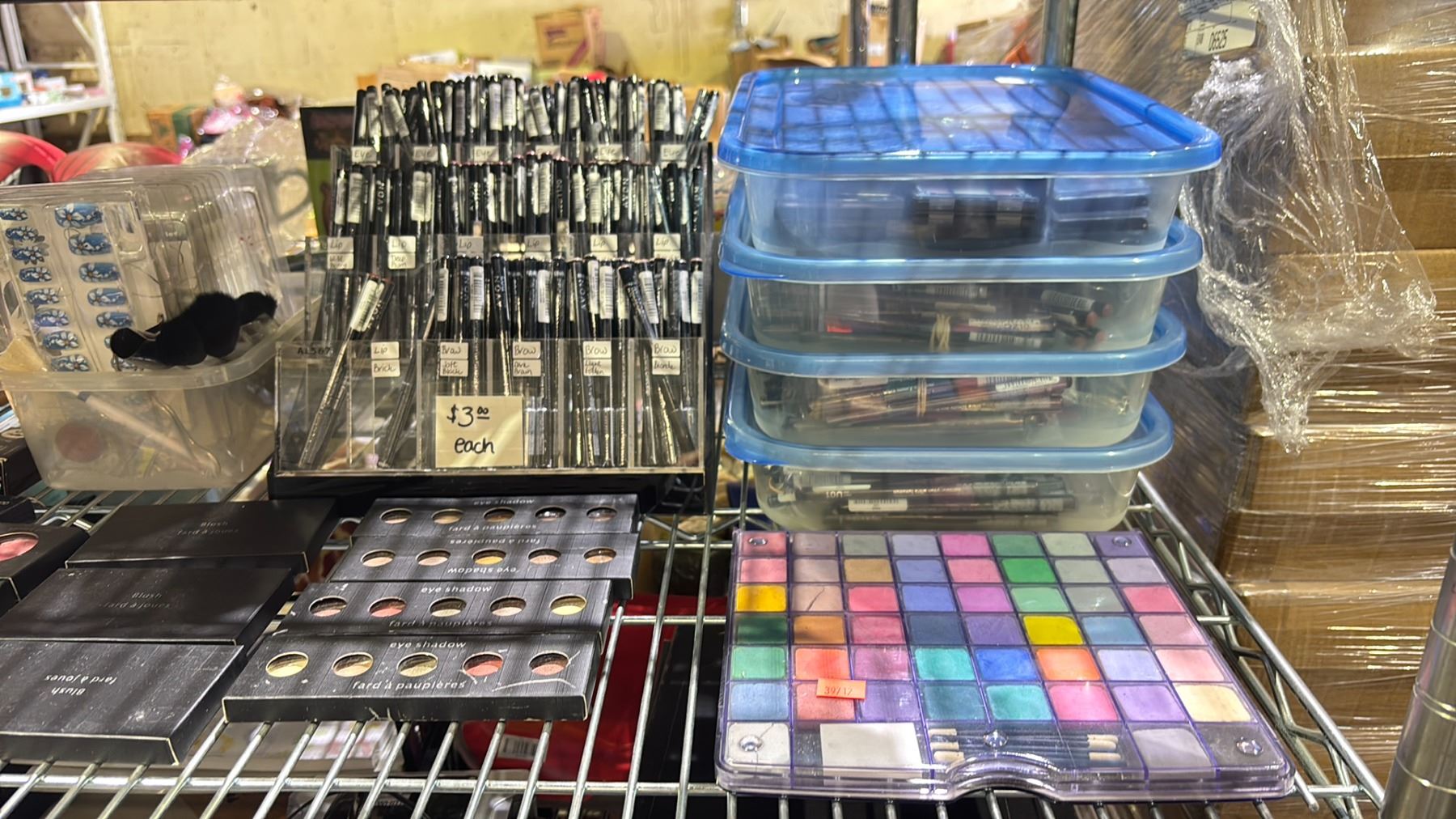 SHELF OF ASSORTED MAKEUP, NAIL SETS, EYELASHES, COMBS & FRAGRANCE OIL