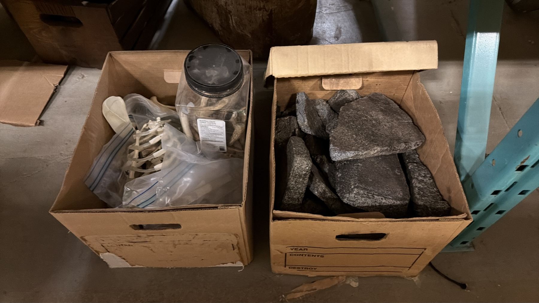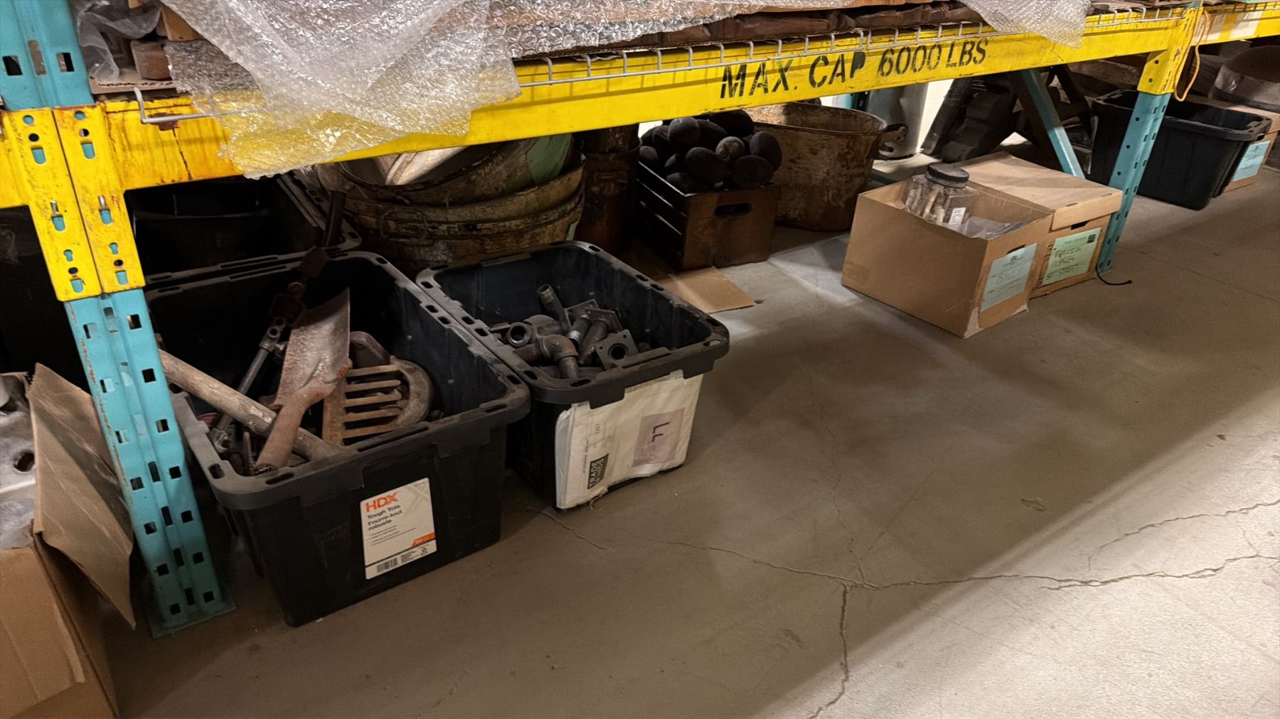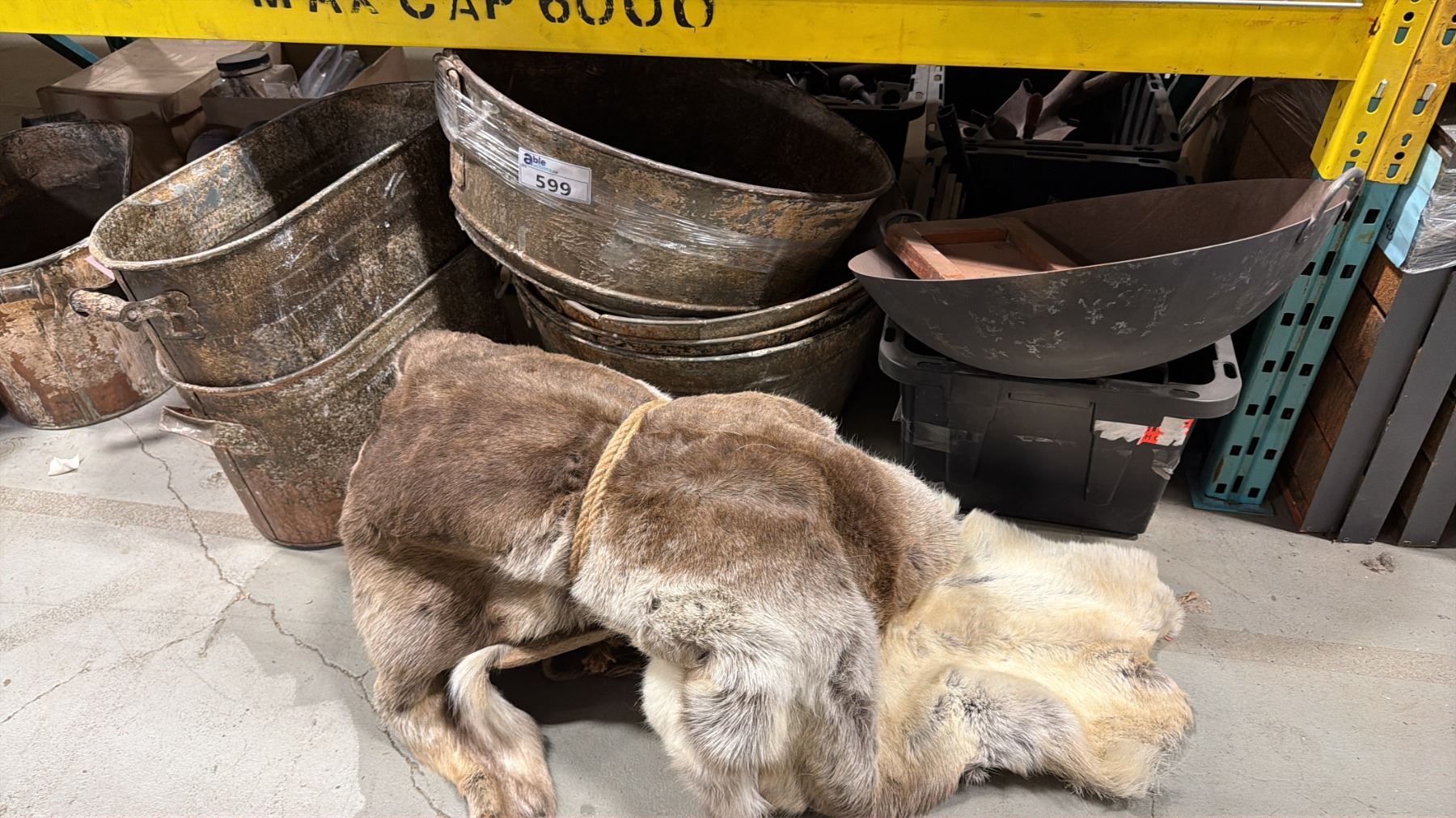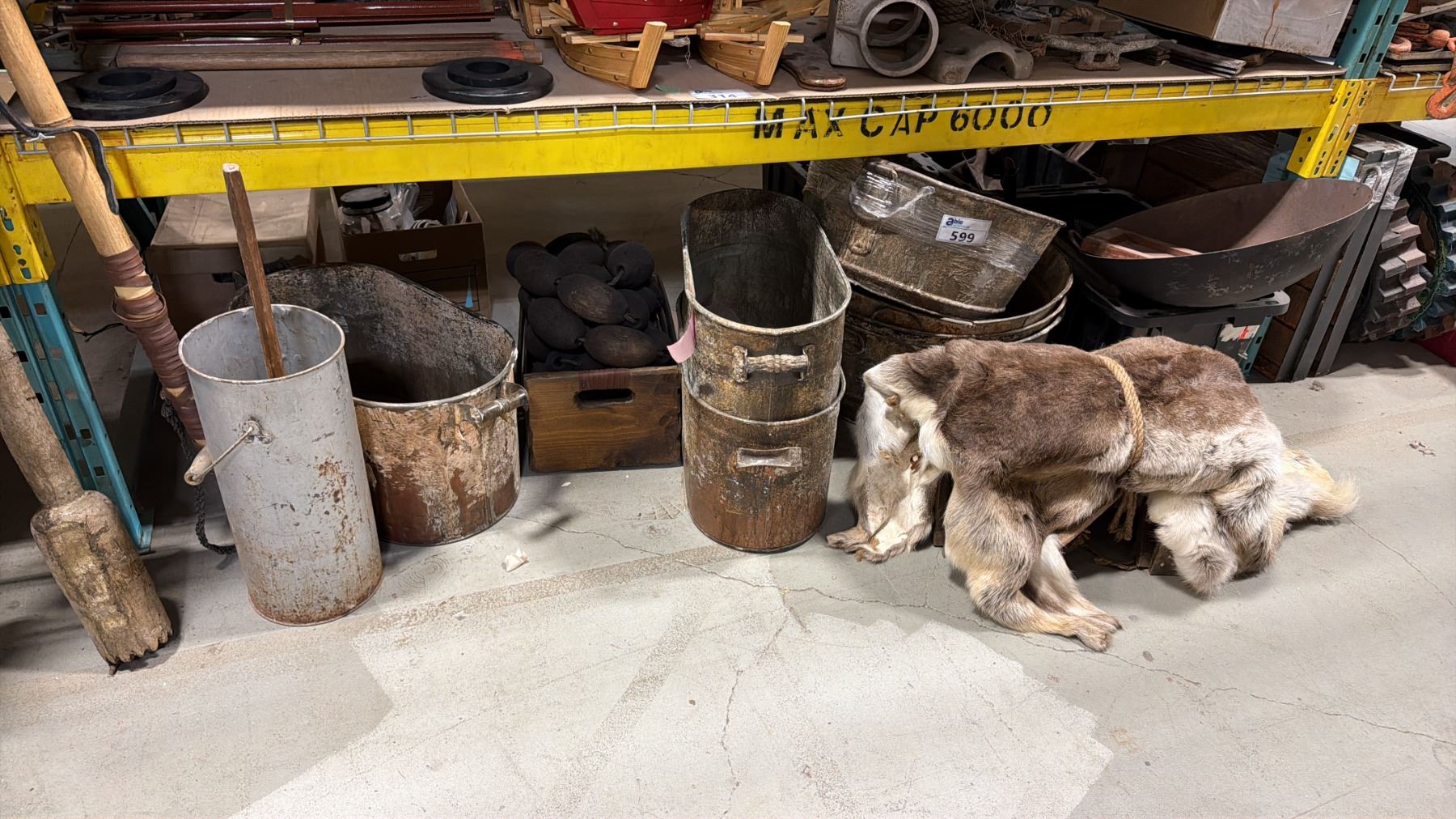 SHELF OF ASSORTED METAL RUSTIC BASINS, ANIMAL PELT, METAL PIPES, PROP BONES & MORE