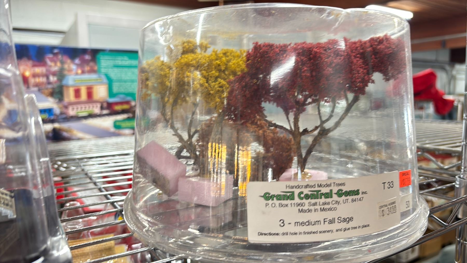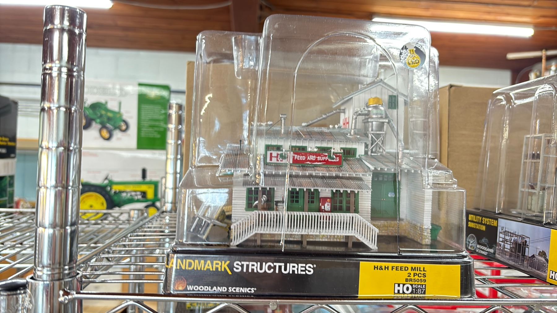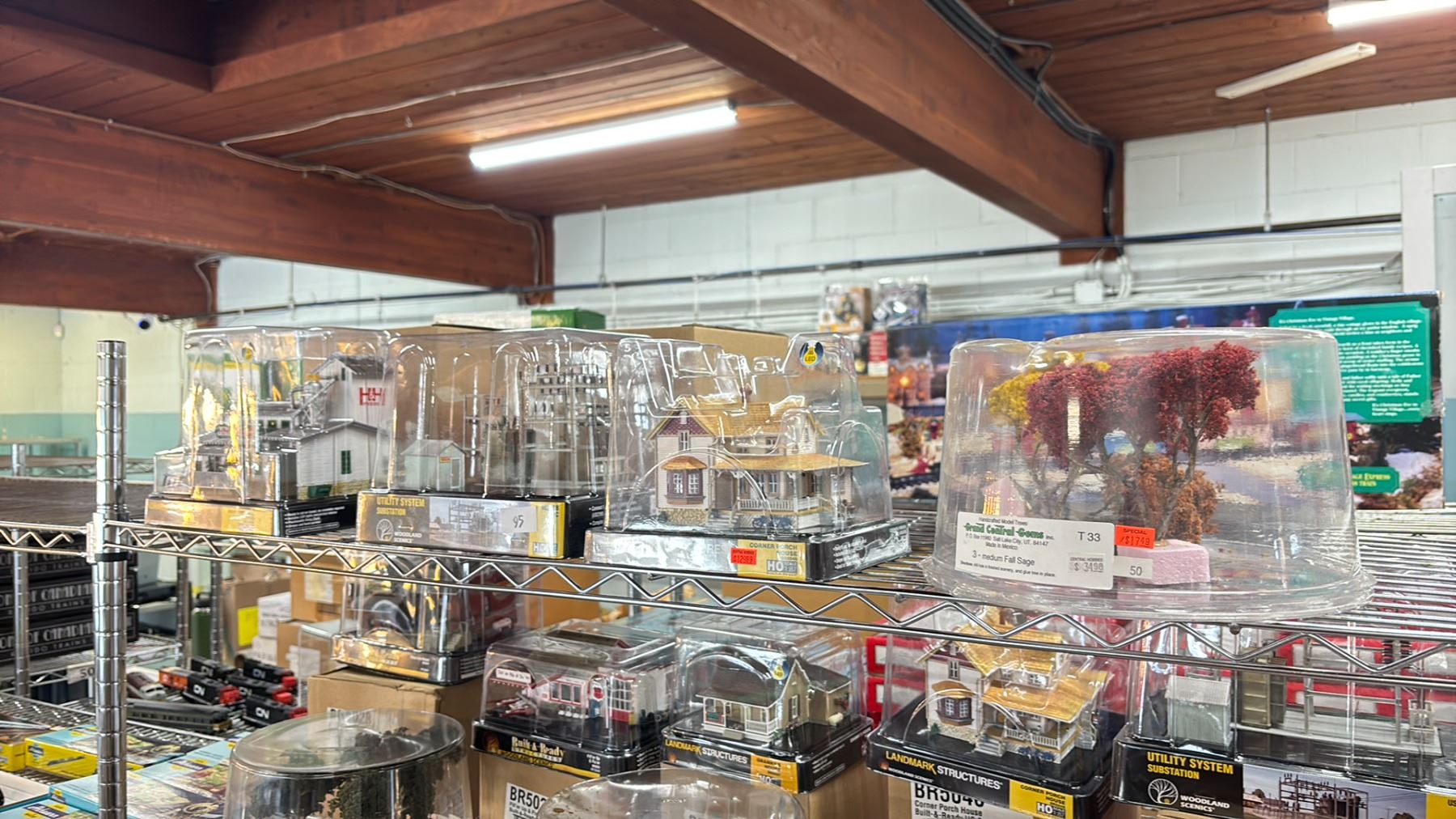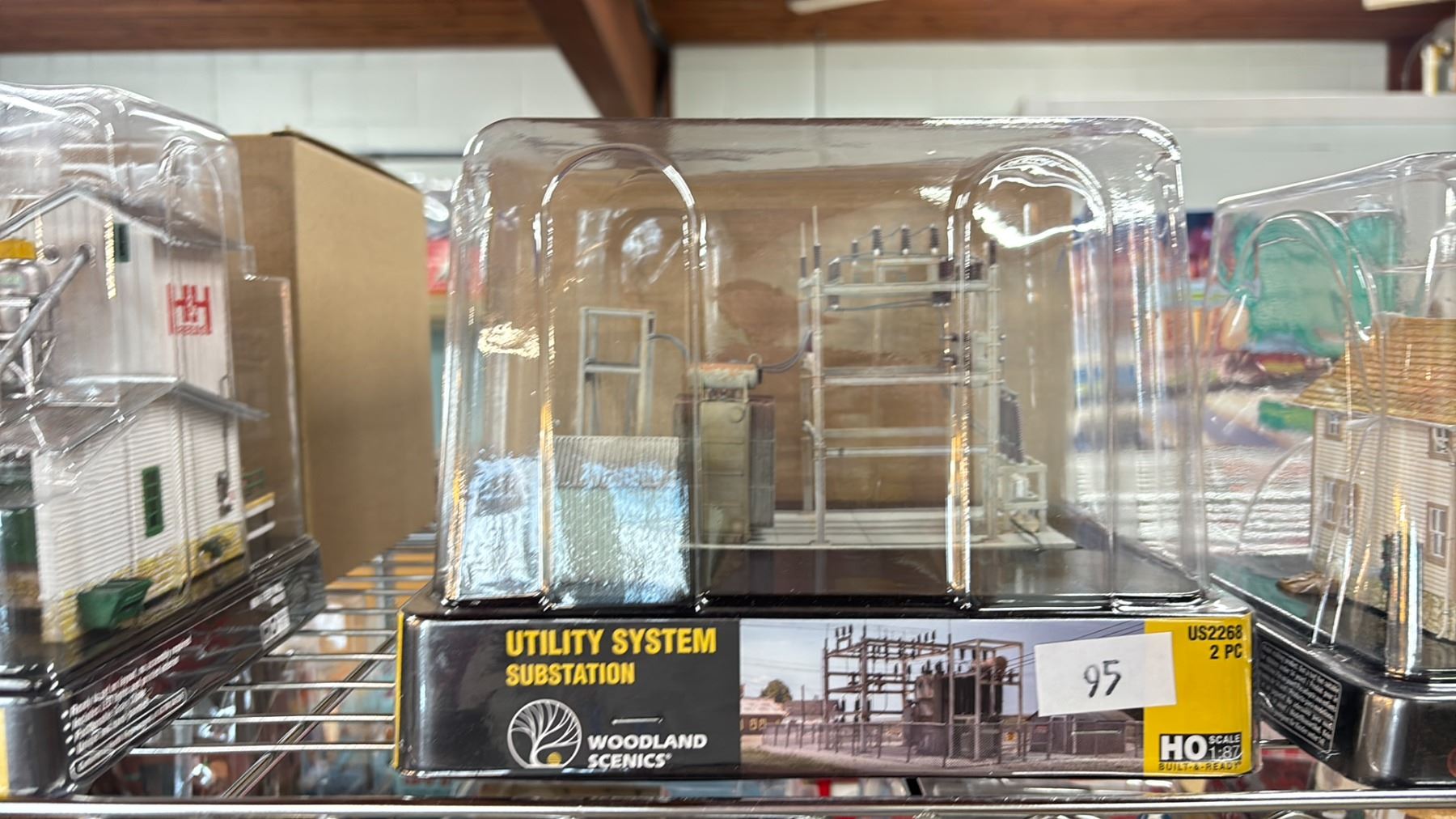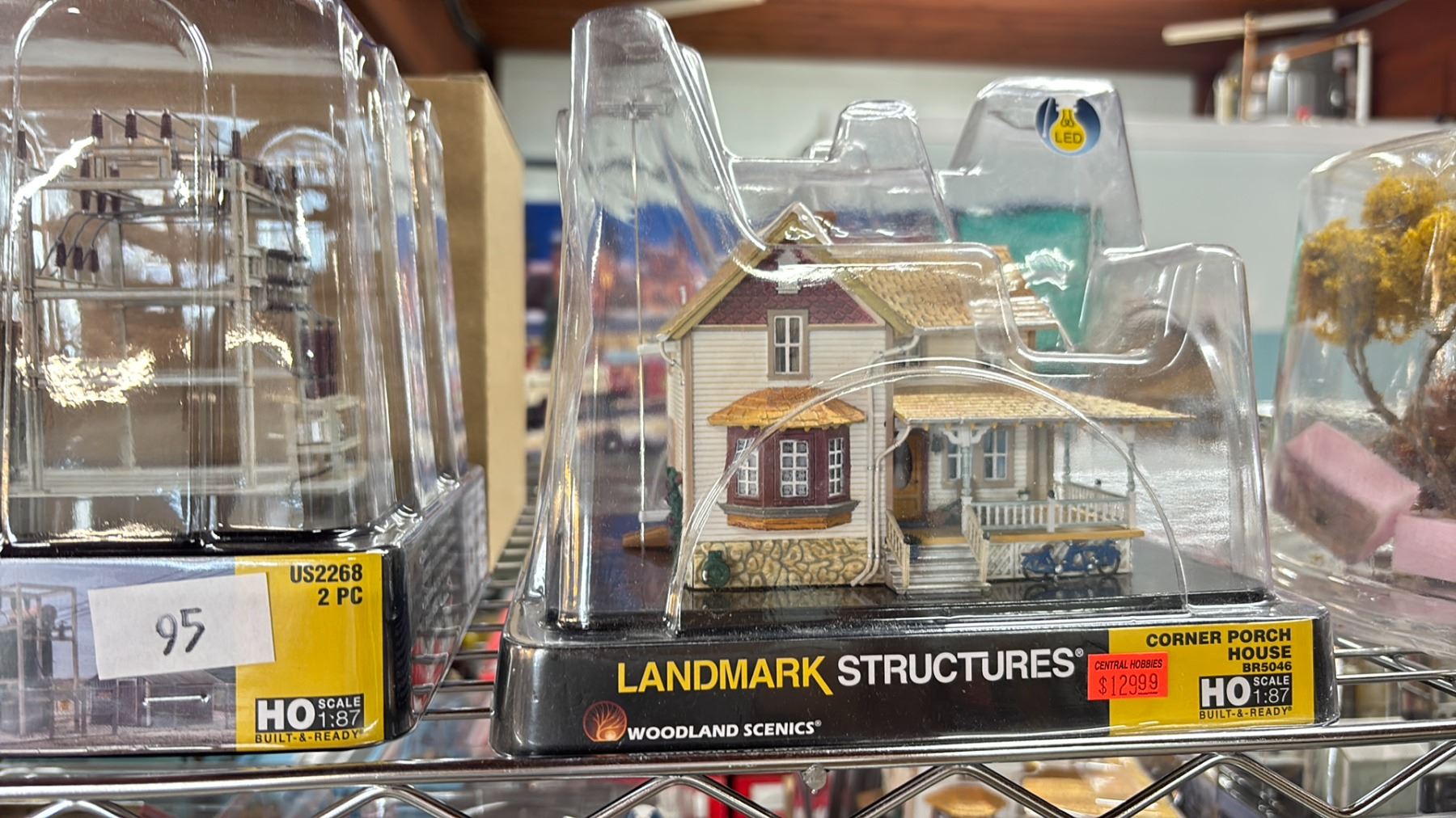 SHELF OF ASSORTED MINIATURE TRAIN SCENIC STRUCTURES