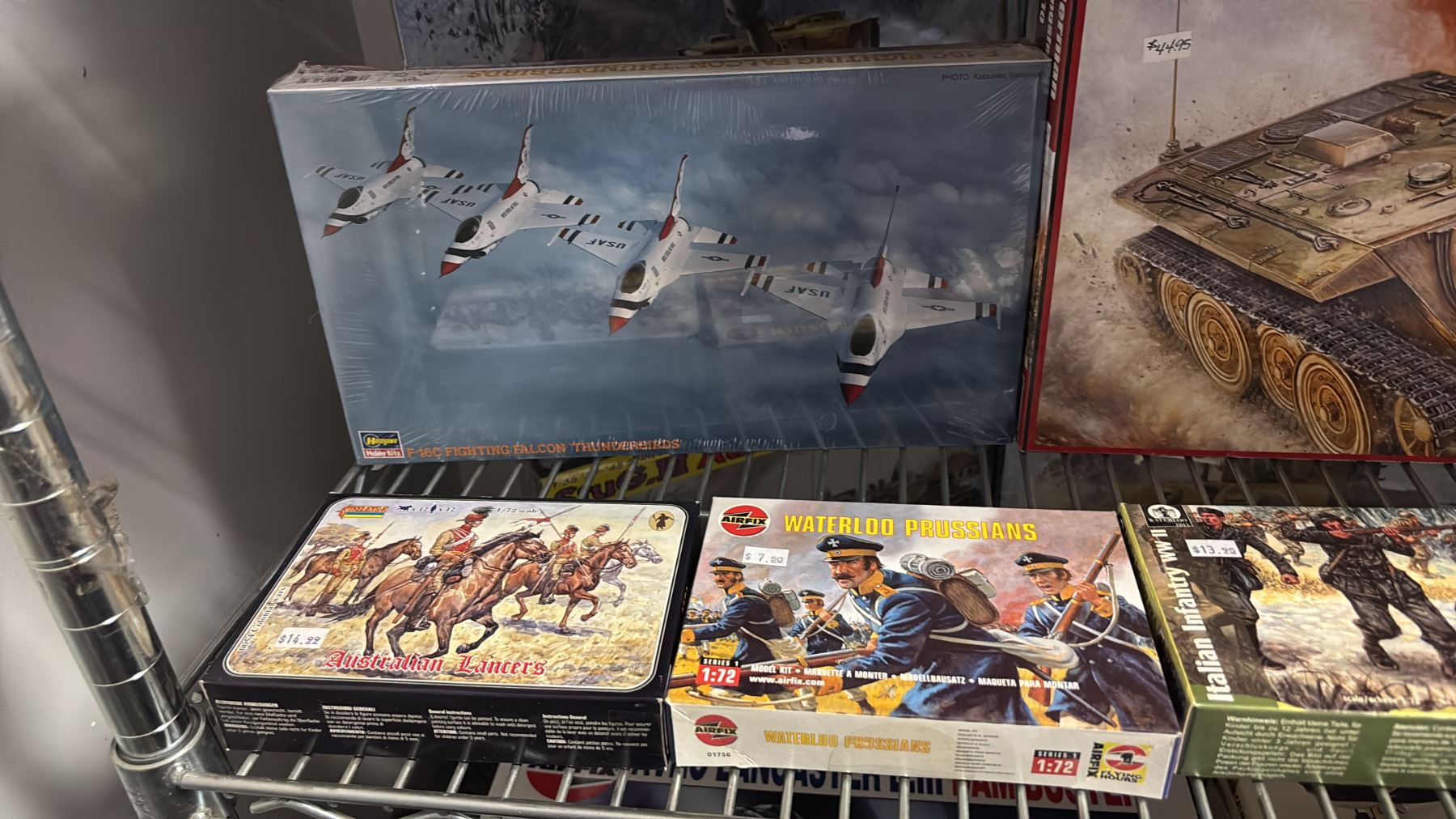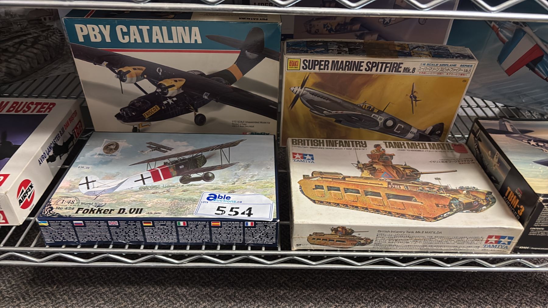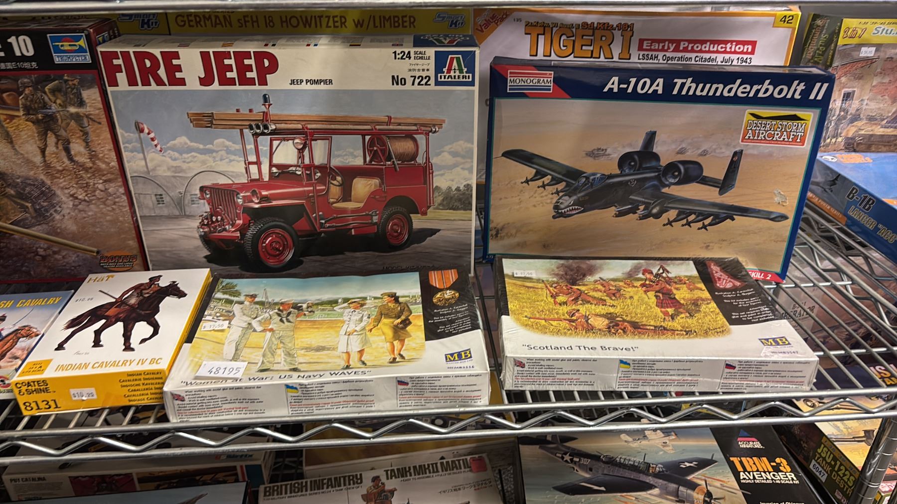 SHELF OF ASSORTED MODEL KITS: AIRPLANE, MILITARY VEHICLES, FIRE JEEP, & ASSORTED FIGURE KITS