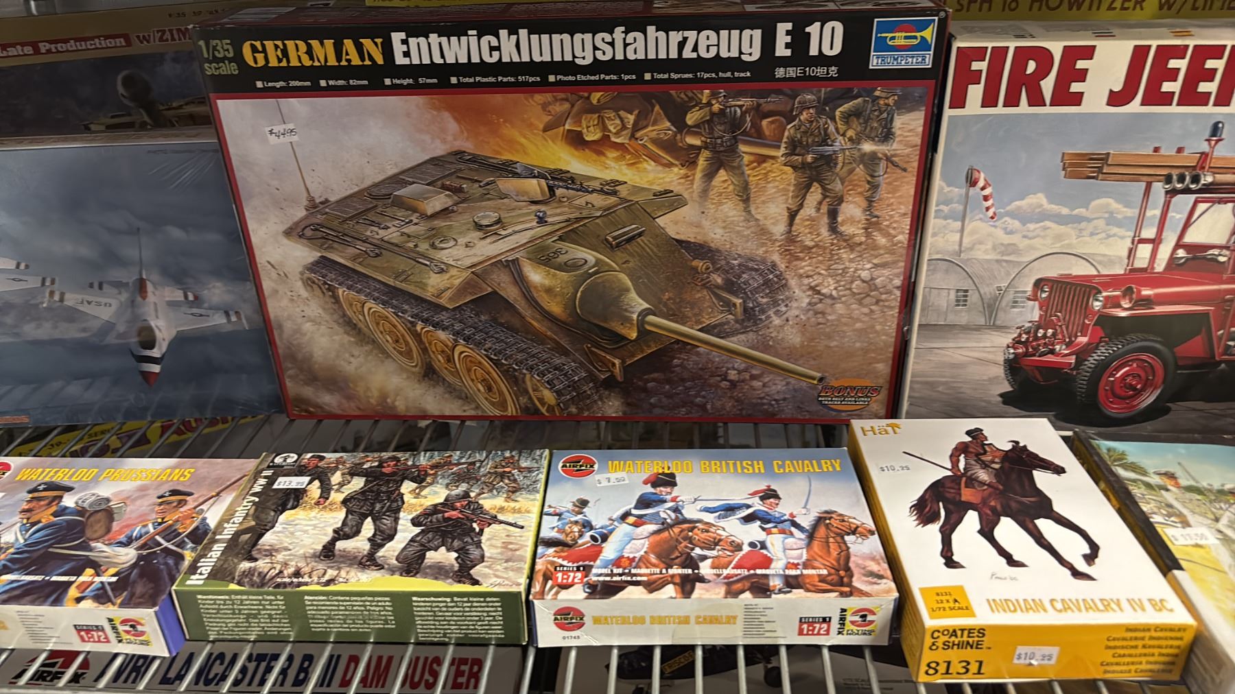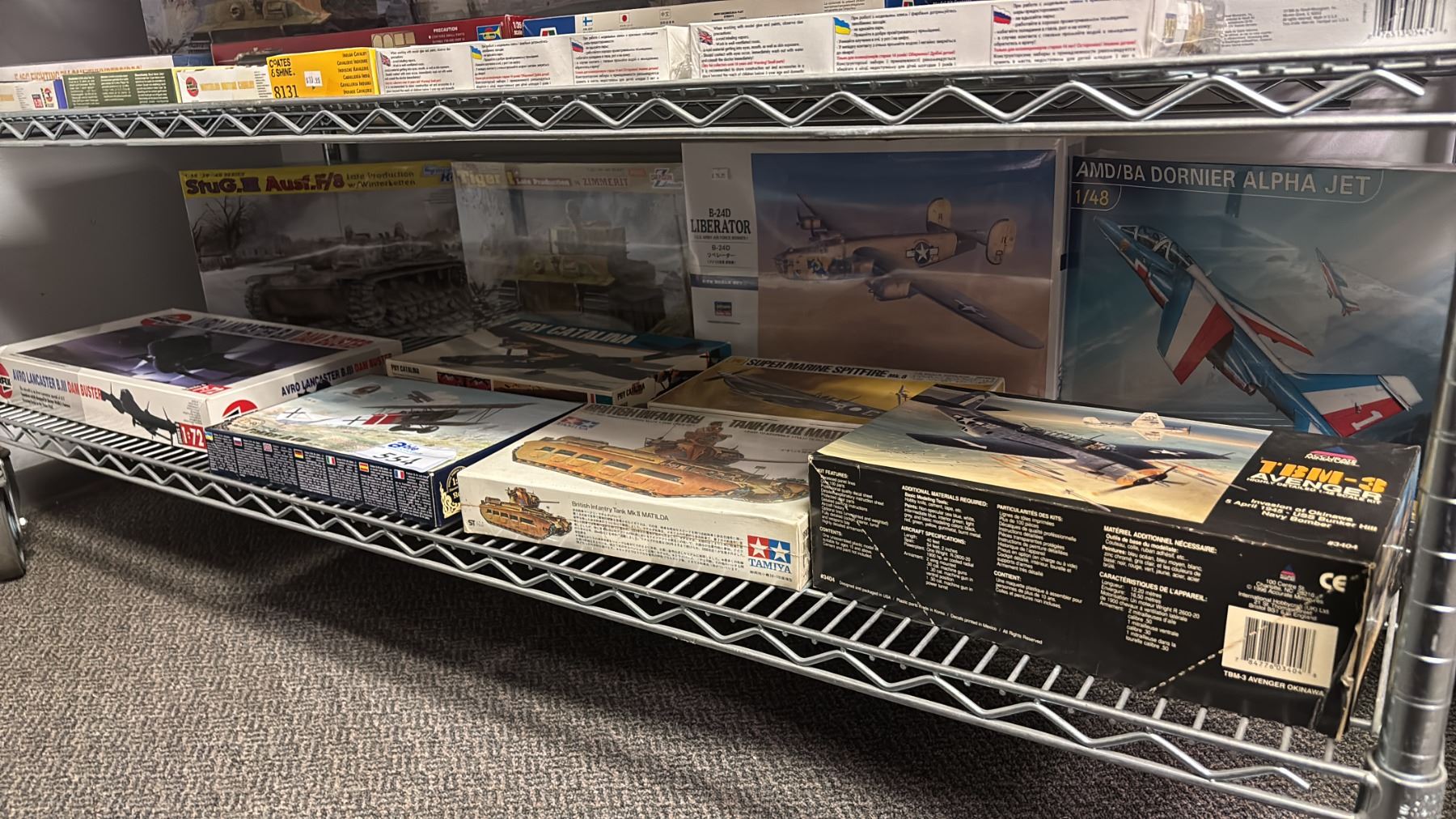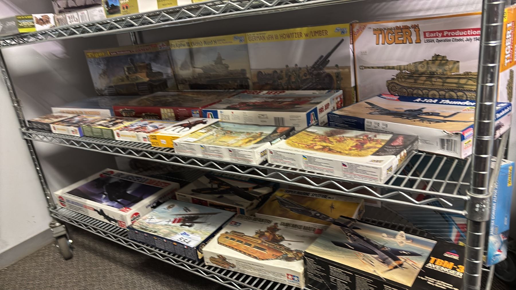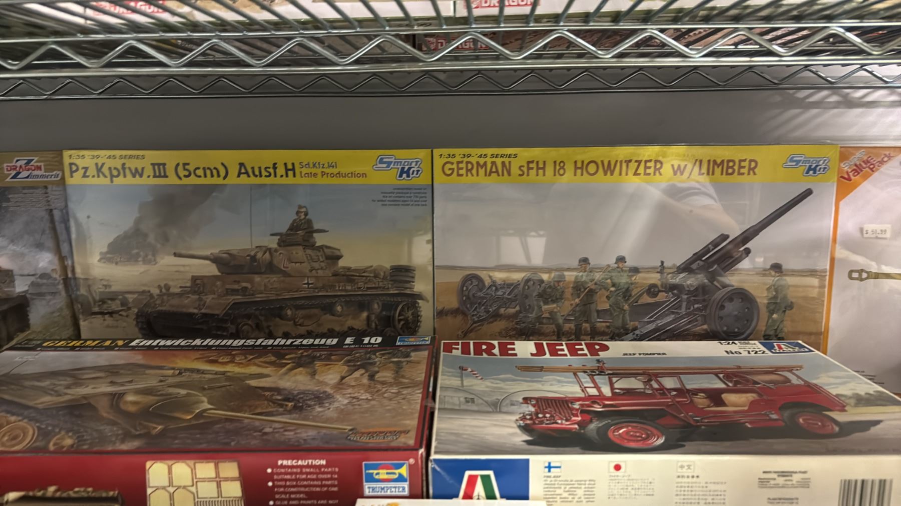 SHELF OF ASSORTED MODEL KITS: AIRPLANE, MILITARY VEHICLES, FIRE JEEP, & ASSORTED FIGURE KITS